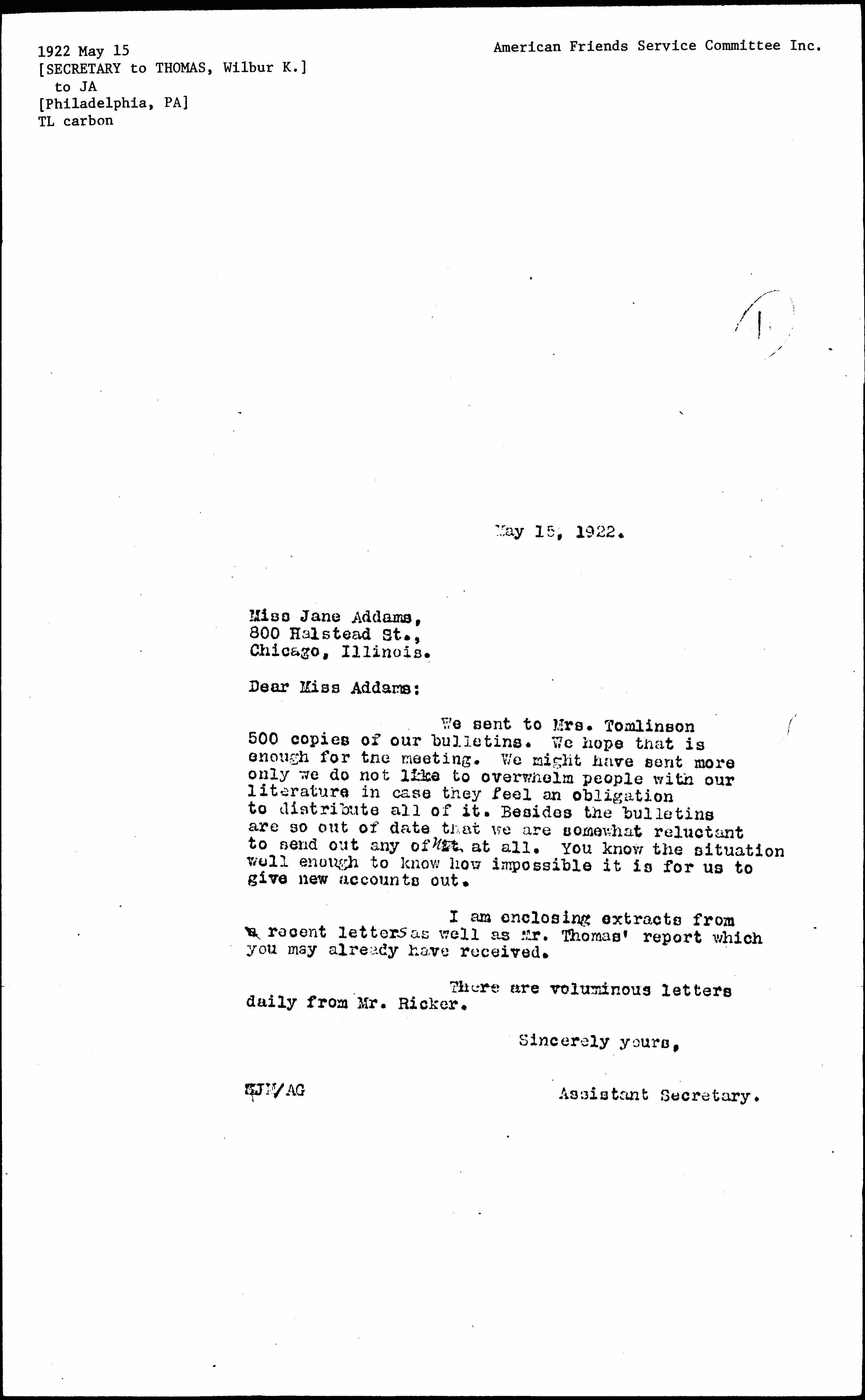 We sent to Mrs. Tomlinson 500 copies of our bulletins. We hope that is enough for the meeting. We might have sent more only we do not like to overwhelm people with our literature in case they feel an obligation to distribute all of it. Besides the bulletins are so out of date that we are somewhat reluctant to send out any of ↑them↓ at all. You know the situation well enough to know how impossible it is for us to give new accounts out.