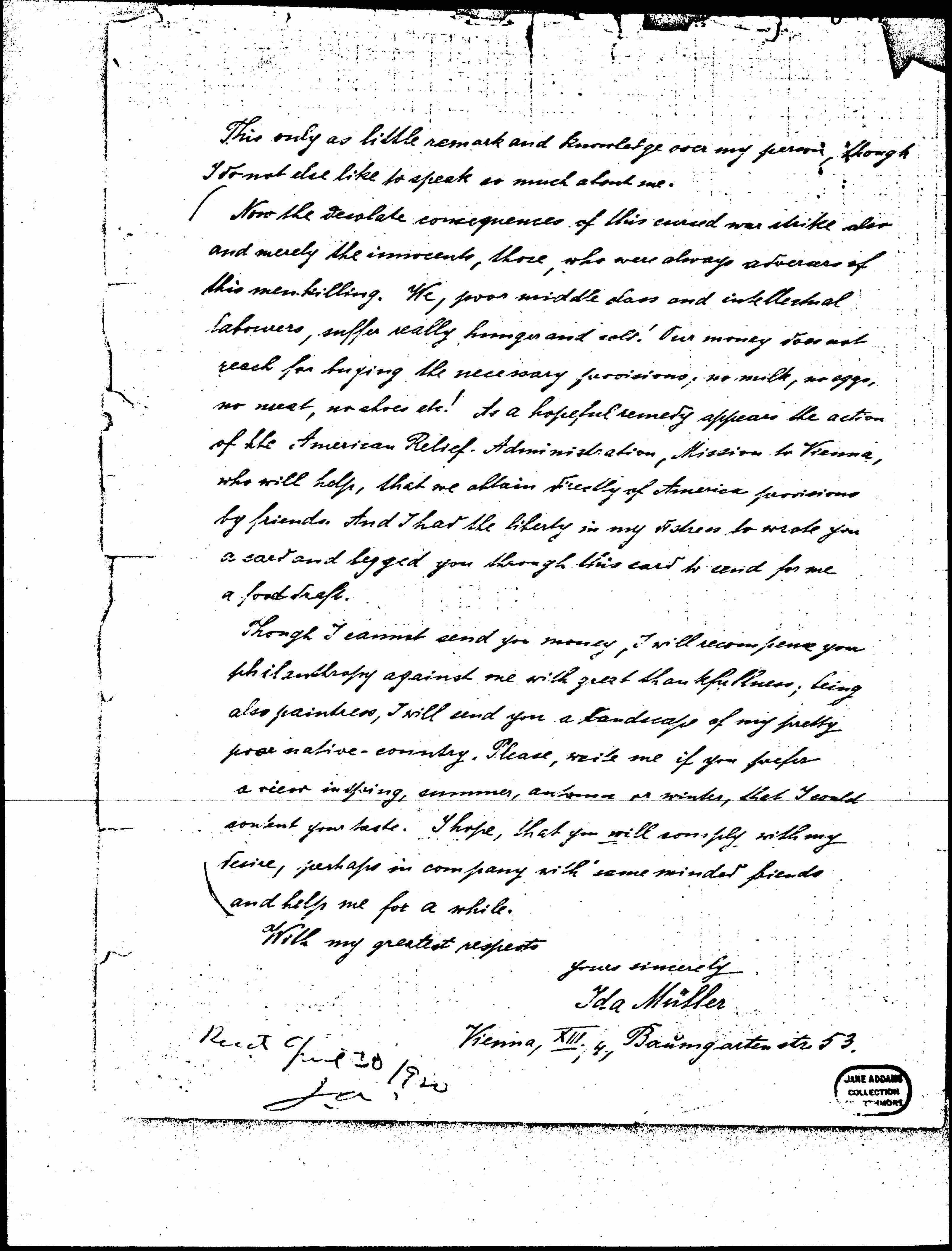 Now the desolate consequences of this cursed war strike also and merely the innocents, those, who were always adverse of this men-killing. We, poor middle class and intellectual [laborers], suffer really hunger and cold! Our money does not reach for buying the necessary provisions, no milk, no eggs, no meat, no shoes etc! To a hopeful remedy appears the action of the American Relief Administration, Mission to Vienna, who will help, that we obtain [directly?] of America provisions by friends. And I had the liberty in my [distress] to write you a card and begged you through this card to send for me a food draft.