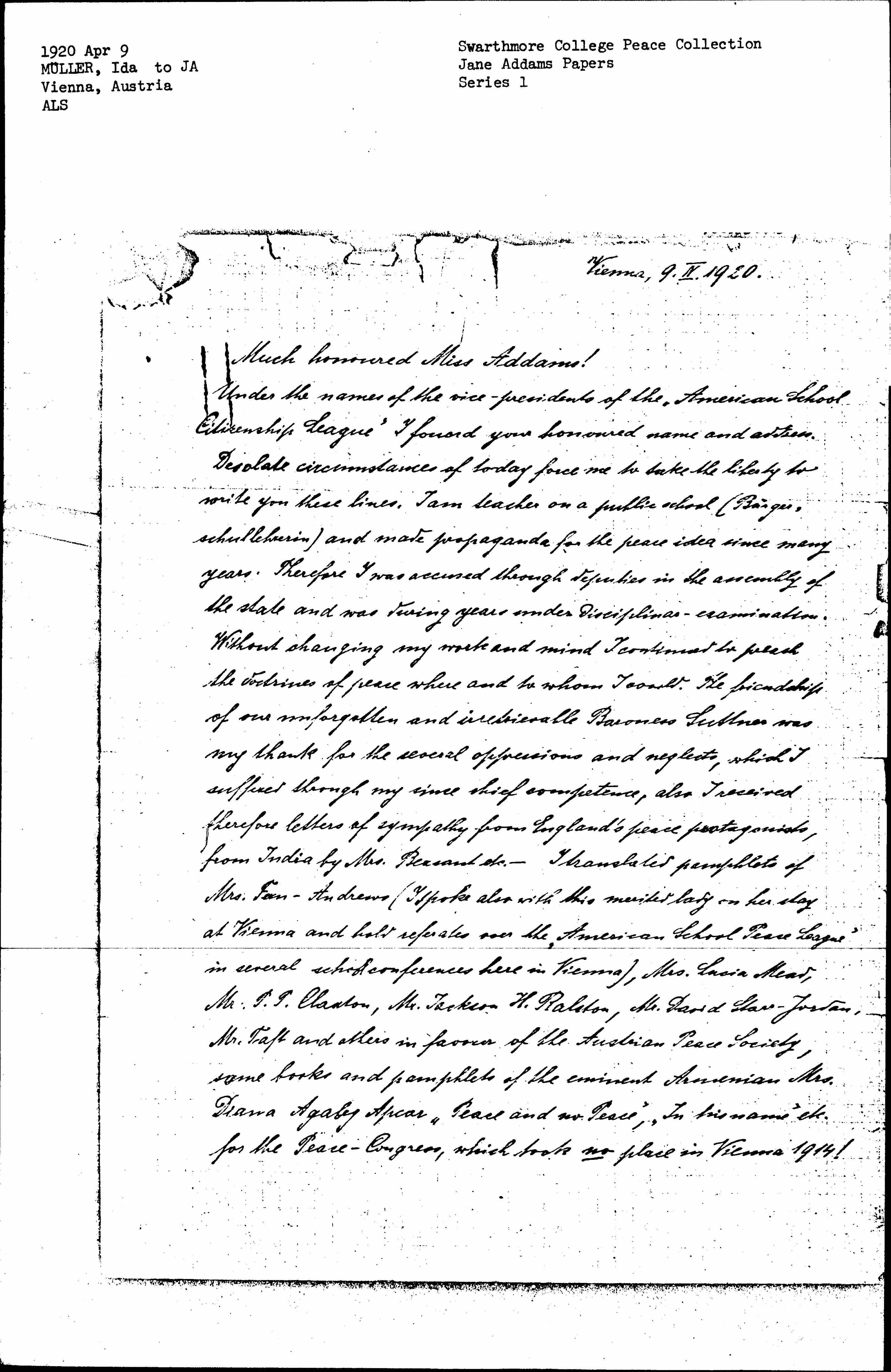 Under the names of the vice-presidents of the "American School Citizenship League" I found your [honored] name and address. Desolate circumstances of today force me to take the liberty to write you these lines. I am teacher on a public school (Bürger, schulleherin) and made propaganda for the peace idea since many years. Therefore I was accused through deputies in the assembly of the state and was serving years under Disciplinas-examination. Without changing my work and mind I continued to preach the doctrines of peace where and to whom I could. The friendship of our unforgotten and [irretrievable?] Baroness Suttner was my thank for the social oppressions and neglect, which I suffered through [very since chief competence?], also I received therefore letters of sympathy from England’s peace protagonists, from India by Mrs. [Besant] etc. -- Translated pamphlets of Mrs Fern-Andrews (I spoke also with this merited lady on her stay at Vienna and [held referates] over the "American School Peace League" in several school conferences here in Vienna), Mrs. Lucia Mead, Mr. T. T Clanton, Mr. Jackson H. Ralston, Mr. David Starr-Jordan, Mr. Taft and others in [favor] of the Austrian Peace Society, some books and pamphlets of the eminent Armenian Mrs. Diana Agabeg Apcar “Peace and no Peace,” “In his name” etc. for the Peace-Congress, which took no place in Vienna 1914! [page 2] This only as little remark and knowledge over my person, though I do not [else] like to speak so much about me.