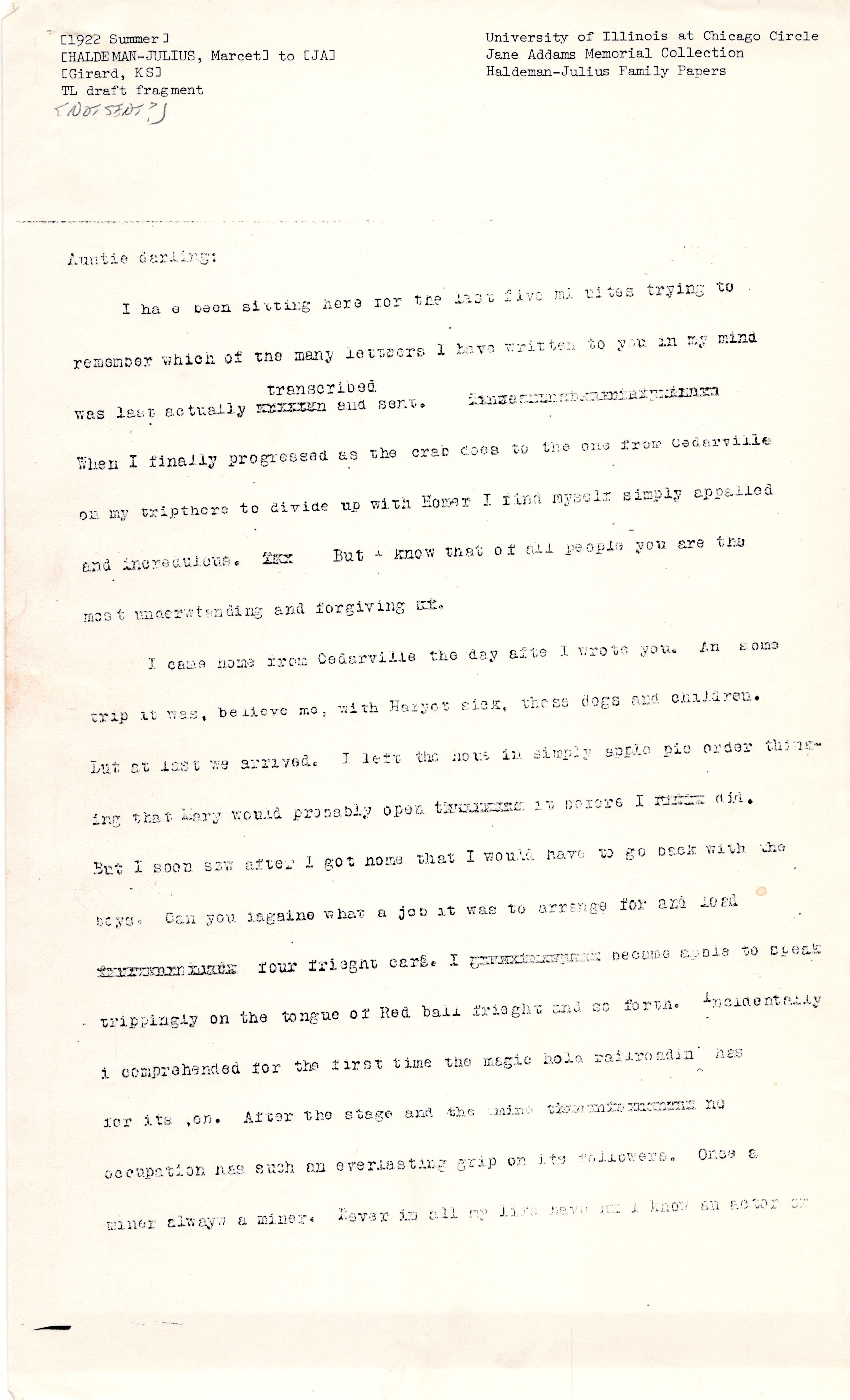 I have been sitting here for the last five minutes trying to remember which of the many letters I have written to you in my mind was actually [illegible] ↑transcribed↓ and sent. [illegible] When I finally progressed as the crab does to the one from Cedarville on my trip there to divide up with Homer I find myself simply appalled and incredulous. But I know that of all people you are the most understanding and forgiving [illegible].