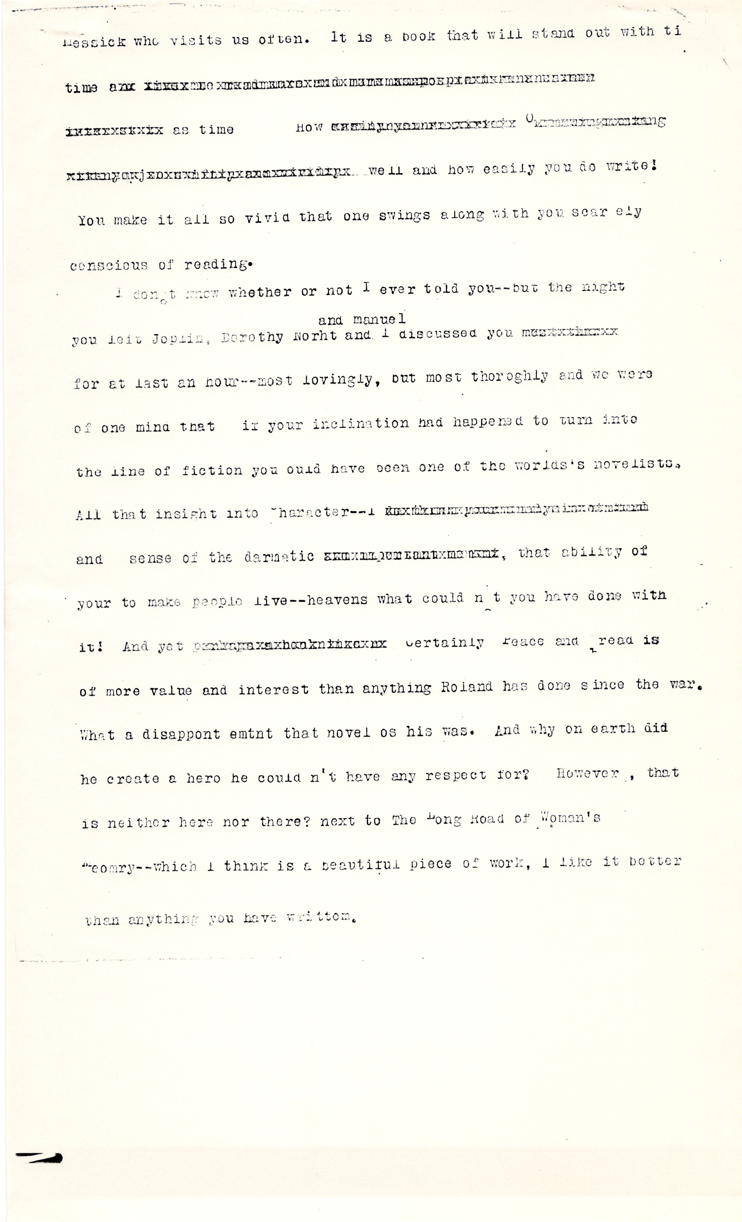 I don't know whether or not I ever told you -- but the night you left Joplin, Dorothy North ↑and Manuel↓ and I discussed you [illegible] for at [least] an hour -- most lovingly, but most [thoroughly] and we were of one mind that if your inclination had happened to turn into the line of fiction you [could] have been one of the world's novelists. All that insight into character -- [illegible] and sense of the dramatic [illegible], that ability of [yours] to make people live -- heavens what could not you have done with it! And yet [illegible] certainly Peace and Bread is of more value and interest than anything Roland has done since the war. What a disappointment that novel [of] his was. And why on Earth did he create a hero he couldn't have any respect for? However, that is neither here nor there? Next to the Long Road of Woman's Memory -- which I think is a beautiful piece of work, I like it better than anything you have written. [page 4]