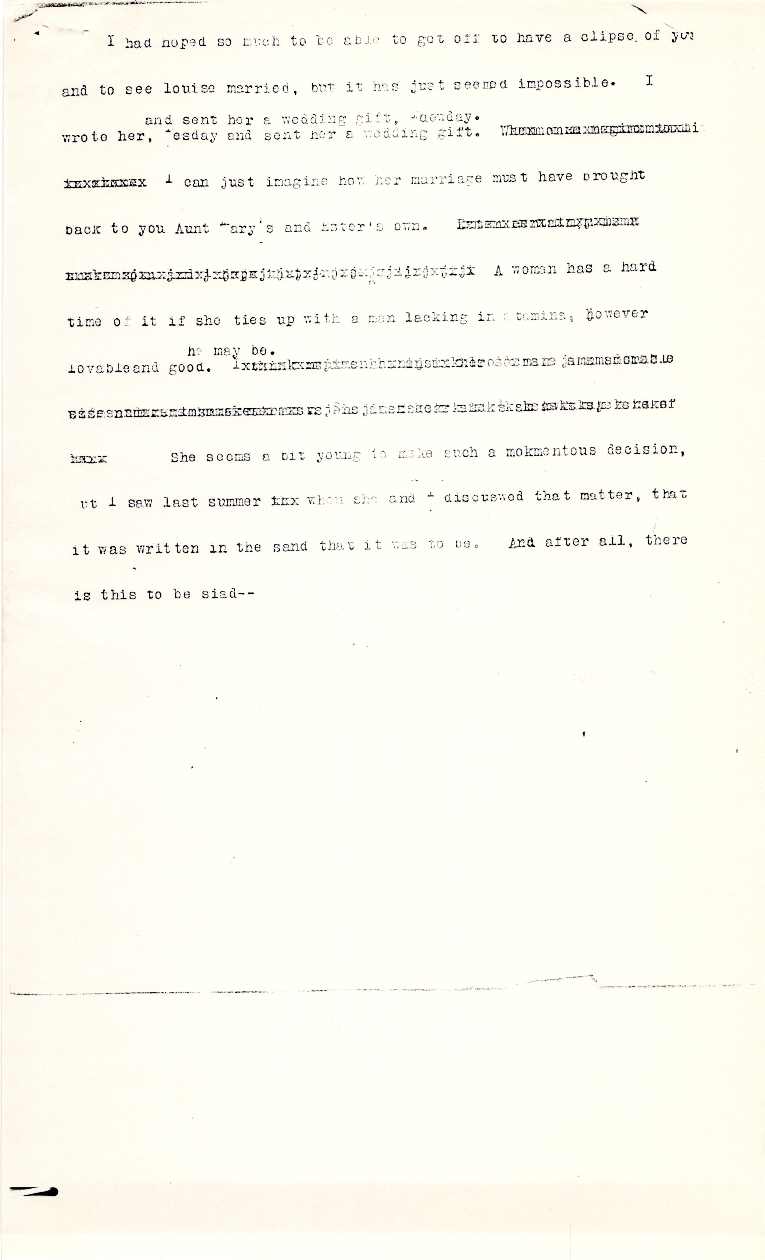 I had hoped so much to be able to get off to have a [glimpse] of you and to see Louise married, but it has just seemed impossible. I wrote her [Tuesday and sent her a wedding gift]. [illegible] I can just imagine how her marriage must have brought back to you Aunt Mary's and [Esther's] own. [illegible] A woman has a hard time of it if she ties up with a man lacking in stamina, however lovable and good ↑he may be.↓ [illegible] She seems a bit young to make such a momentous decision, [but] I saw last summer [illegible] when she and I discussed that matter, that it was written in the sand that it was to be. And after all, there is this to be said -- [page(s) missing?]
