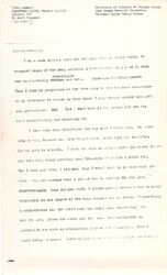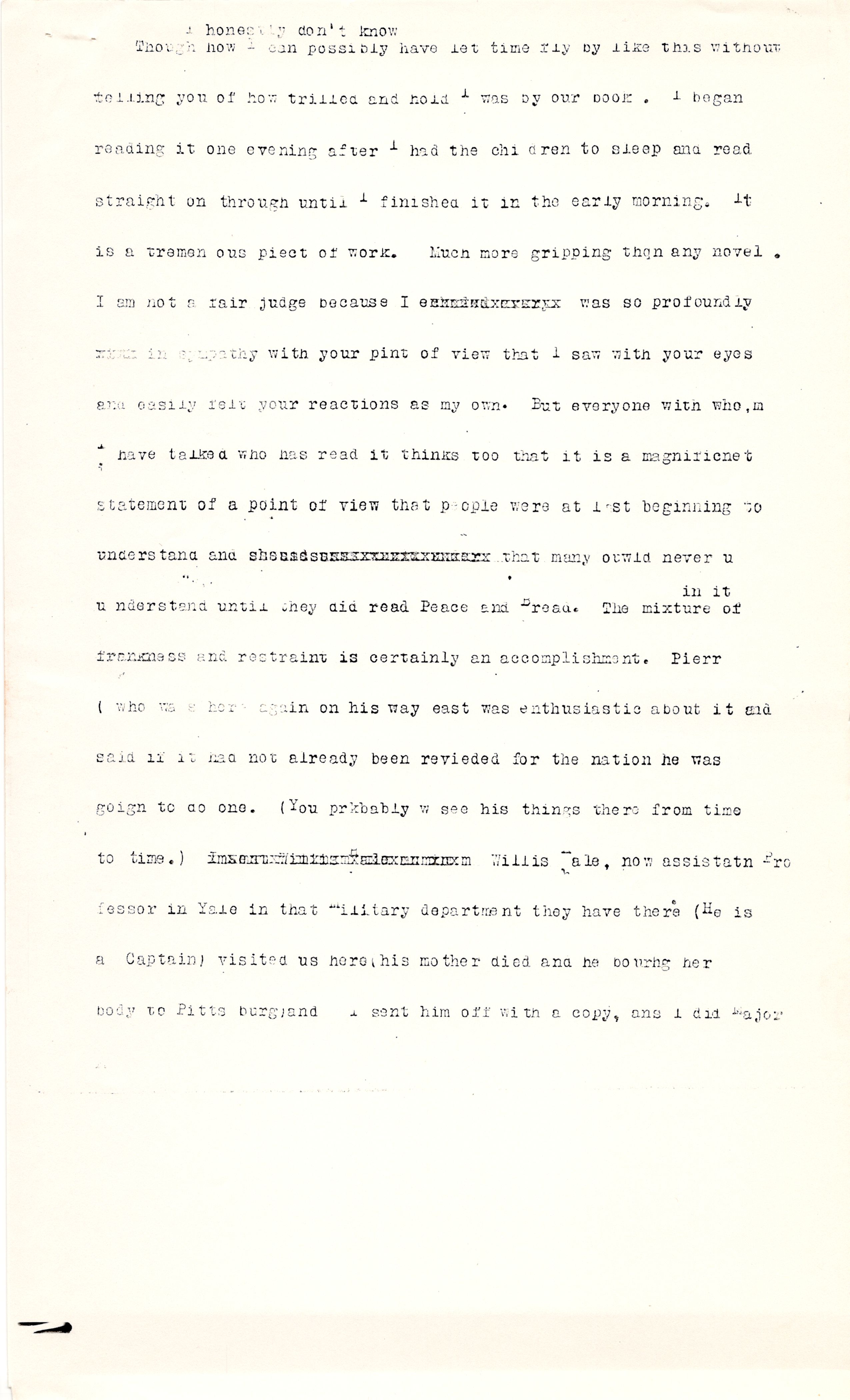 Though ↑I honestly don't know↓ how I can possibly have let time fly by like this without telling you of how thrilled and [hold?] I was by [your] book. I began reading it one evening after I had the children to sleep and read straight on through until I finished it in the early morning. It is a tremendous [piece] of work. Much more gripping than any novel. I am not a fair judge because I [illegible] was so profoundly [illegible] in sympathy with your [point] of view that I saw with your eyes and easily felt your reactions as my own. But everyone with whom I have talked who has read it thinks too that it is a magnificent statement of a point of view that people were at last beginning to understand and [illegible] that many would never understand until they did read Peace and Bread. The mixture ↑in it↓ of frankness and restraint is certainly an accomplishment. [Pierre] (who was here again on his way east was enthusiastic about it and said if it had not already been [reviewed] for the Nation he was going to do one. (You probably [will?] see his things there from time to time.) [illegible] Willis [Hale], now assistant Professor in Yale in that Military department they have there (He is a Captain) visited us here (his mother died and he [brought?] her body to Pittsburg and I sent him off with a copy, and I did Major [page 3] Messick who visits us often. It is a book that will stand out with time [illegible] as time. How [illegible] well and how easily you do write! You make it all so vivid that one swings along with you scarcely conscious of reading.