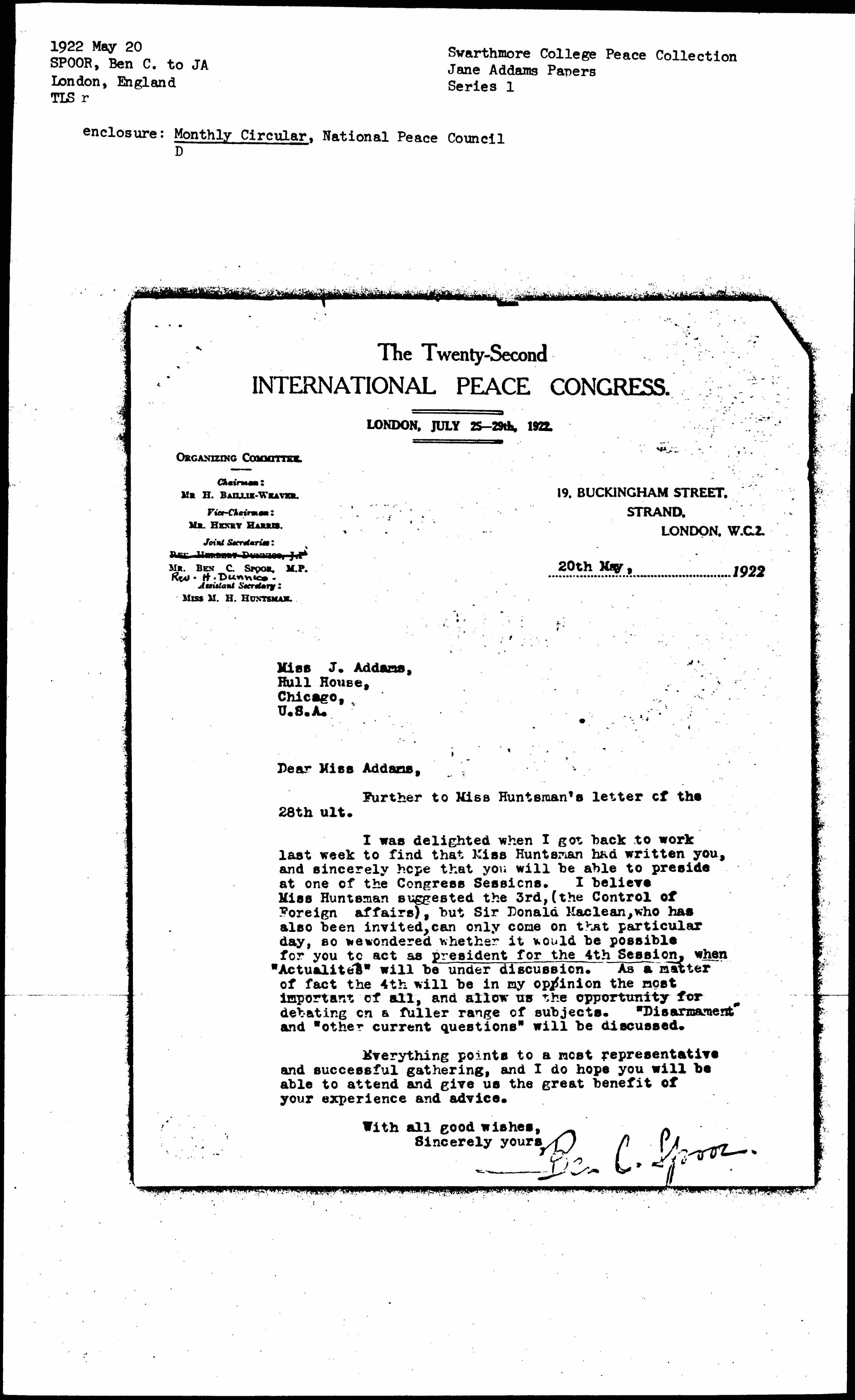 I was delighted when I got back to work last week to find that Miss Huntsman had written you, and sincerely hope that you will be able to preside at one of the Congress Sessions. I believe Miss Huntsman suggested the 3rd, (the Control of Foreign Affairs), but Sir Donald Maclean, who has also been invited, can only come on that particular day, so we wondered whether it would be possible for you to act as president for the 4th Session, when "Actualités" will be under discussion. As a matter of fact the 4th will be in my opinion the most important of all, and allow us the opportunity for debating on a fuller range of subjects. "Disarmament" and "other current questions" will be discussed.