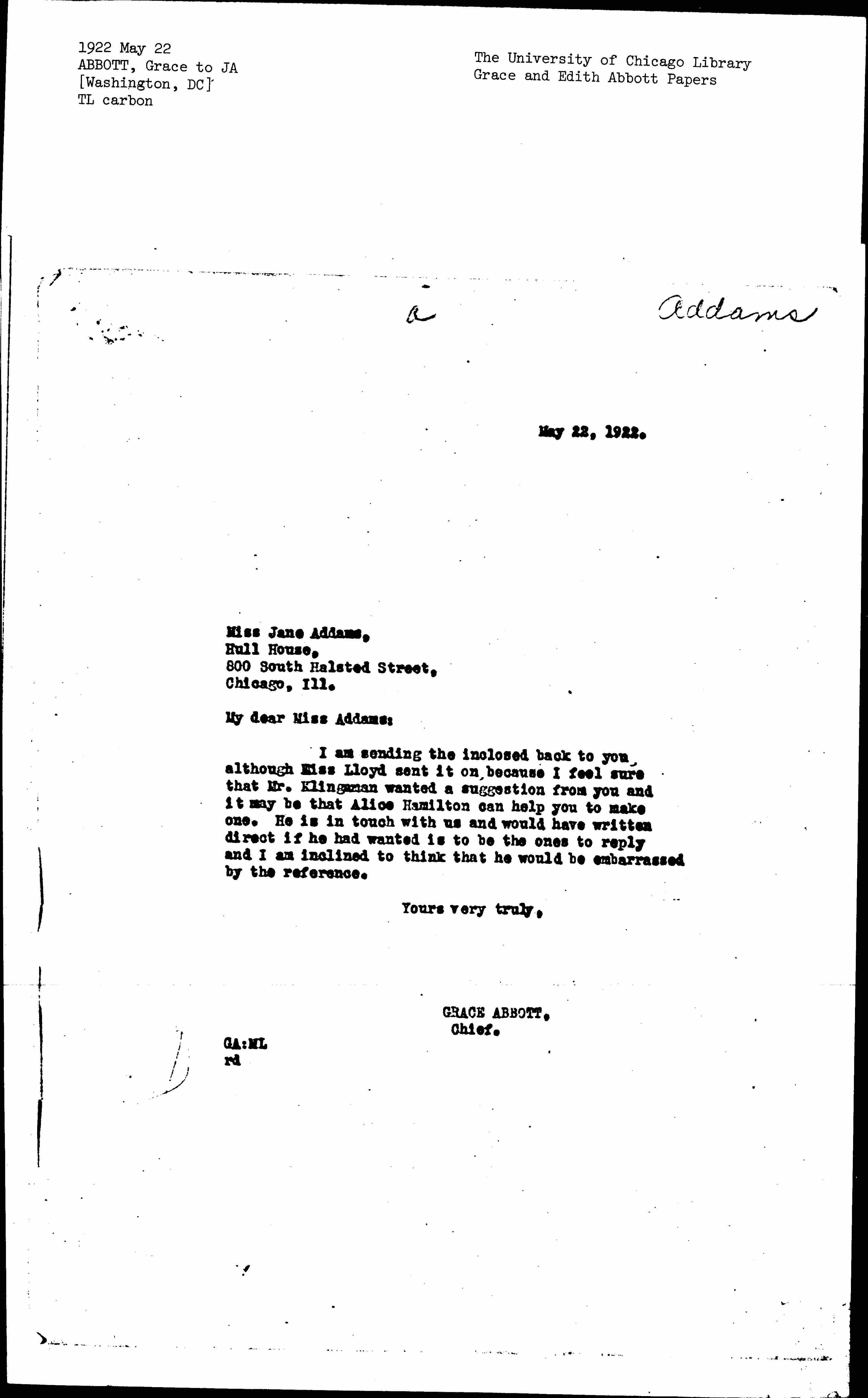 I am sending the [enclosed] back to you, although Miss Lloyd sent it on because I feel sure that Mr. Klingaman wanted a suggestion from you and it may be that Alice Hamilton can help you to make one. He is in touch with us and would have written direct if he had wanted us to be the ones to reply and I am inclined to think that he would be embarrassed by the reference.