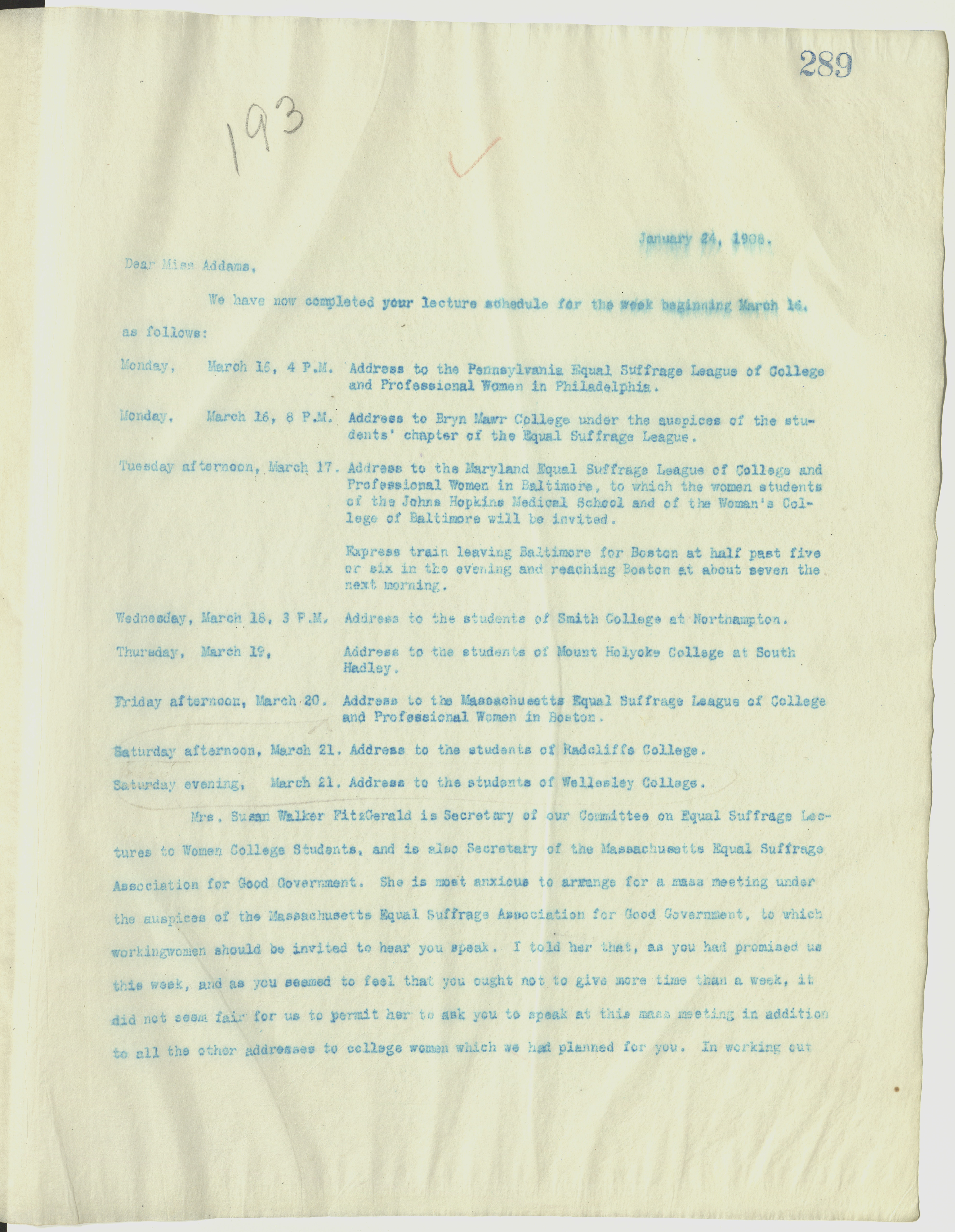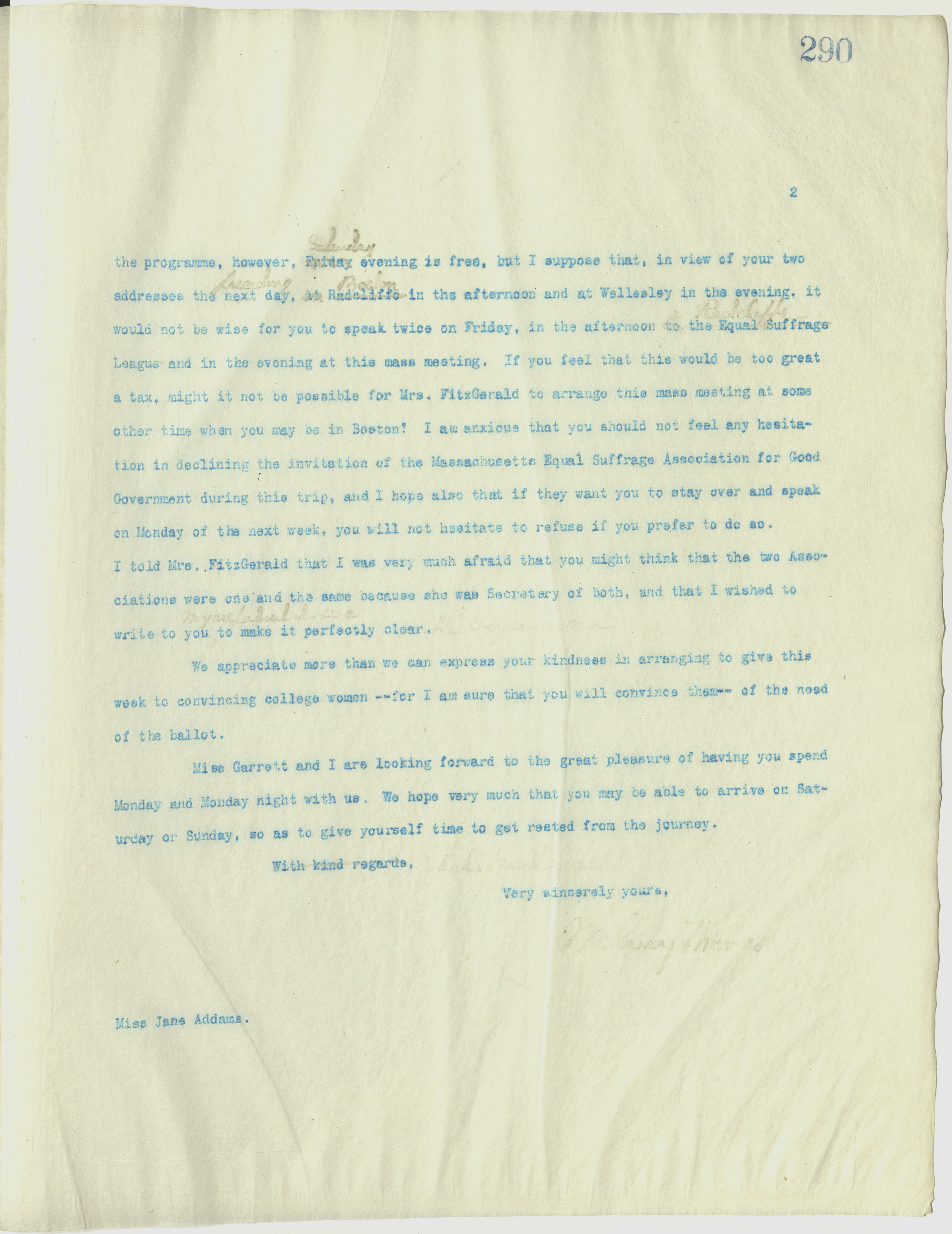 Mrs. Susan Walker FitzGerald is Secretary of our Committee of Equal Suffrage lectures to Women College Students, and is also Secretary of the Massachusetts Equal Suffrage Association for Good Government. She is most anxious to arrange for a mass meeting under the auspices of the Massachusetts Equal Suffrage Association for Good Government, to which workingwomen should be invited to hear you speak. I told her that, as you had promised us this week, and as you seemed to feel that you ought not to give [more] time than a week, it did not seem fair for us to permit her to ask you to speak at this mass meeting in addition to all the other addresses to college women which we had planned for you. In working out [page 2] the programme, however, Friday ↑Saturday↓ evening is free, but I suppose that, in view of your two addresses the next ↑preceeding↓ day, at Radcliffe ↑Boston↓ in the afternoon and at Wellesley in the evening, it would not be wise for you to speak twice on Friday, in the afternoon to ↑at↓ the ↑Radcliffe↓ Equal Suffrage League and in the evening at this mass meeting. If you feel that this would be too great a tax, might it not be possible for Mrs. FitzGerald to arrange the mass meeting at some other time when you may be in Boston? I am anxious that you should not feel any hesitation in declining the invitation of the Massachusetts Equal Suffrage Association for Good Government during this trip, and I hope also that if they want you to stay over and speak on Monday of the next week you will not hesitate to refuse if you prefer to do so. I told Mrs. FitzGerald that I was very much afraid that you might think that the two Associations were one and the same because she was Secretary of both, and that I wished to write to you ↑myself about it so as↓ to make it perfectly clear ↑that they were not↓.