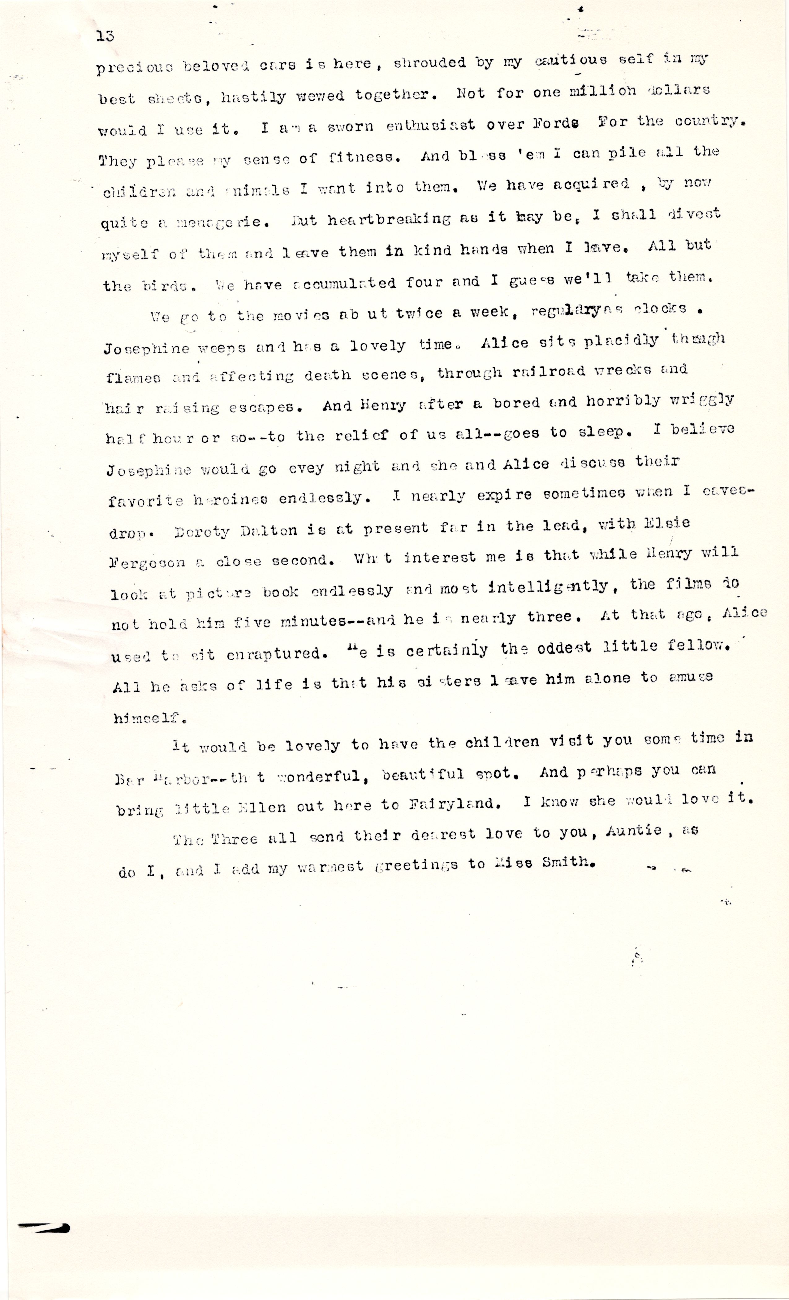 It would be lovely to have the children visit you some time in Bar Harbor -- that wonderful, beautiful spot. And perhaps you can bring little Ellen out here to Fairyland. I know she would love it. The Three all send their dearest love to you, Auntie, as do I, and I add my warmest greetings to Miss Smith.