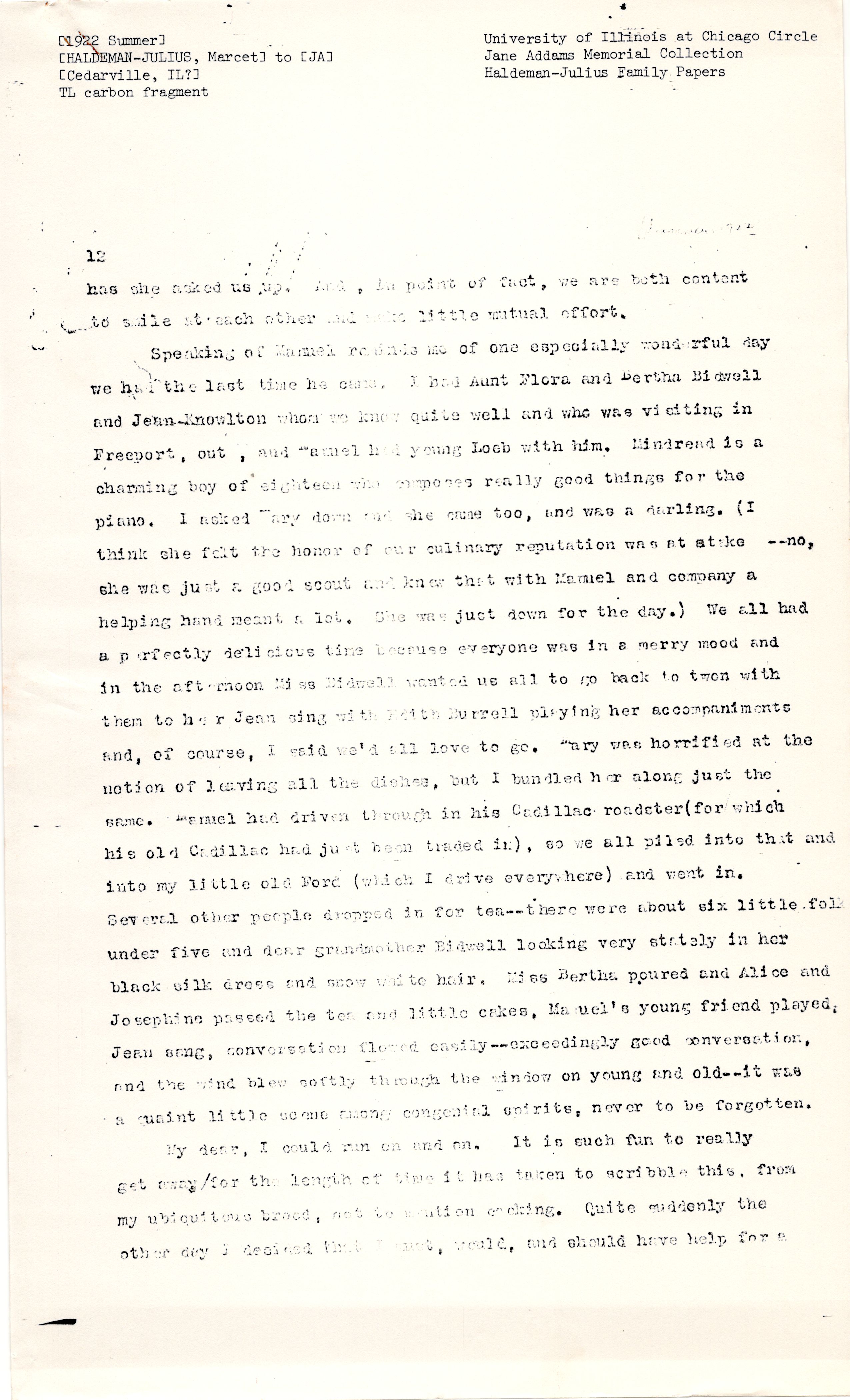 Speaking of Manuel reminds me of one especially wonderful day we had the last time he came. I had Aunt Flora and Bertha Bidwell and Jean Knowlton whom we know quite well and who was visiting in Freeport, out, and Manuel had young Loeb with him. [Mindret] is a charming boy of eighteen who composes really good things for the piano. I asked Mary down and she came too, and was a darling. (I think she felt the honor of our culinary reputation was at stake -- no, she was just a good scout and knew that with Manuel and company a helping hand meant a lot. She was just down for the day.) We all had a perfectly delicious time because everyone was in a merry mood and in the afternoon Miss Bidwell wanted us all to go back to town with them to her Jean sing with Edith Burrell playing her accompaniments and, of course, I said we'd all love to go. Mary was horrified at the notion of leaving all the dishes, but I bundled her along just the same. Manuel had driven through in his Cadillac roadster (for which his old Cadillac had just been traded in), so we all piled into that and into my little old Ford (which I drive everywhere) and went in. Several other people dropped in for tea -- there were about six little folk under five and dear grandmother Bidwell looking very stately in her black silk dress and snow white hair. Miss Bertha poured and Alice and Josephine passed the tea and little cakes, Manuel's young friend played, Jean sang, conversation flowed easily -- exceedingly good conversation, and the wind blew softly through the window on young and old -- it was a quaint little scene among congenial spirits, never to be forgotten.