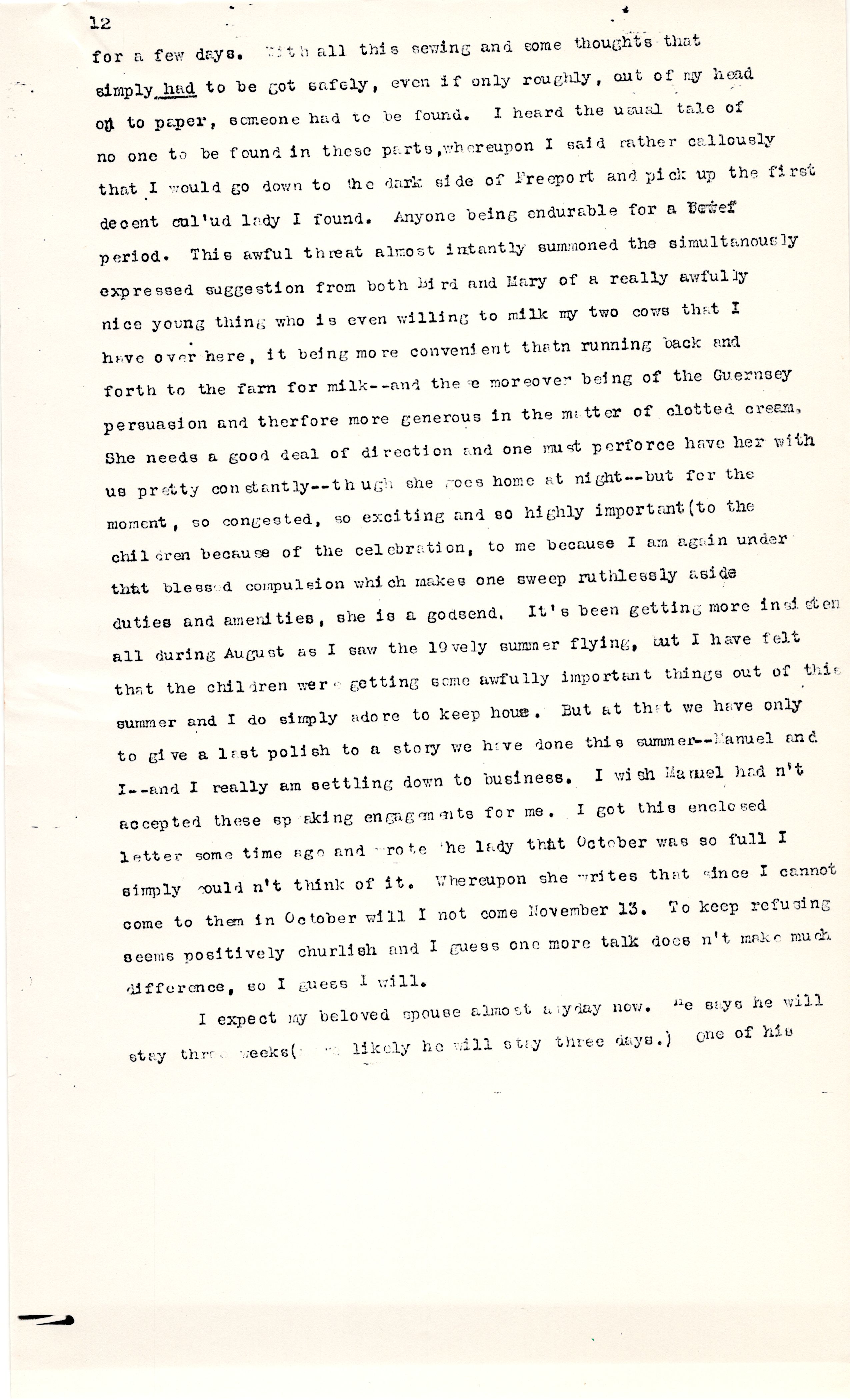 My dear, I could run on and on. It is such fun to really get away for the length of time it has taken to scribble this, from my ubiquitous brood, not to mention cooking. Quite suddenly the other day I decided [that I must], would, and should have help for a [page 2] few days. With all this sewing and some thoughts that simply had to be got safely, even if only roughly, out of my head on to paper, someone had to be found. I heard the usual tale of no one to be found in these parts, whereupon I said rather callously that I would go down to the dark side of Freeport and pick up the first decent [colored] lady I found. Anyone being endurable for a [brief] period. This awful threat almost instantly summoned the simultaneously expressed suggestion from both Bird and Mary of a really awfully nice young thing who is even willing to milk my two cows that I have over here, it being more convenient than running back and forth to the farm for milk -- and [the] moreover being of the Guernsey persuasion and therefore more generous in the matter of clotted cream. She needs a good deal of direction and one must perforce have her with us pretty constantly -- though she goes home at night -- but for the moment, so congested, so exciting and so highly important (to the children because of the celebration, to me because I am again under that blessed compulsion which makes one sweep ruthlessly aside duties and amenities), she is a godsend. It's been getting more [insistent] all during August as I saw the lovely summer flying, but I have felt that the children were getting some awfully important things out of this summer and I do simply adore to keep [house]. But at that we have only to give a last polish to a story we have done this summer -- Manuel and I -- and I really am settling down to business. I wish Manuel hadn't accepted these speaking engagements for me. I got this enclosed letter some time ago and wrote the lady that October was so full I simply wouldn't think of it. Whereupon she writes that since I cannot come to them in October will I not come November 13. To keep refusing seems positively churlish and I guess one more talk doesn't make much difference, so I guess I will.
