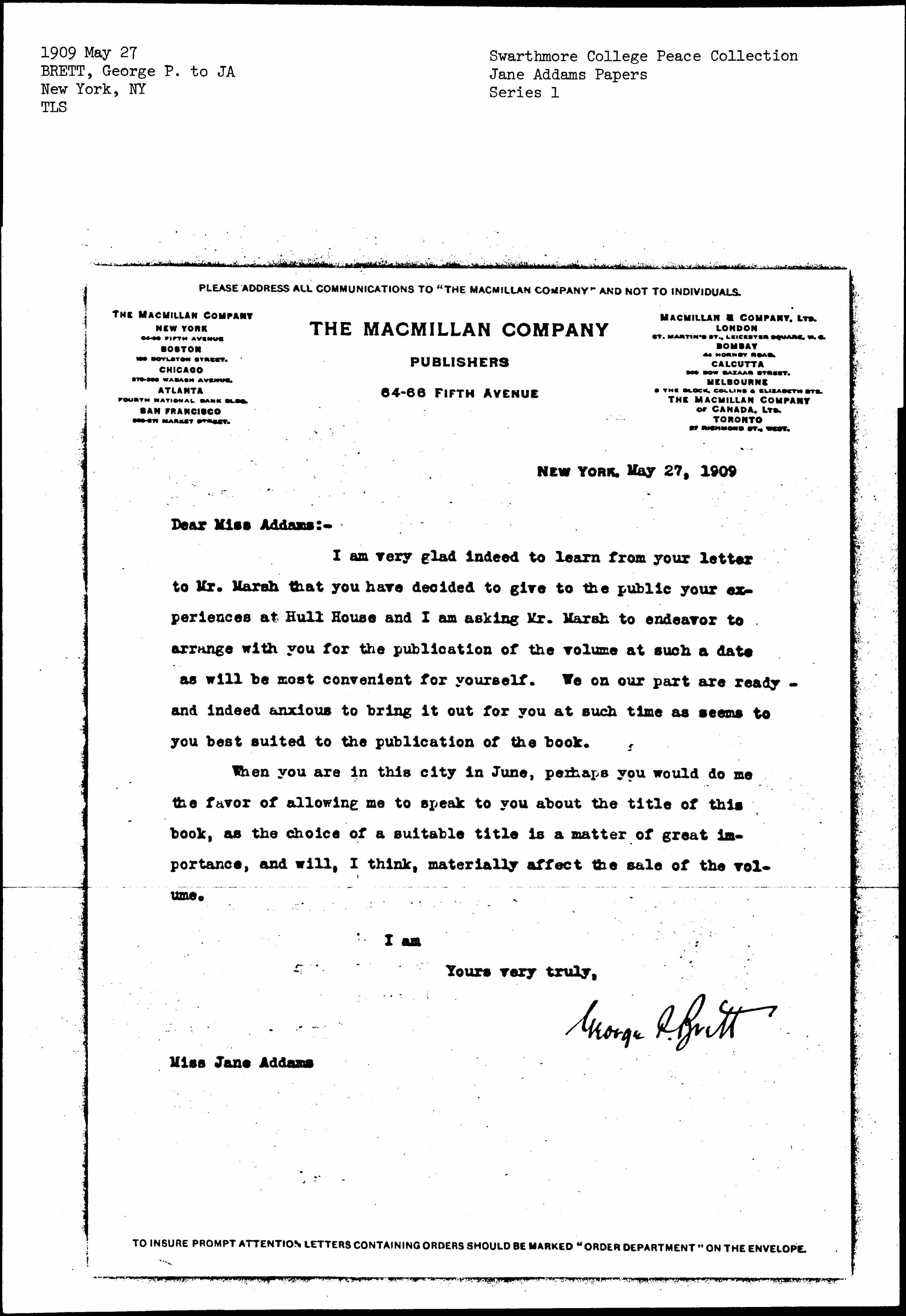 I am very glad indeed to learn from your letter to Mr. Marsh that you decided to give to the public your experiences at Hull House and I am asking Mr. Marsh to endeavor to arrange with you for the publication of the of the volume at such a date as will be most convenient for yourself. We on our part our ready -- and indeed anxious to bring it out for you at such time as seems to you best suited to the publication of the book.