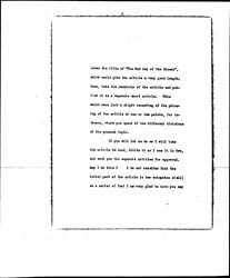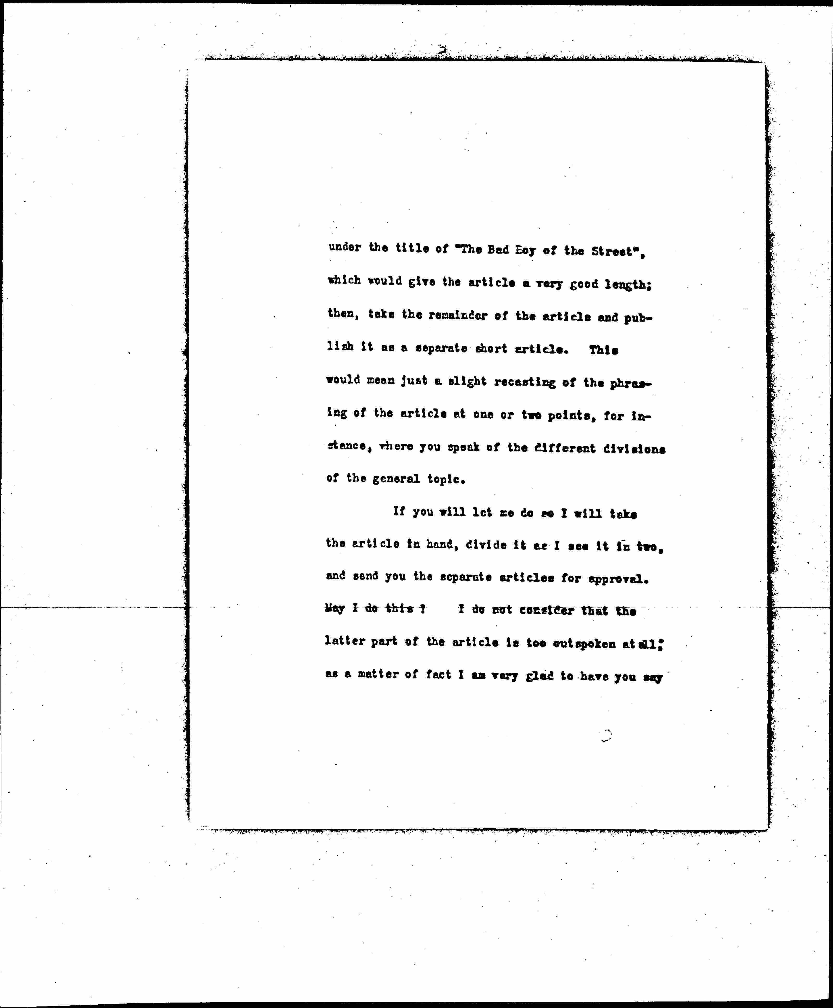 I have now read your other article, on "The Bad Boy of the Street", and to me it is admirable. Of course, it is long, but I like so well everything you say that I don't want to omit any portion of the article. What I would like to do is to publish the first part of the article -- to the point where you indicated it might end, [page 2] under the title of "The Bad Boy of the Street", which would give you the article a very good length; then, take the remainder of the article and publish it as a separate short article. This would mean just a slight recasting of the phrasing of the article at one or two points, for instance, where you speak of the different divisions of the general topic.