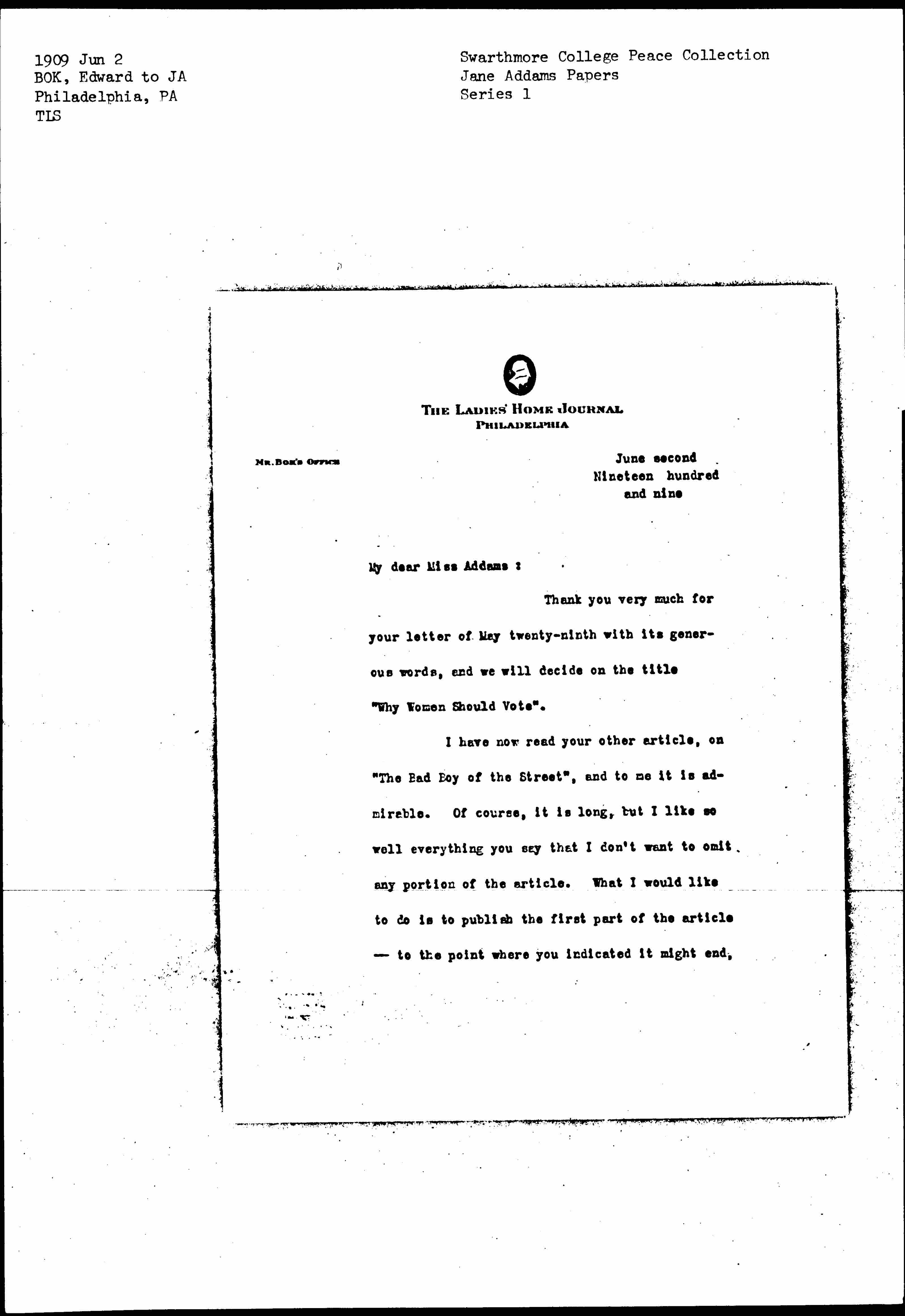 Thank you very much for your letter of May twenty-ninth with its generous words, and we will decide on the title "Why Women Should Vote".