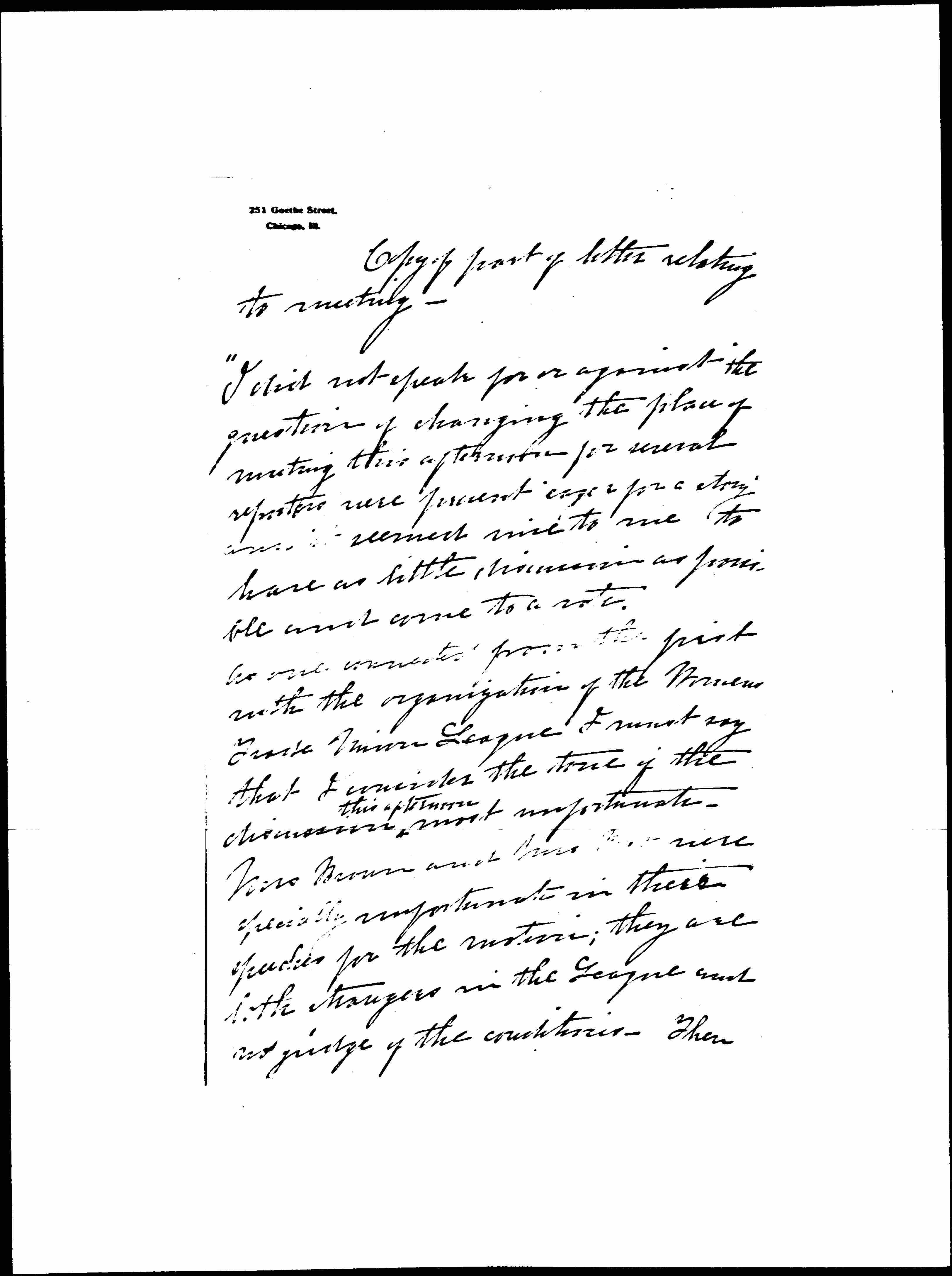 As one connected from the first with the organization of the Womens Trade Union League I must say that I consider the tone of the discussion ↑this afternoon↓ most unfortunate. Mrs Brown and Mrs [illegible] were specially unfortunate in their speeches for the motion; they are both strangers in the League and no judge of the conditions. Then [page 2] I did not think, dear Madam President, that the rights of the minority are best protected when the presiding officer makes a speech in favor of the motion: as far as the question of moving to the center of the city is concerned it was dismissed while Miss McDowell was president and it is certainly worth trying -- my regret is that the discussion took a turn which seemed to reflect on the generous hospitality which are both in [and] from Hull House & the members of the Hull House Womans Club, many of whose husbands I have no doubt are staunch union men, etc.