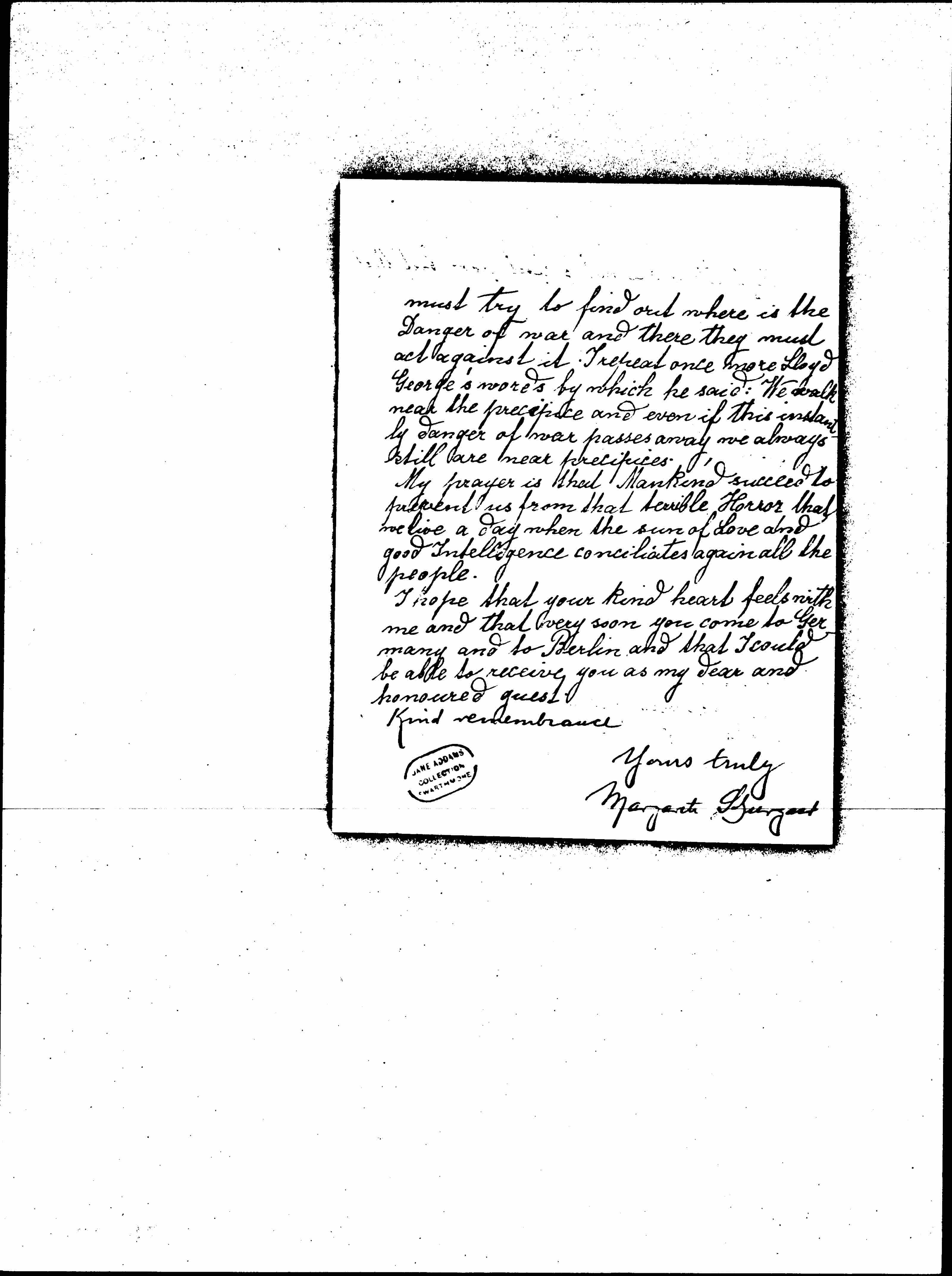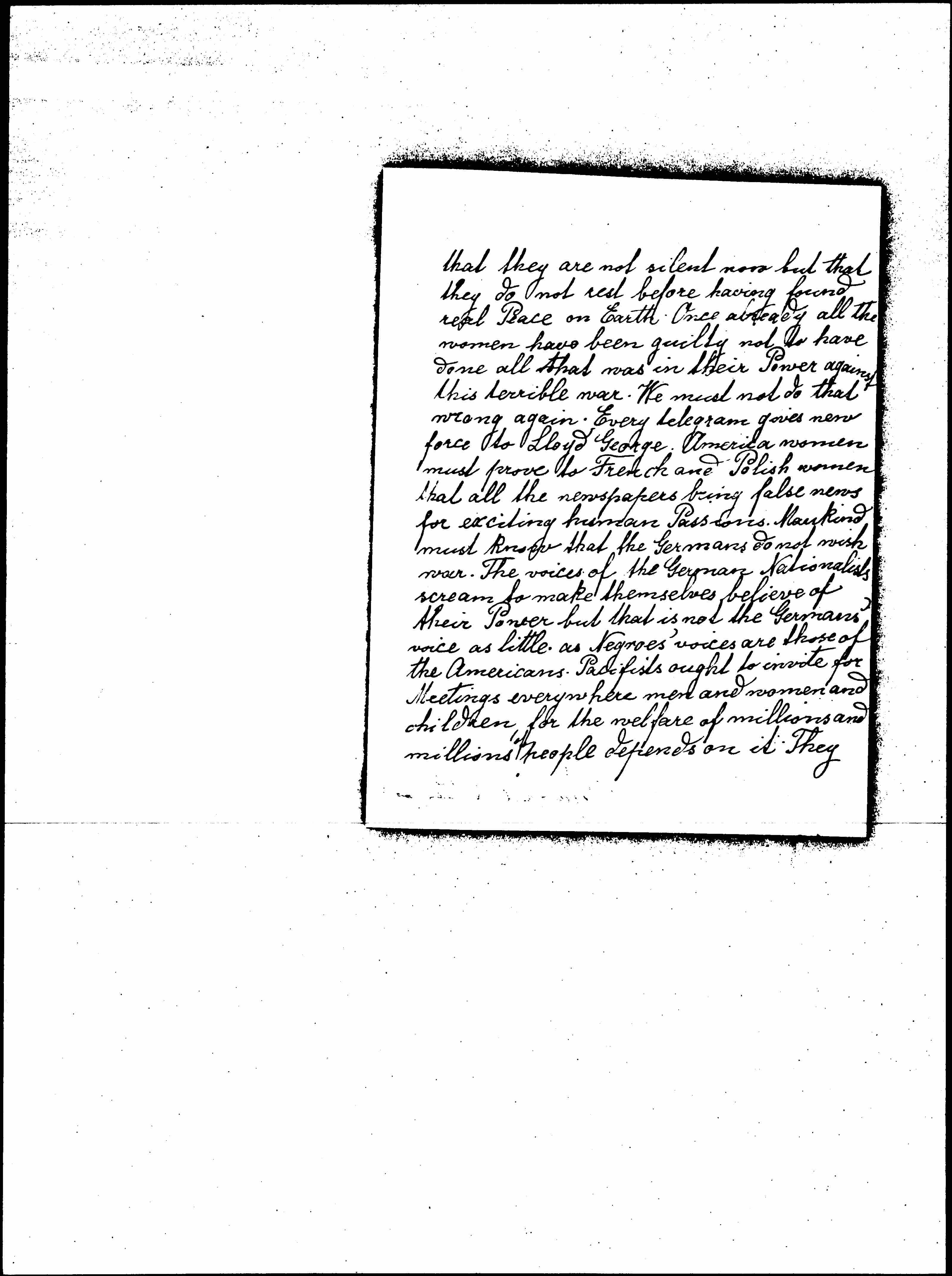 Lloyd George is quite right to say that America will be obliged to interfere into a next war, even against her will, because Japan as allied with France has much interest to go into the war and must take part of it. And Lloyd George is also right to say that only fools can believe to obtain everlasting peace by forced Politics. This time I do not speak to you as a German but as a Pacifist. With all my heart I wished to find words, that [enflame] human hearts [page 3] that they are not silent now but that they do not rest before having found real Peace on Earth. Once already all the women have been guilty not to have done all that was in their Power against this terrible war. We must not do that wrong again. Every telegram gives new force to Lloyd George. America women must prove to French and Polish women that all the newspapers bring false news for exciting human Passions. Mankind must know that the Germans do not wish war. The voices of the German Nationalists scream to make themselves believe of their Power but that is not the Germans' voice as little as Negroes' voices are those of the Americans. Pacifists ought to invite for Meetings everywhere men and women and children, for the welfare of millions and millions ↑of↓ people depends on it. They [page 4] must try to find out where is the Danger of war and there they must act against it. I repeat once more Lloyd George's words by which he said: We walk near the precipice and even if this instantly danger of war passes away we always still are near precipices.