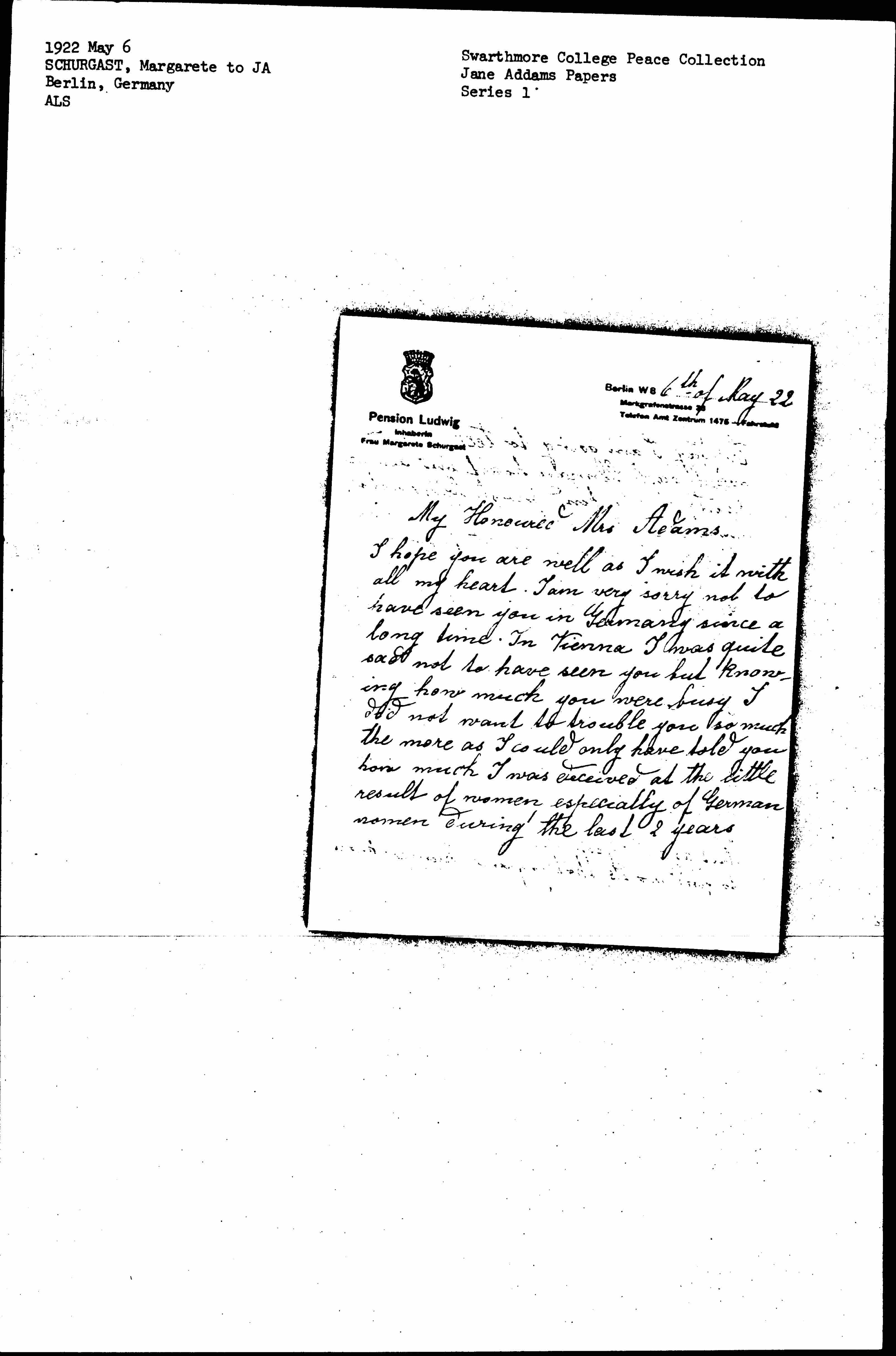 I hope you are well as I wish it with all my heart. I am very sorry not to have seen you in Germany since a long time. In Vienna I was quite sad not to have seen you but knowing how much you were busy I did not want to trouble you so much the more as I could only have told you how much I was deceived at the little result of women especially of German women during the last 2 years [page 2] [Today] I am going to tell you by what each German heart and all the hearts of mankind must bring into emotion. Three thousand years of History have shown that forced Politics never lead us to peace.