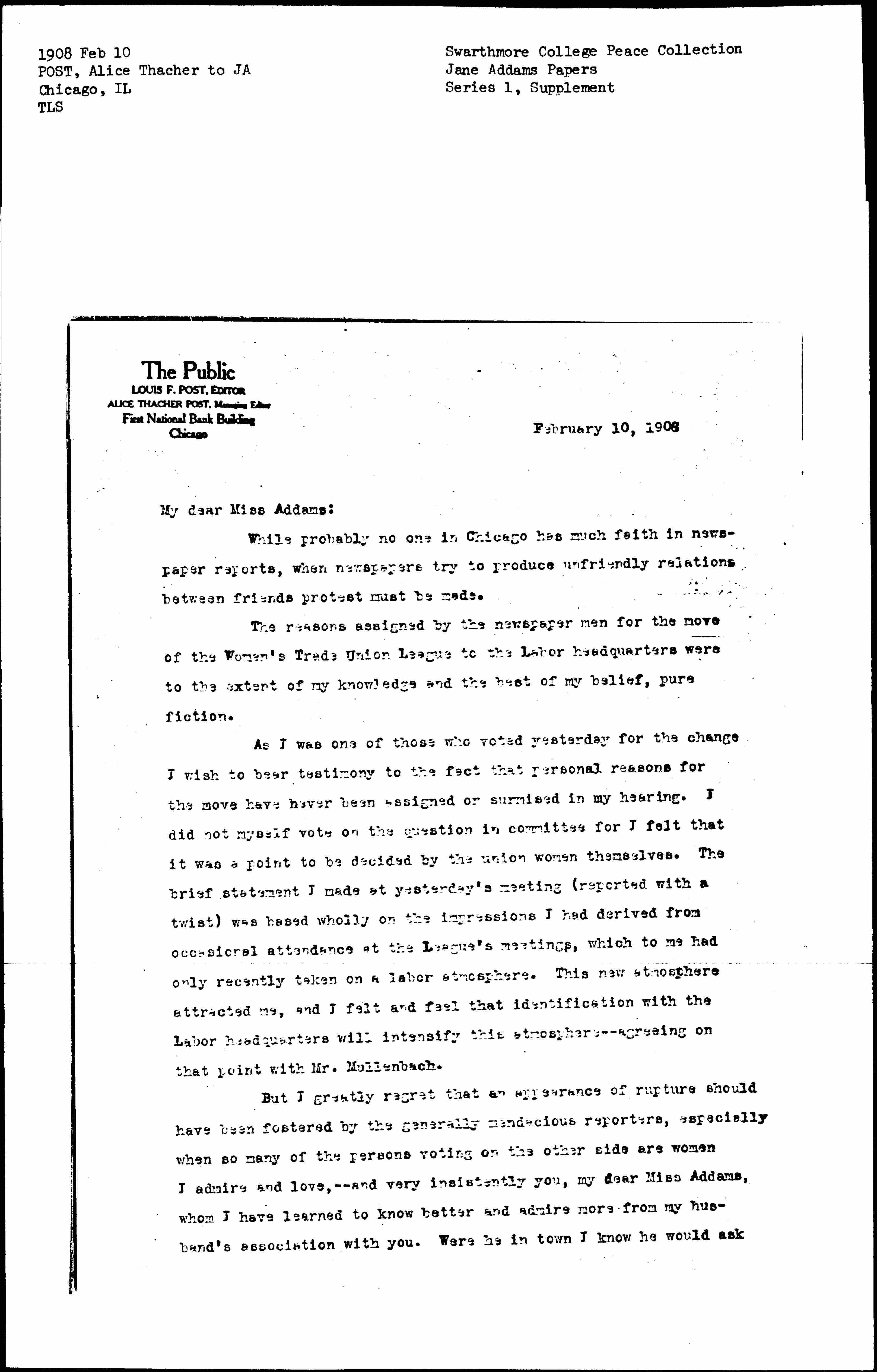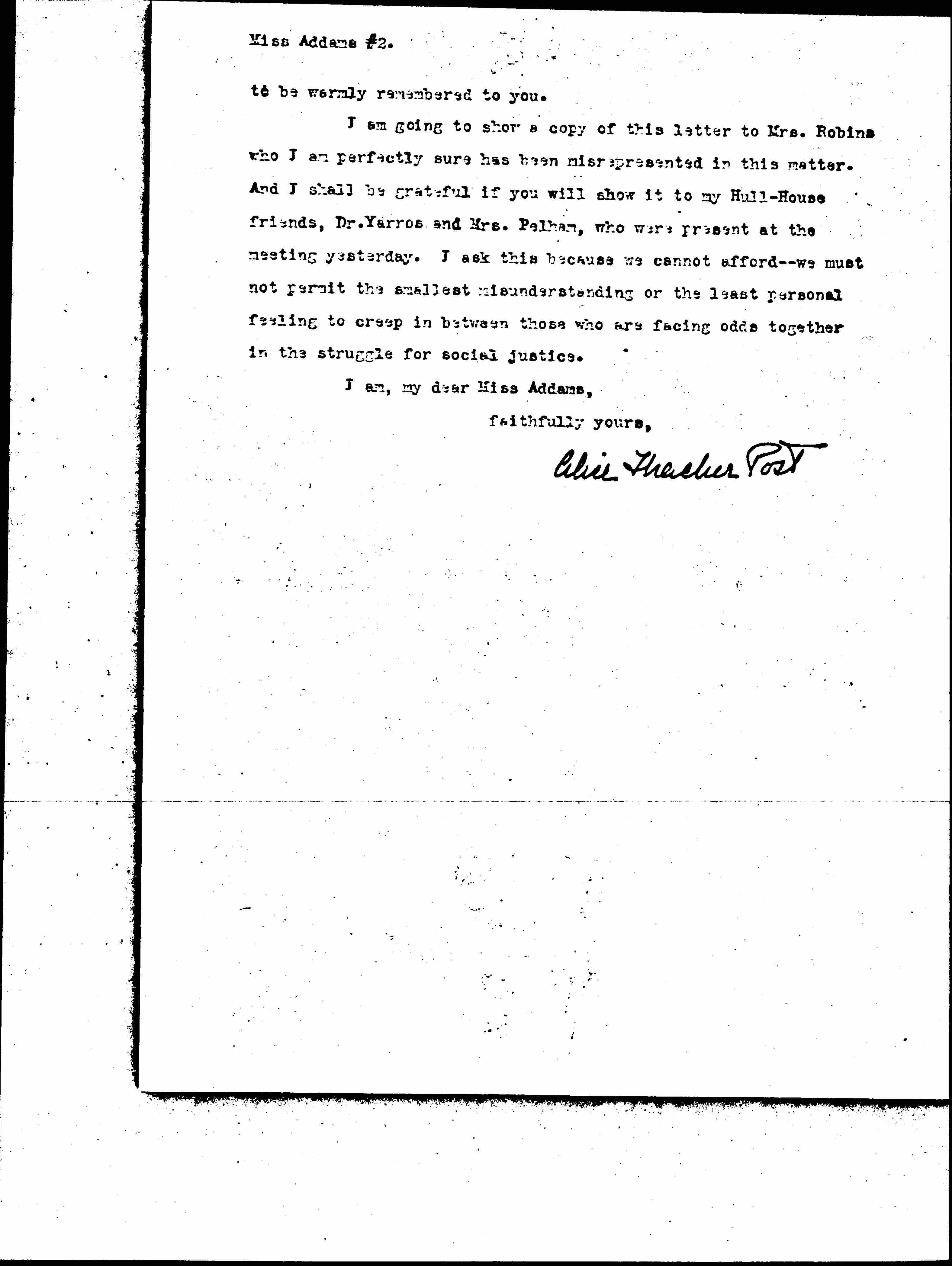 I am going to show a copy of this letter to Mrs. Robins who I am perfectly sure has been misrepresented in this matter. And I shall be grateful if you will show it to my Hull-House friends, Dr. Yarros and Mrs. Pelham, who were present at the meeting yesterday. I ask this because we cannot afford -- we much not permit the smallest misunderstanding or the least personal feeling to creep in between those who are facing odds together in the struggle for social justice.