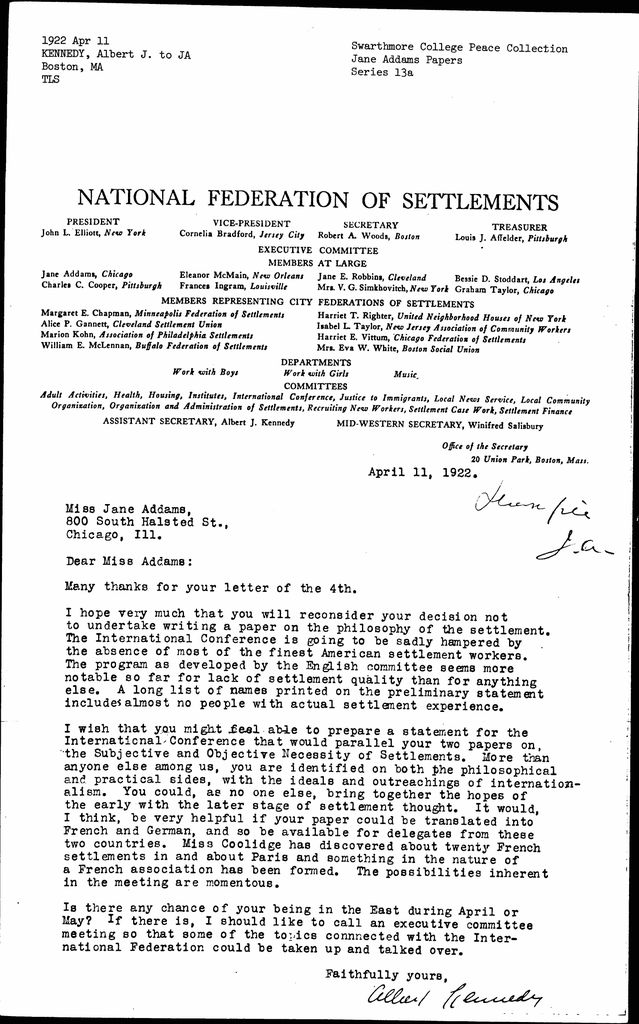I wish that you might feel able to prepare a statement for the International Conference that would parallel your two papers on the Subjective and Objective Necessity of Settlements. More than anyone else among us, you are identified on both the philosophical and practical sides, with the ideals and outreachings of internationalism. You could, as no one else, bring together the hopes of the early with the later stage of settlement thought. It would, I think, be very helpful if your paper could be translated into French and German, and so available for delegates from these two countries. Miss Coolidge has discovered about twenty French settlements in and about Paris and something in the nature of a French association has been formed. The possibilities inherent in the meeting are momentous.
