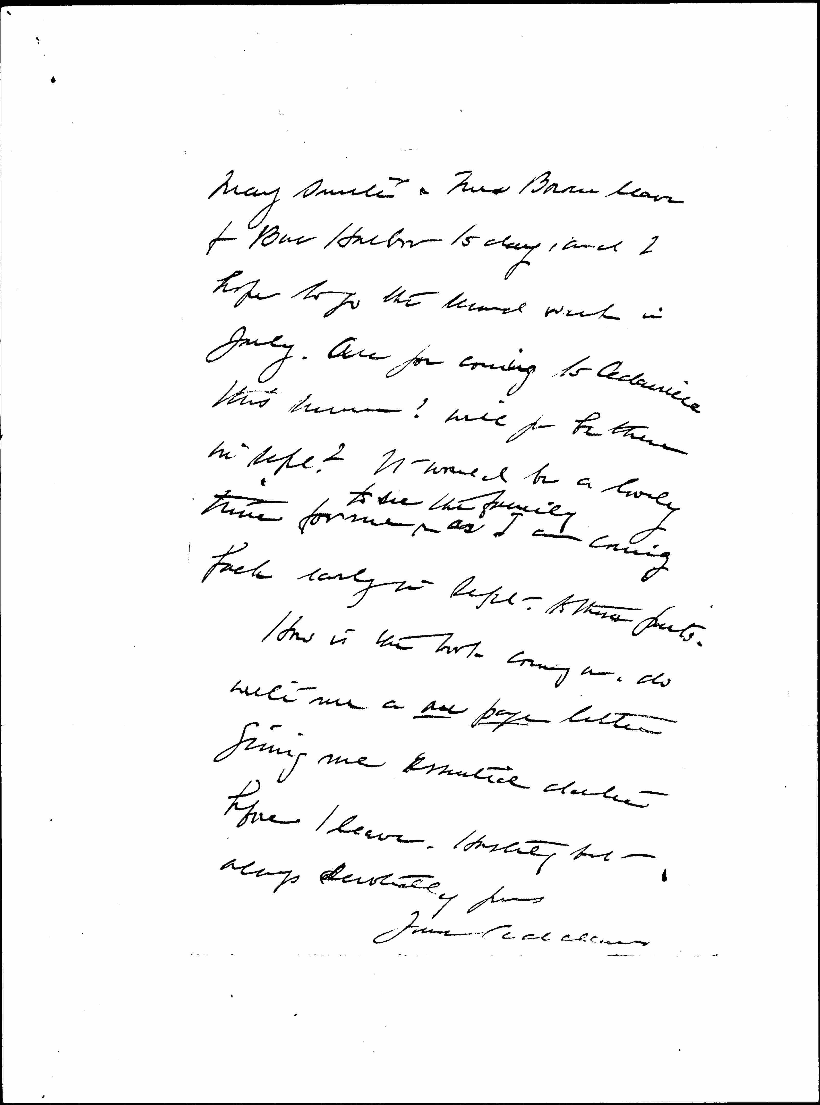 Half past two on Wednesday is an unearthly hour but we are all reconciled as it seems to fit in with their plans for motoring north. [page 2] Mary Smith & Mrs Bowen leave for Bar Harbor today, and I hope to go the second week in July. Are you coming to Cedarville this summer? Will you be there in Sept? It would be a lovely time for me ↑to see the family↓ as I am coming back early in Sept. to these parts.