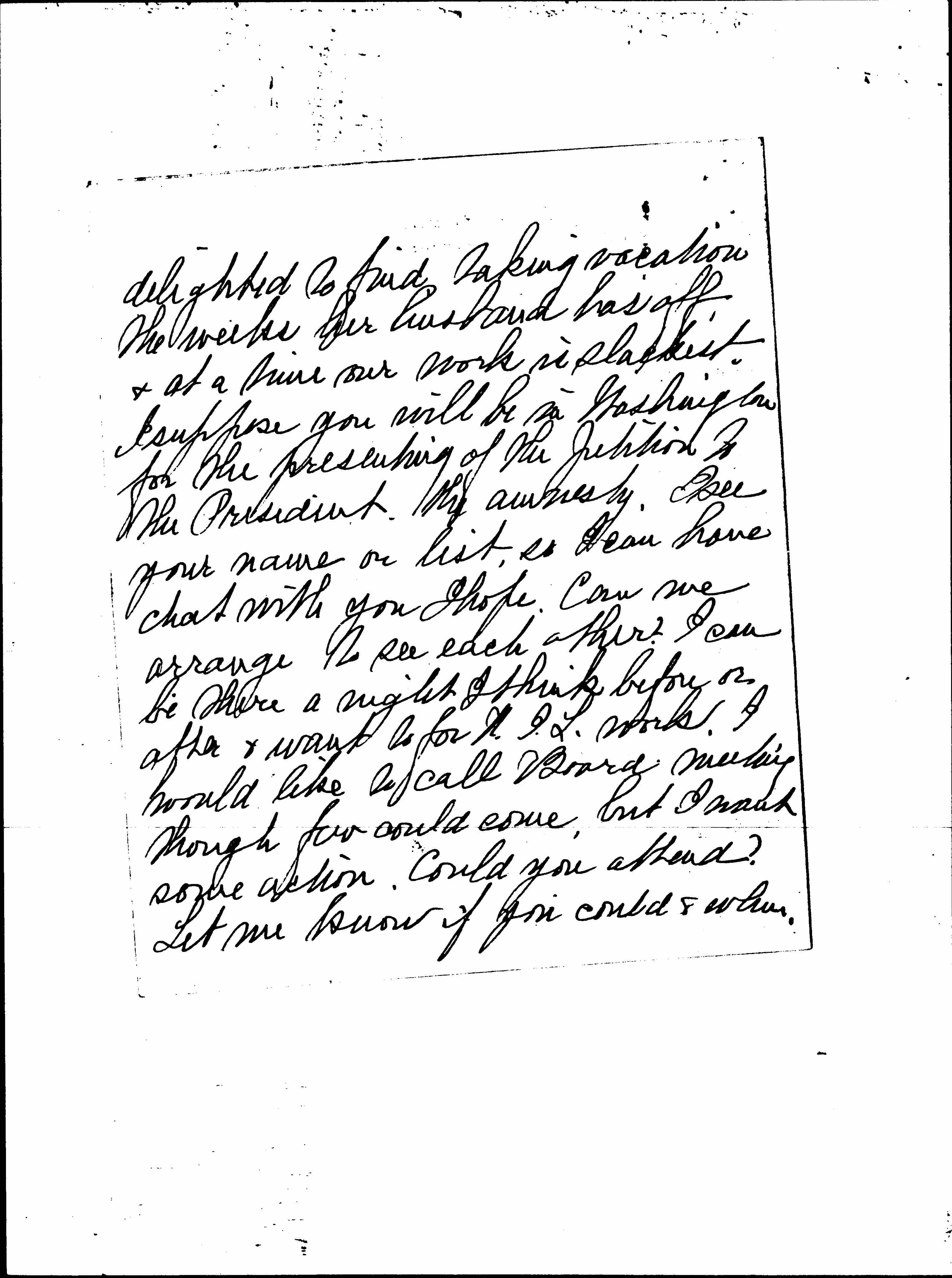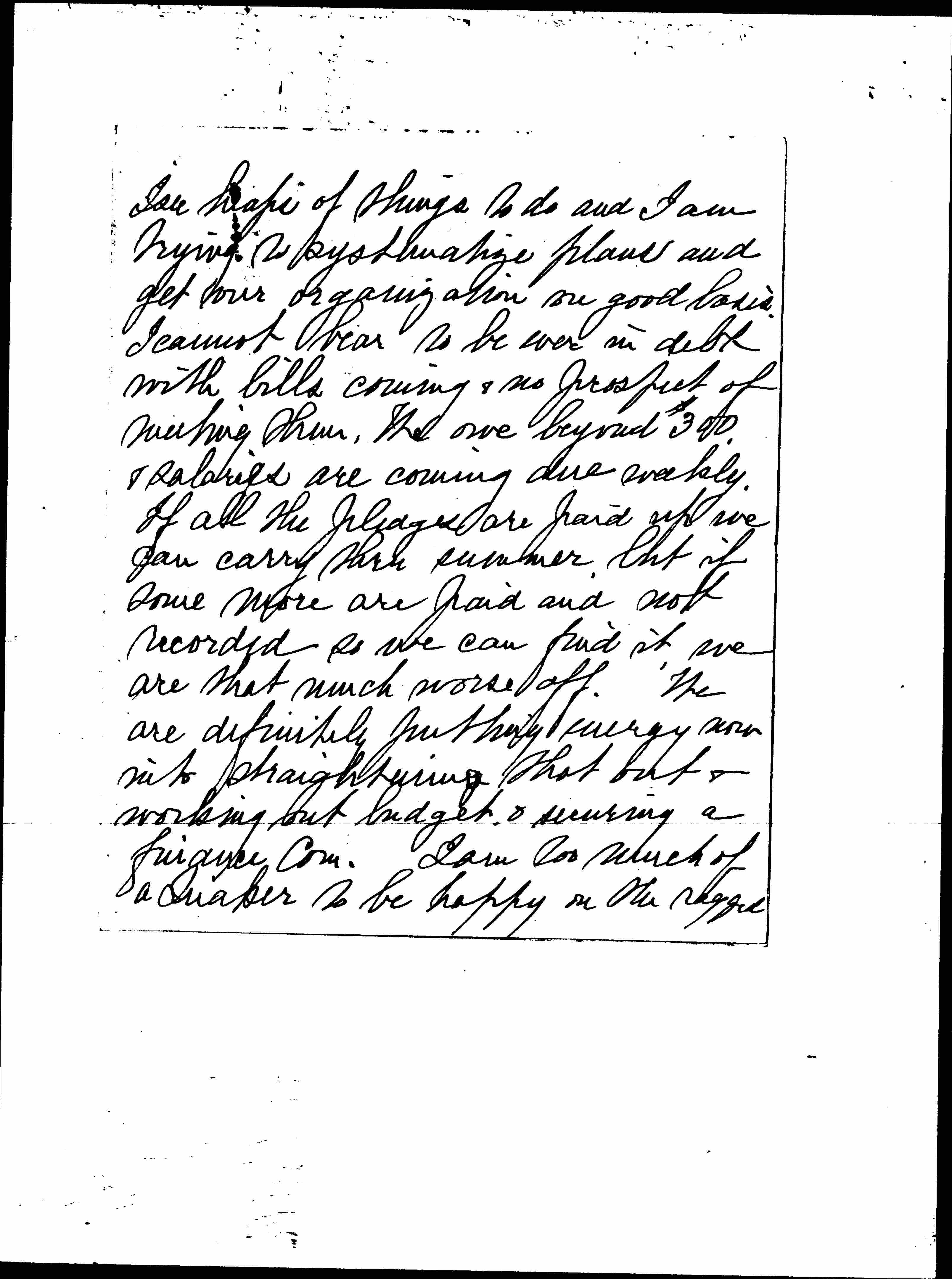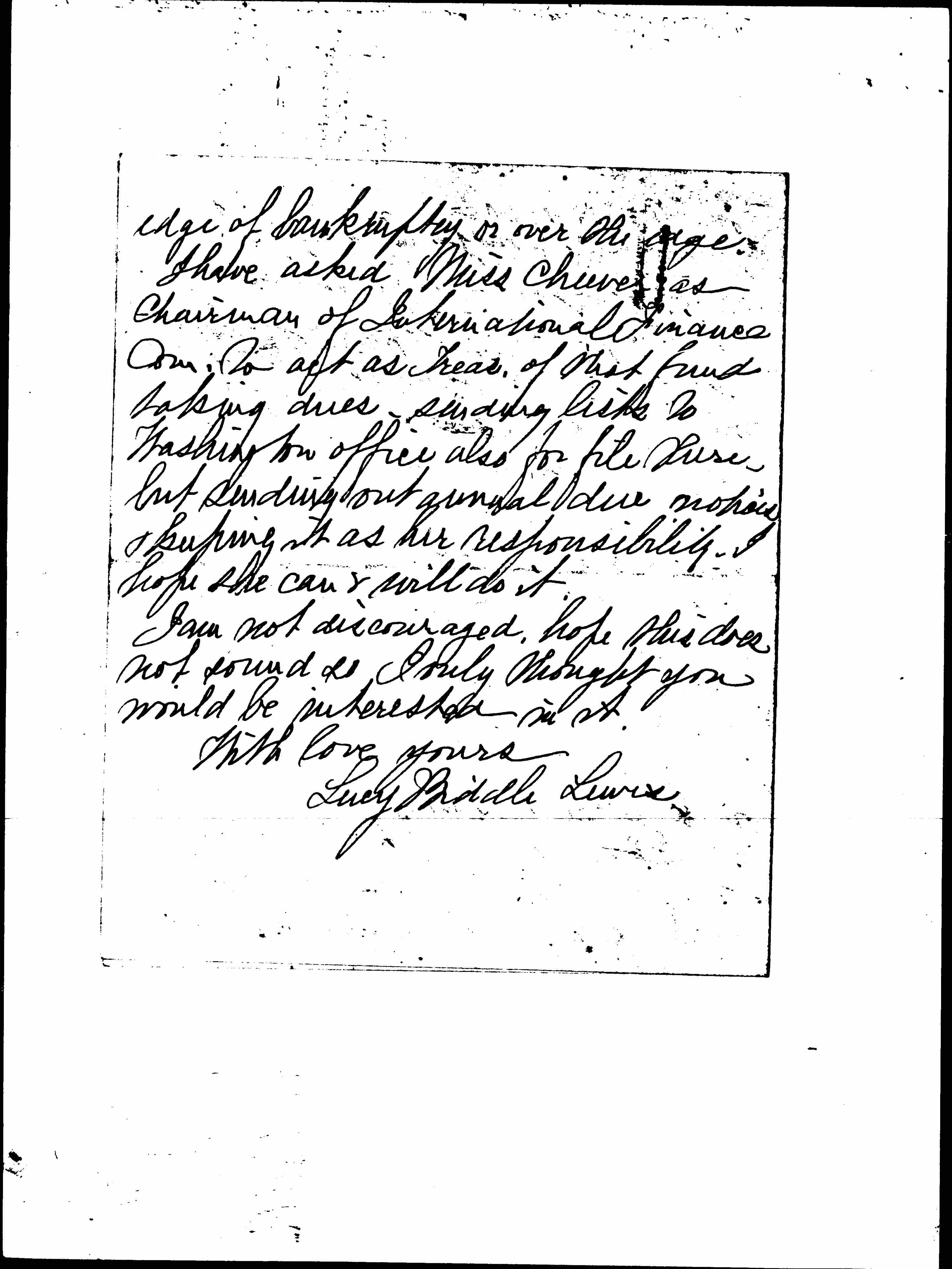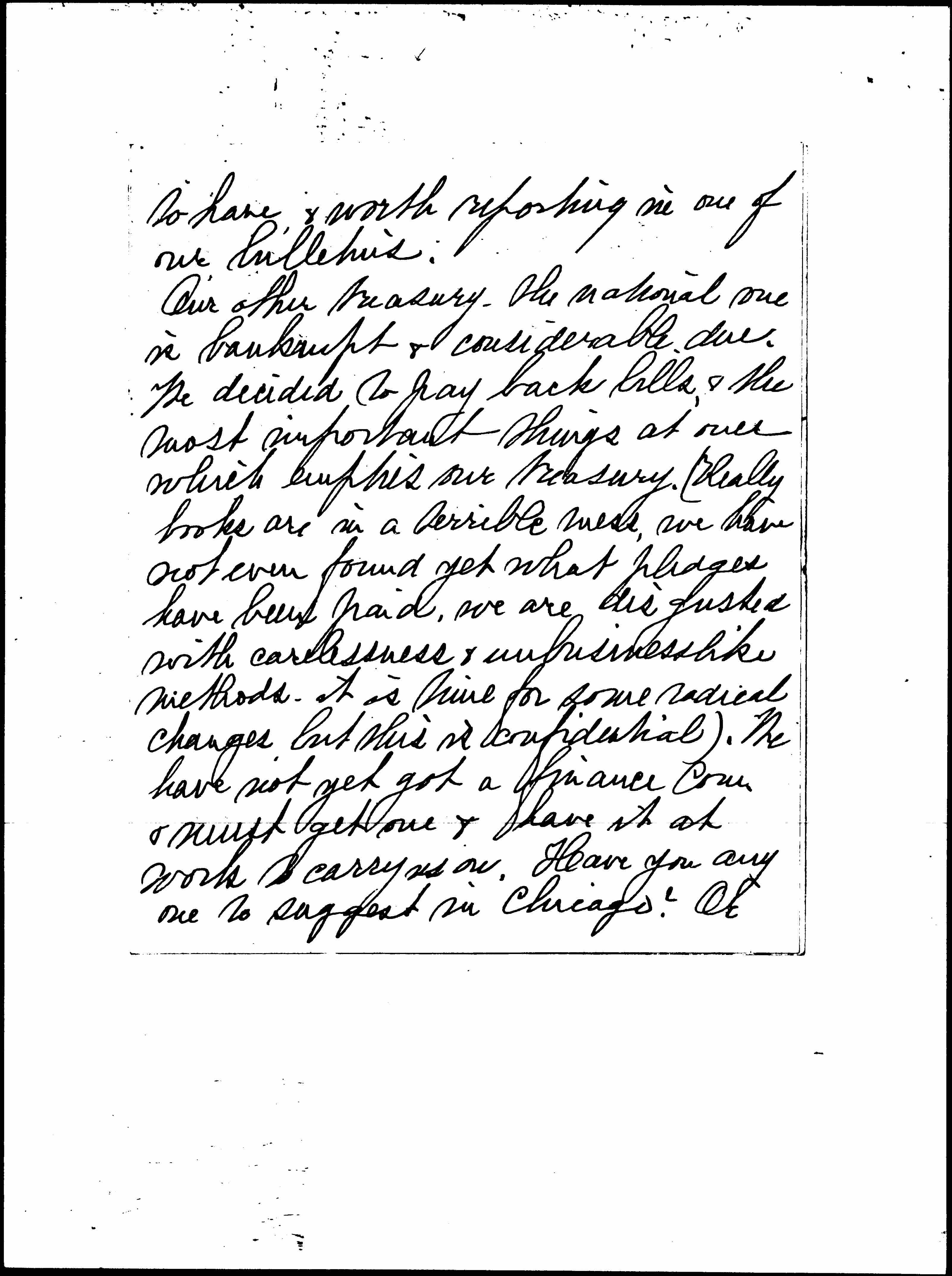 Our other treasury -- the national one is bankrupt & considerable due. We decided to pay back bills, & the most important things at once which empties our treasury. (Really books are in a terrible mess, we have not even found yet what pledges have been paid, we are disgusted with carelessness & unbusinesslike methods -- it is time for some radical changes but this is confidential). We have not yet got a finance Com & might get one & have it at work to carry us on. Have you anyone to suggest in Chicago? Or [page 4] should I correspond with Miss Boynton or someone else in this matter? I am not sure who is the best person to write to in your group. Mrs. Mathes was asked to serve I think, but we have no response.