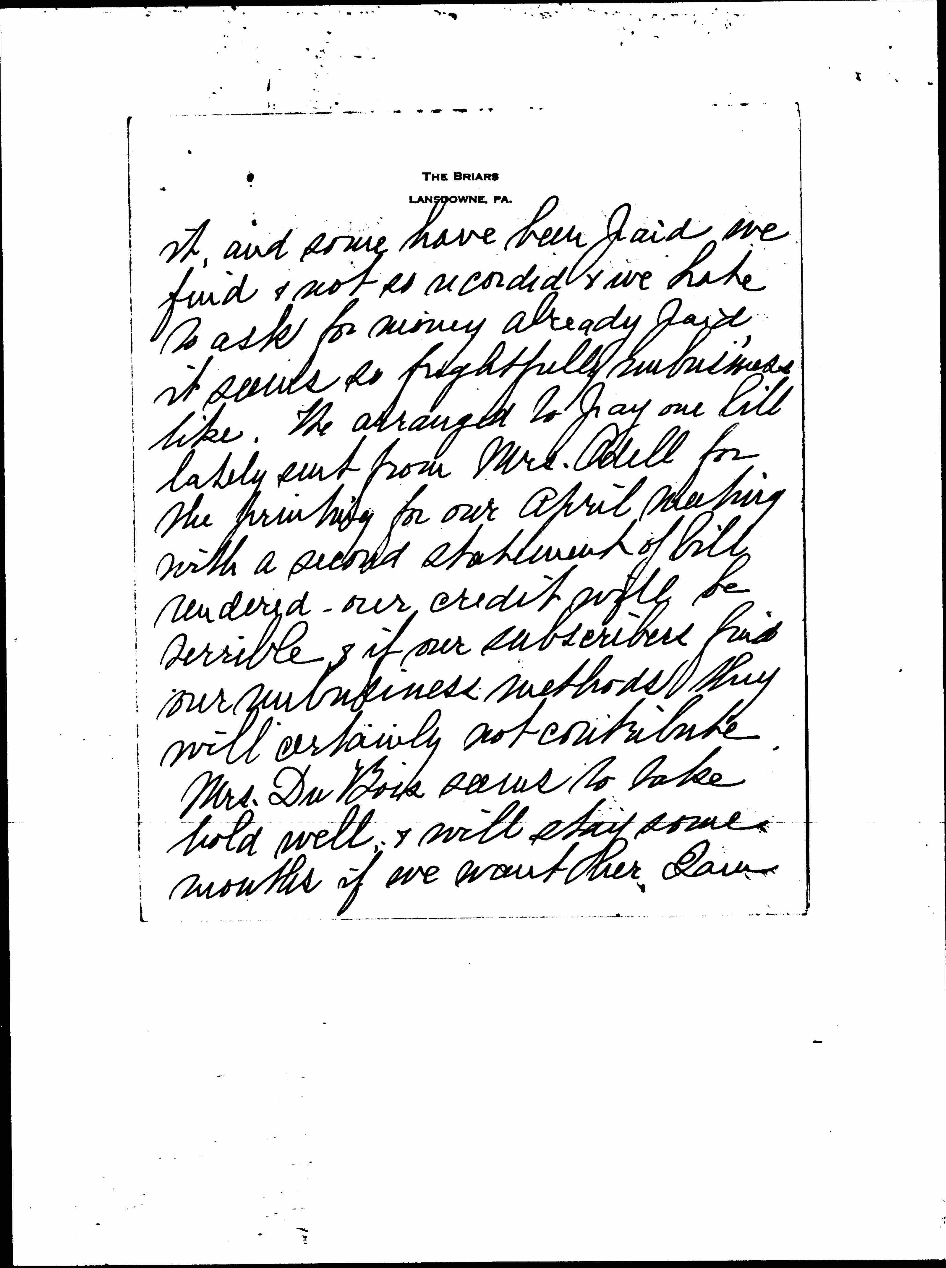 We have two pledges, one "Miss Addams $100.00" & "Chicago $100.00" and I have $25.00 received which I suppose is on the latter, but it was sent as "$25.00 on pledge for office expenses $50.00." If we could get this money from you & the Chicago group it would help us, we are wishing to get in all the pledges, but there is a mess over [page 5] it, and some have been paid we find & not so recorded & we hate to ask for money already paid, it seems so frightfully unbusinesslike. We arranged to pay one bill lately sent from Mrs. Odell for the printing for our April meeting with a second statement of bill rendered -- our credit will be terrible & if our subscribers find our unbusiness methods they will certainly not contribute.