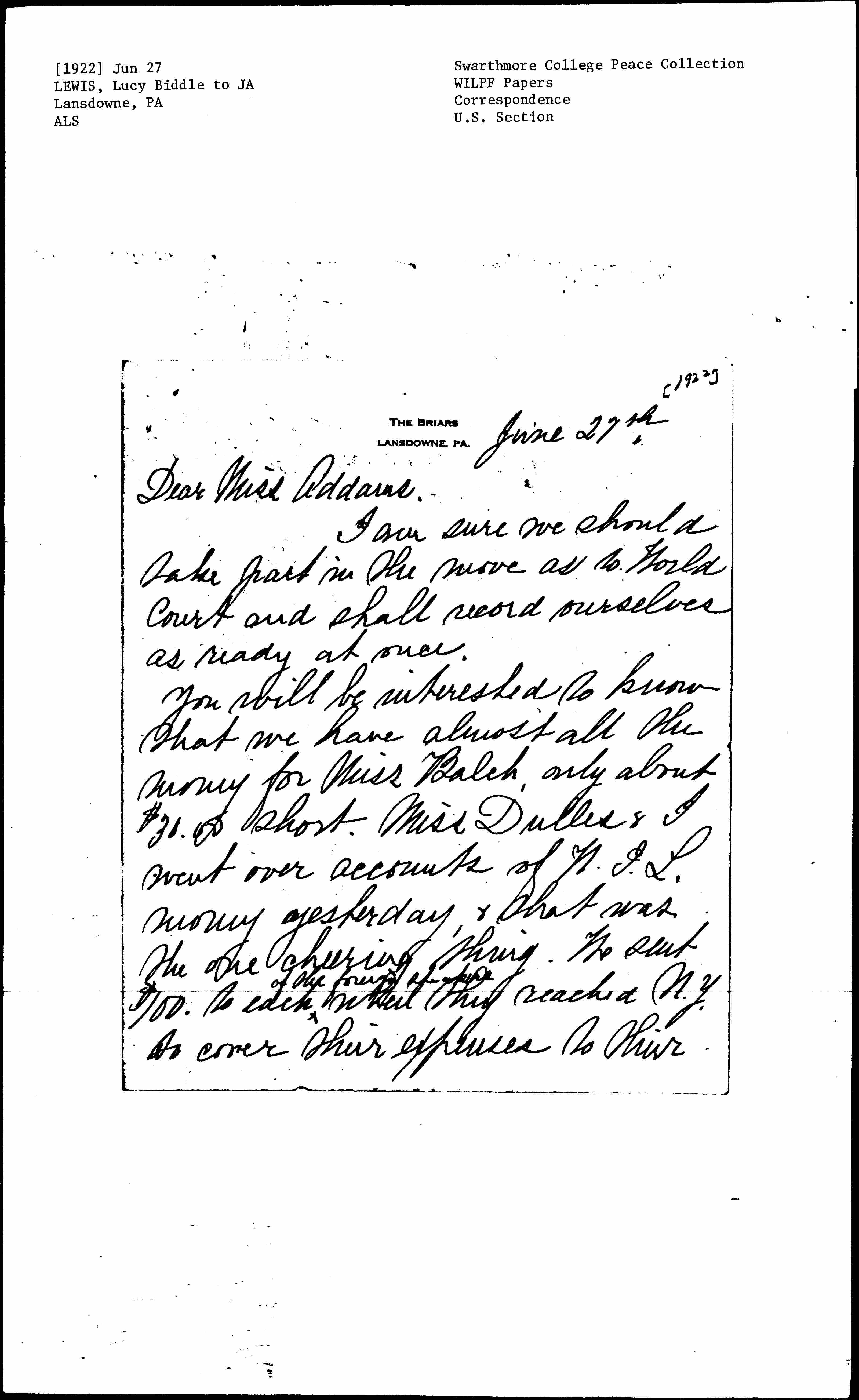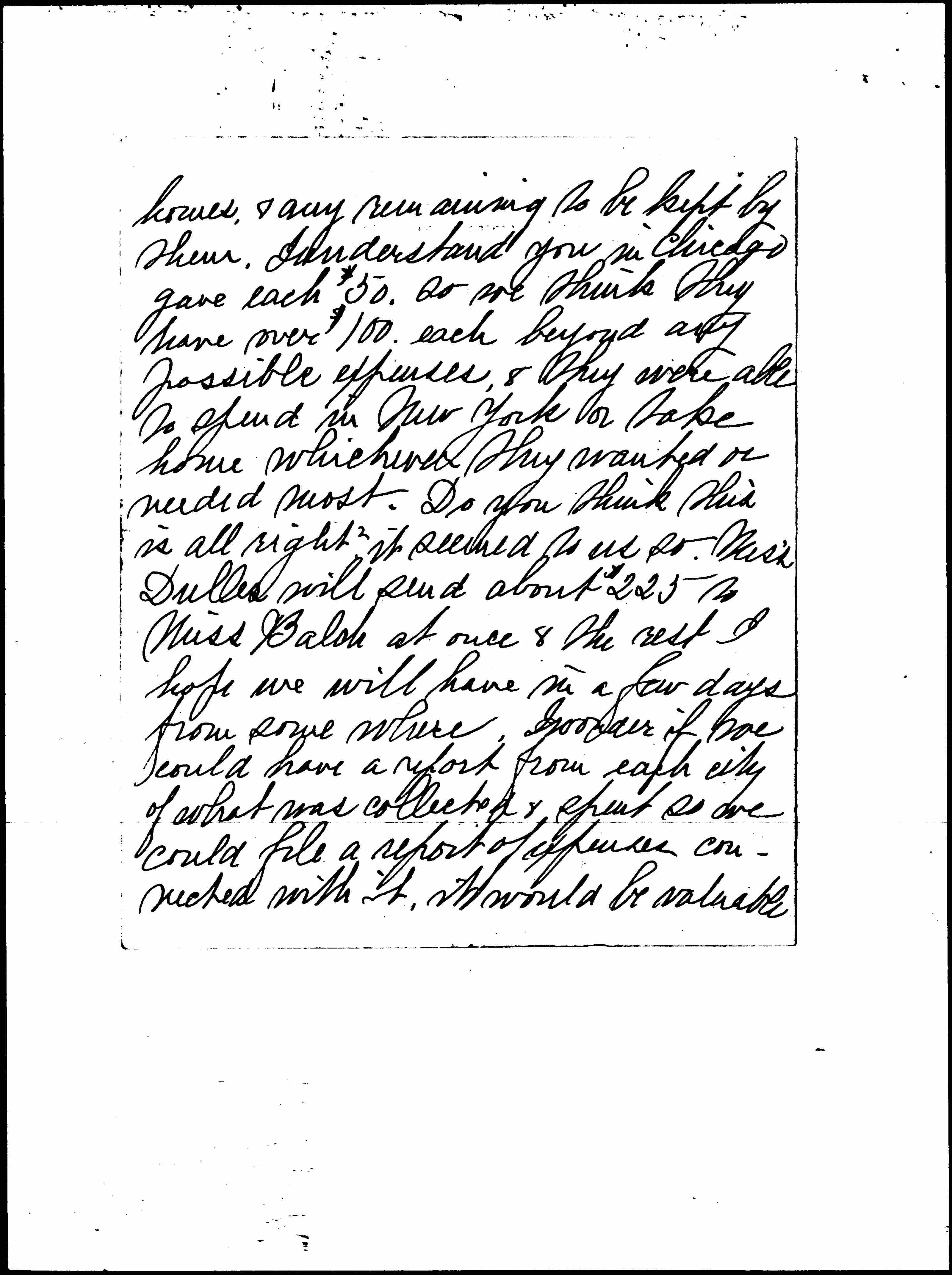 You will be interested to know that we have almost all the money for Miss Balch, only about $30.00 short. Miss Dulles & I went over accounts of W.I.L. money yesterday, & that was the one cheering thing. We sent $100 to each ↑of the foreign speakers↓ when they reached N.Y. to cover their expenses to their [page 2] homes, & any remaining to be kept by them. I understand you in Chicago gave each $50 so we think they have over $100 each beyond any possible expenses, & they were all to spend in New York or take home whichever they wanted or needed most. Do you think this is all right? It seemed to us so. Miss Dulles will send about $225 to Miss Balch at once & the rest I hope we will have in a few days from somewhere. I wonder if we could have a report from each city of what was collected & spent so we could file a report of expenses connected with it, it would be valuable [page 3] to have, & worth reporting in one of our bulletins.