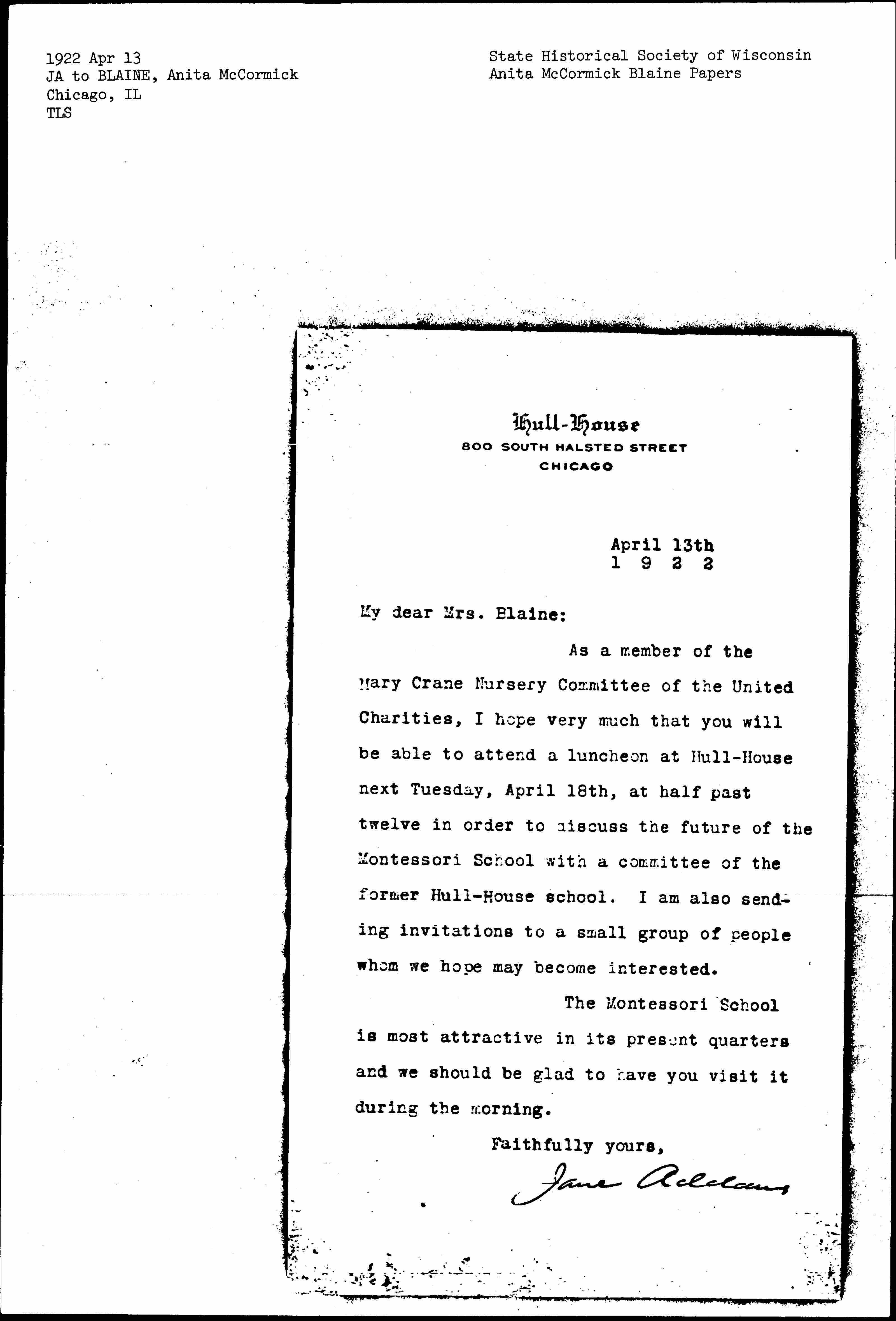 As a member of the Mary Crane Nursery Committee of the United Charities, I hope very much that you will be able to attend a luncheon at Hull-House next Tuesday, April 18th, at half past twelve in order to discuss the future of the Montessori School with a committee of the former Hull-House school. I am also sending invitations to a small group of people whom we hope may become interested.