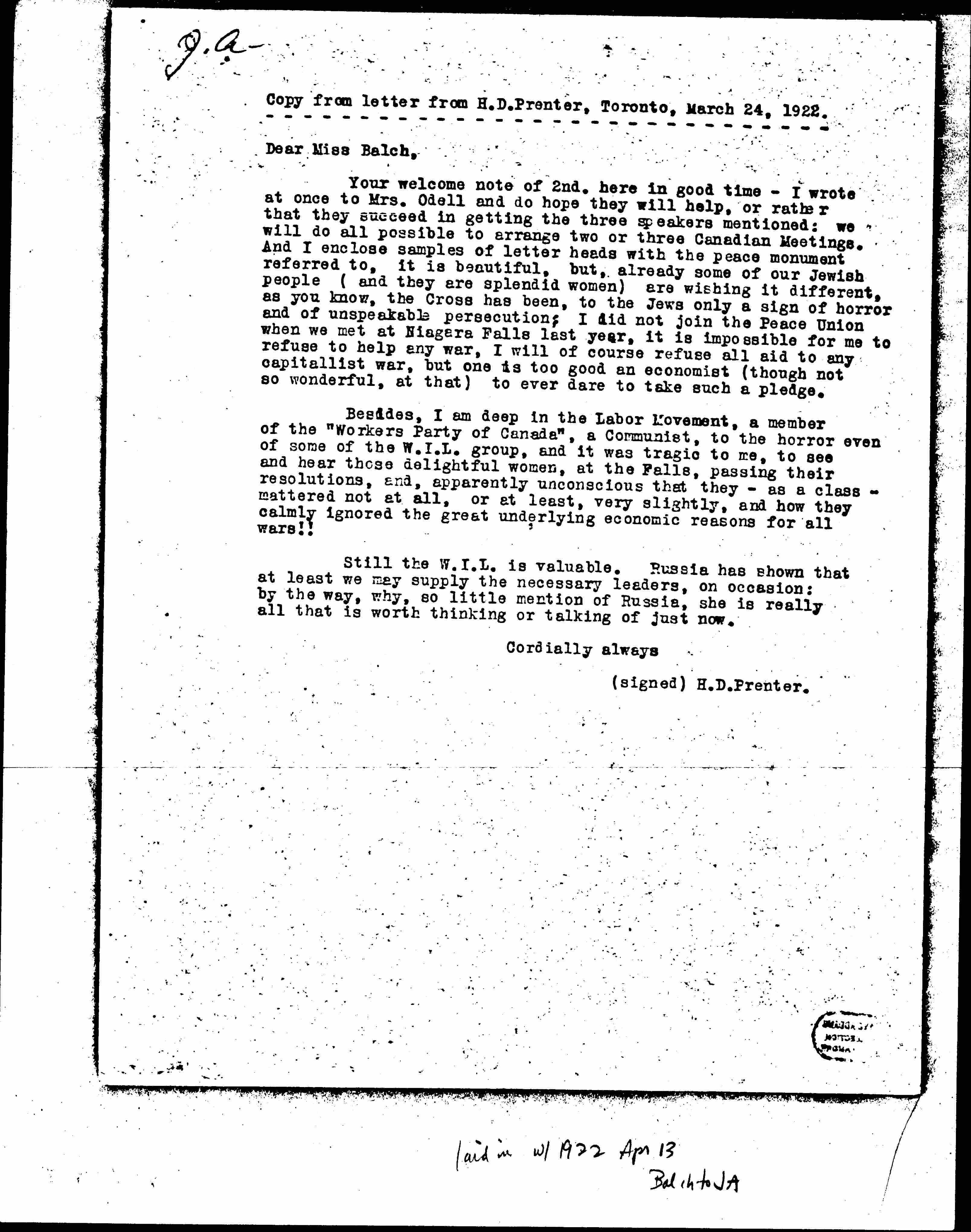 Copy from letter from H. D. Prenter, Toronto, March 24, 1922.
