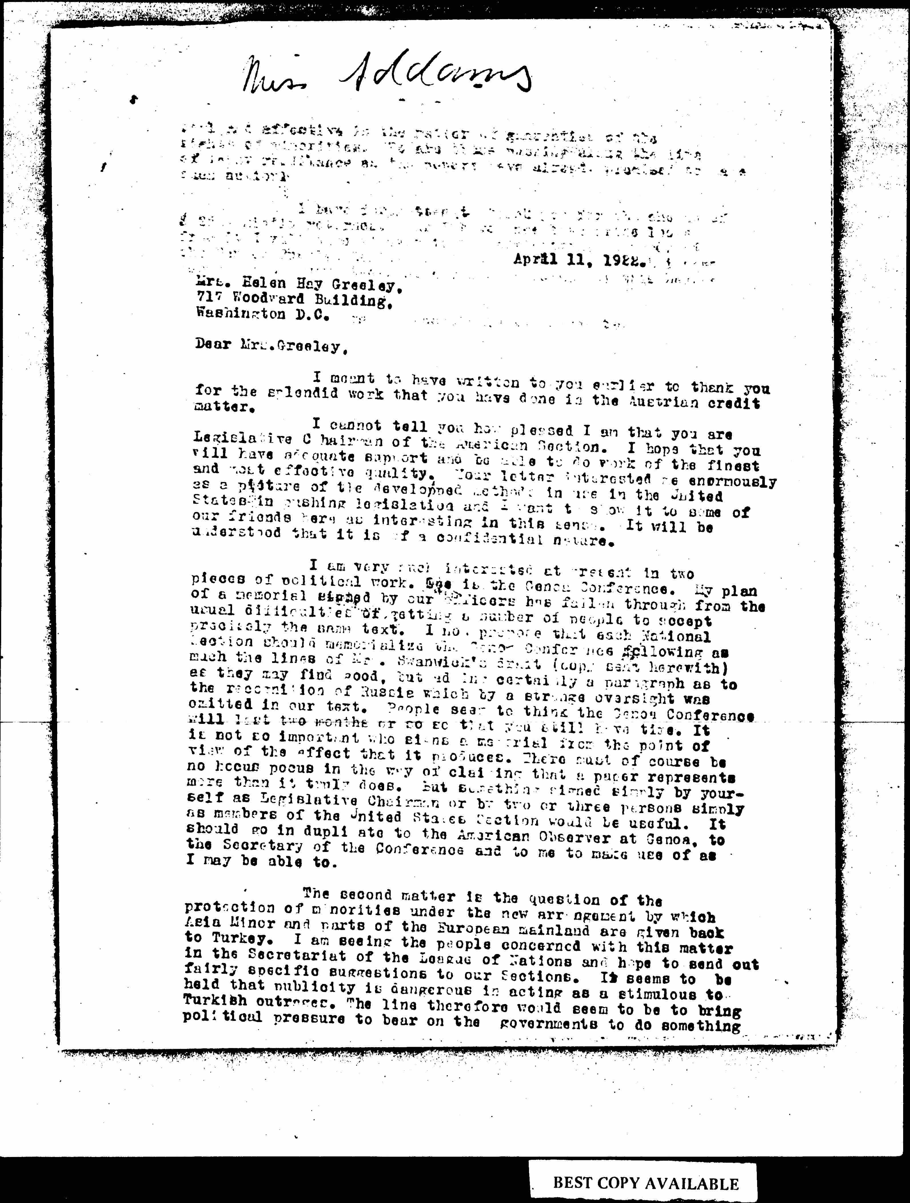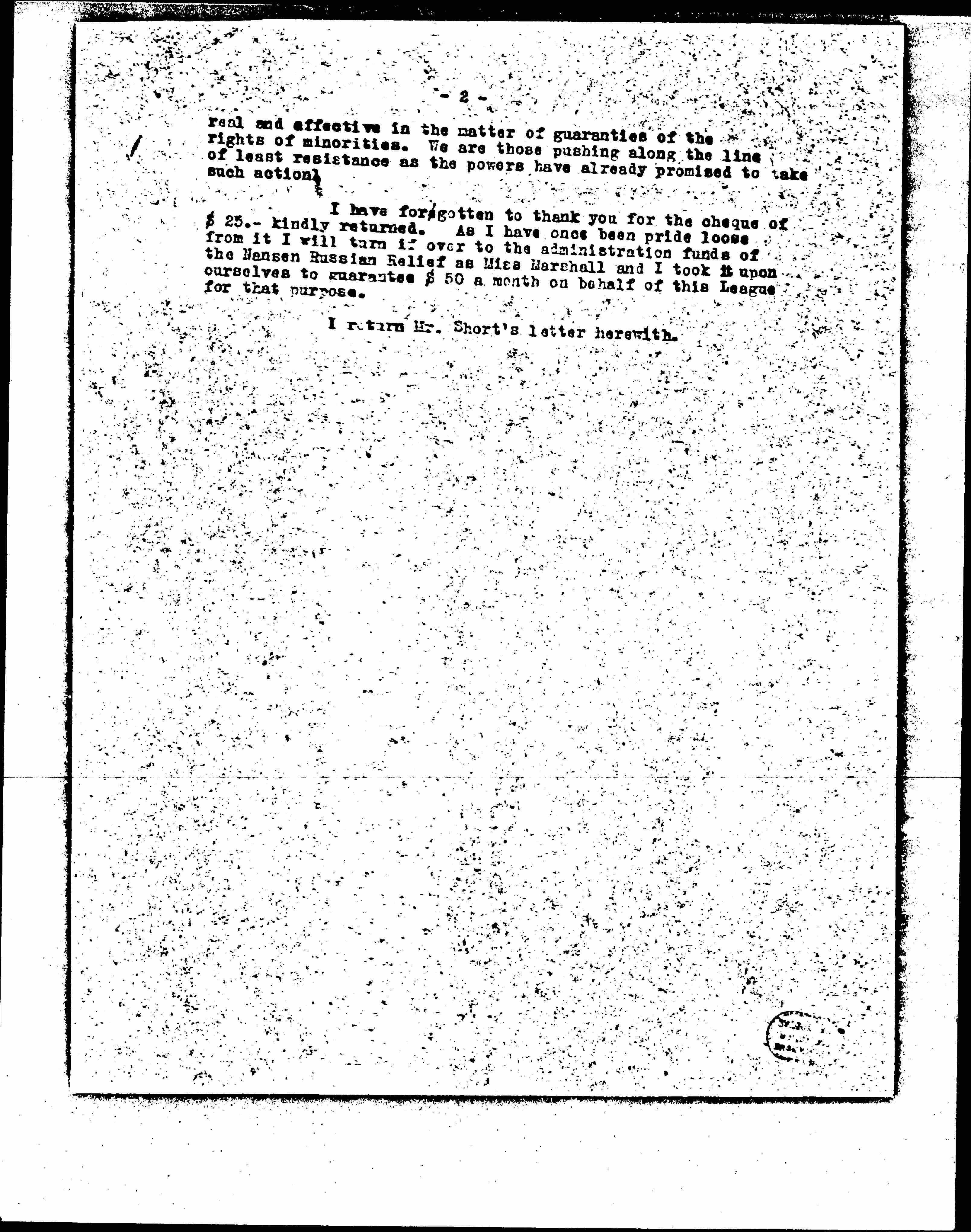 The second matter is the question of the protection of minorities under the new arrangement by which Asia Minor and parts of the European mainland are given back to Turkey. I am seeing the people concerned with this matter in the Secretariat of the League of Nations and hope to send out fairly specific suggestions to our Sections. It seems to be held that publicity is dangerous in acting as a [stimulus] to Turkish outrages. The line therefore would seem to be to bring political pressure to bear on the governments to do something [page 2] real and [effective] in the matter of guaranties of the rights of minorities. We are those pushing along the line of least resistance as the powers have already promised to take such action.