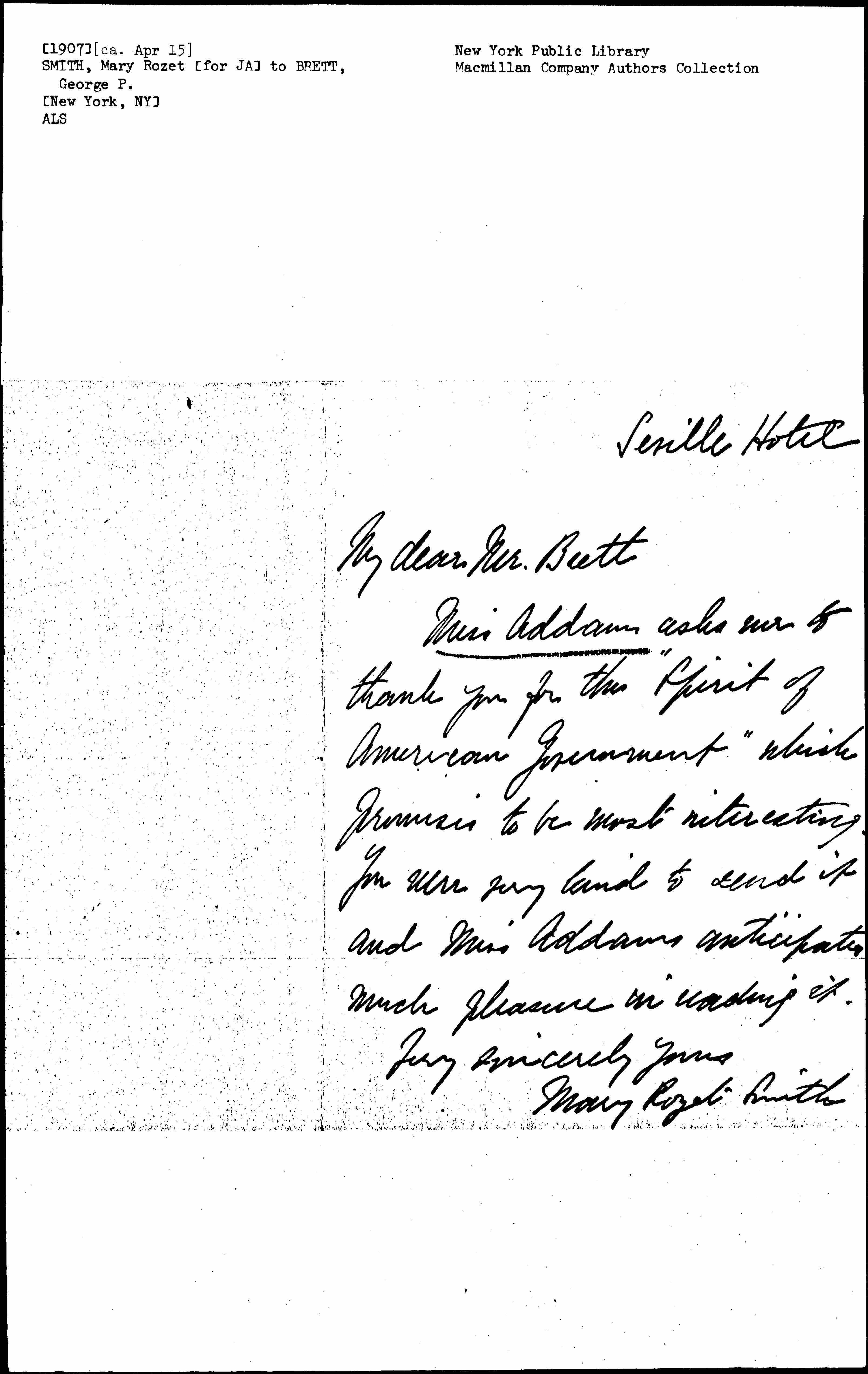 Miss Addams asks me to thank you for the "Spirit of American Government" which promises to be most interesting. You were very kind to send it and Miss Addams anticipates much pleasure in reading it.