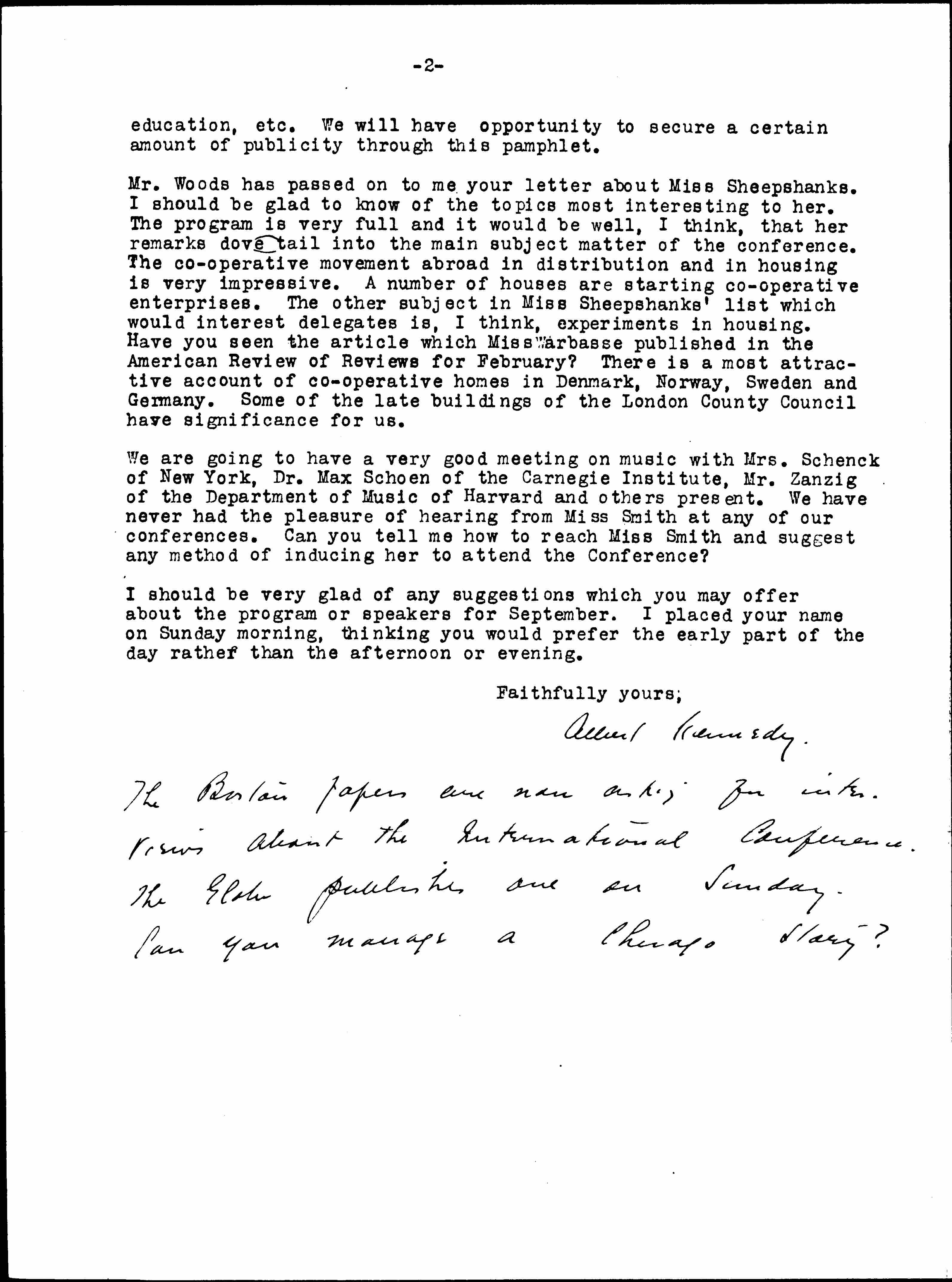 Mr. Woods has passed on to me your letter about Miss Sheepshanks. I should be glad to know of the topics most interesting to her. The program is very full and it would be well, I think, that her remarks dovetail into the main subject matter of the conference. The [cooperative] movement abroad in distribution and in housing is very impressive. A number of houses are starting [cooperative] enterprises. The other subject in Miss Sheepshanks' list which would interest delegates is, I think, experiments in housing. Have you seen the article which Miss Warbasse published in the American Review of Reviews for February? There is a most attractive account of [cooperative] homes in Denmark, Norway, Sweden and Germany. Some of the late buildings of the London County Council have significance for us.
