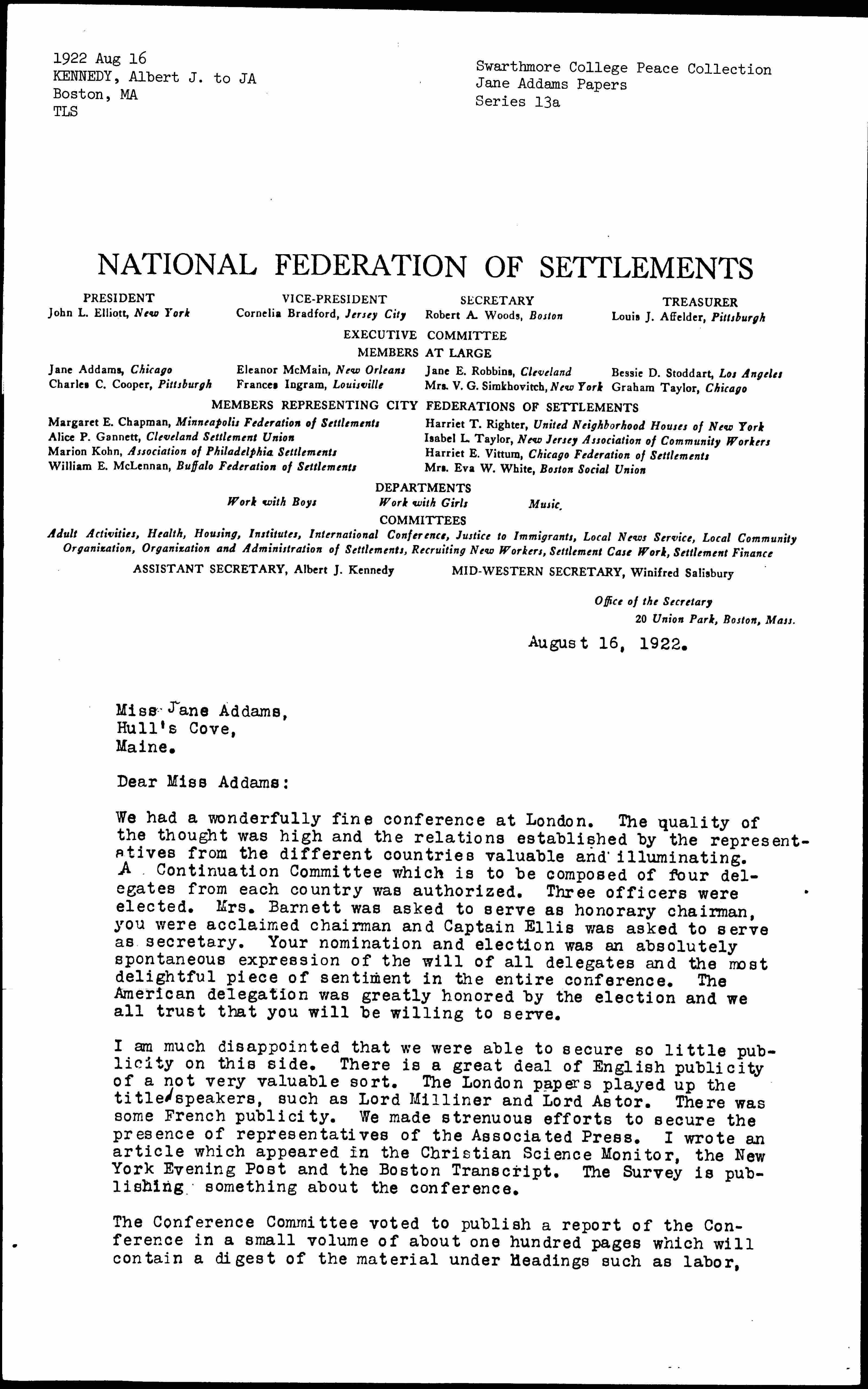 We had a wonderfully fine conference at London. The quality of the thought was high and the relations established by the representatives from the different countries valuable and illuminating. A Continuation Committee which is to be composed of four delegates from each country was authorized. Three officers were elected. Mrs. Barnett was asked to serve as honorary chairman, you were acclaimed chairman and Captain Ellis was asked to serve as secretary. Your nomination and election was an absolutely spontaneous expression of the will of all delegates and the most delightful piece of sentiment in the entire conference. The American delegation was greatly honored by the election and we all trust that you will be willing to serve.