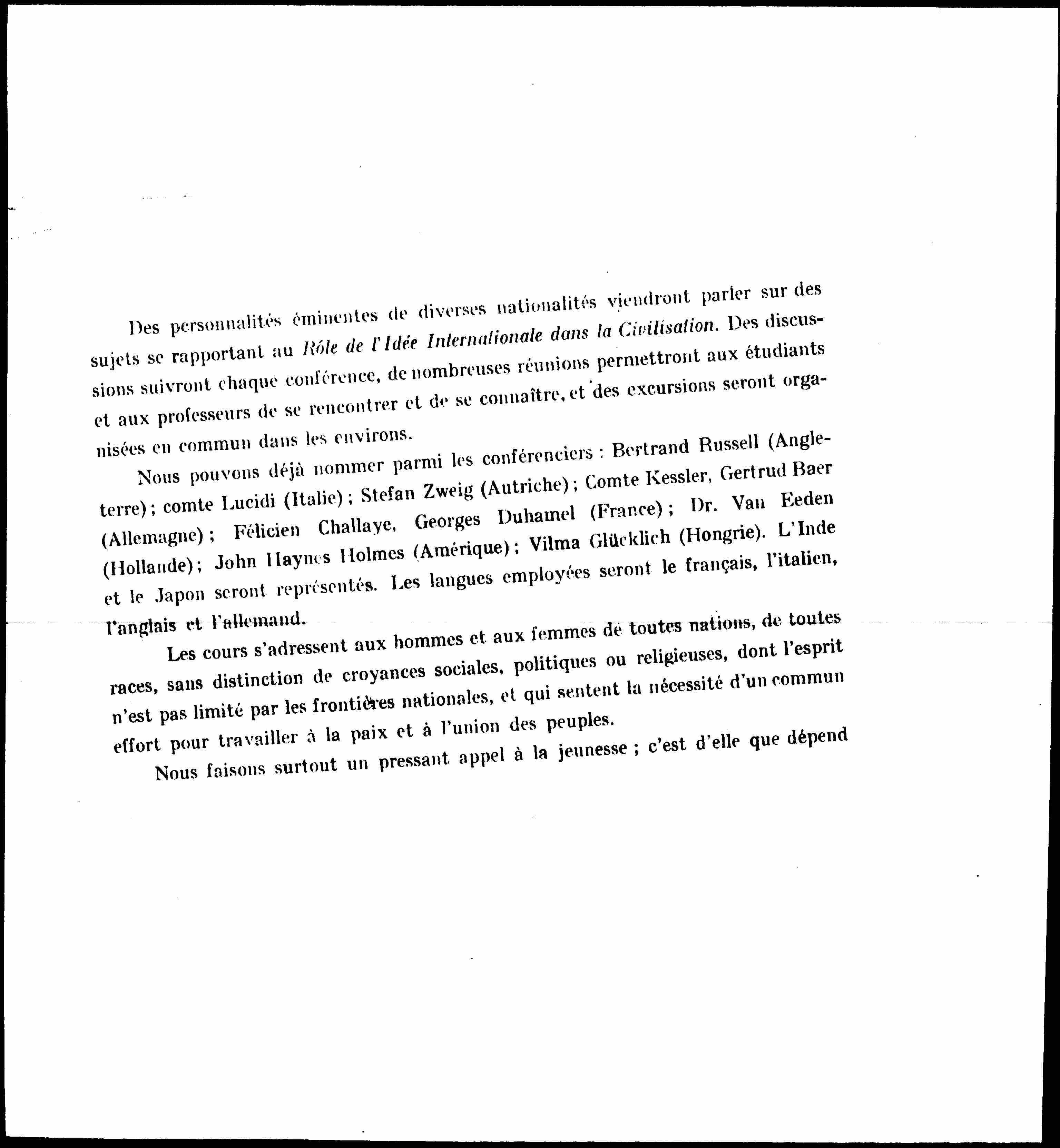 We can already name among the speakers: Bertrand Russell (England); Count Lucidi (Italy); Stefan Zweig (Austria); Count Kessler, Gertrud Baer (Germany); Felicien Challaye, Georges Duhamel (France); Dr. Van Eeden (Holland); John Haynes Holmes (America); Vilma Glücklich (Hungary). India and Japan will be represented. The languages used will be French, Italian, English and German.