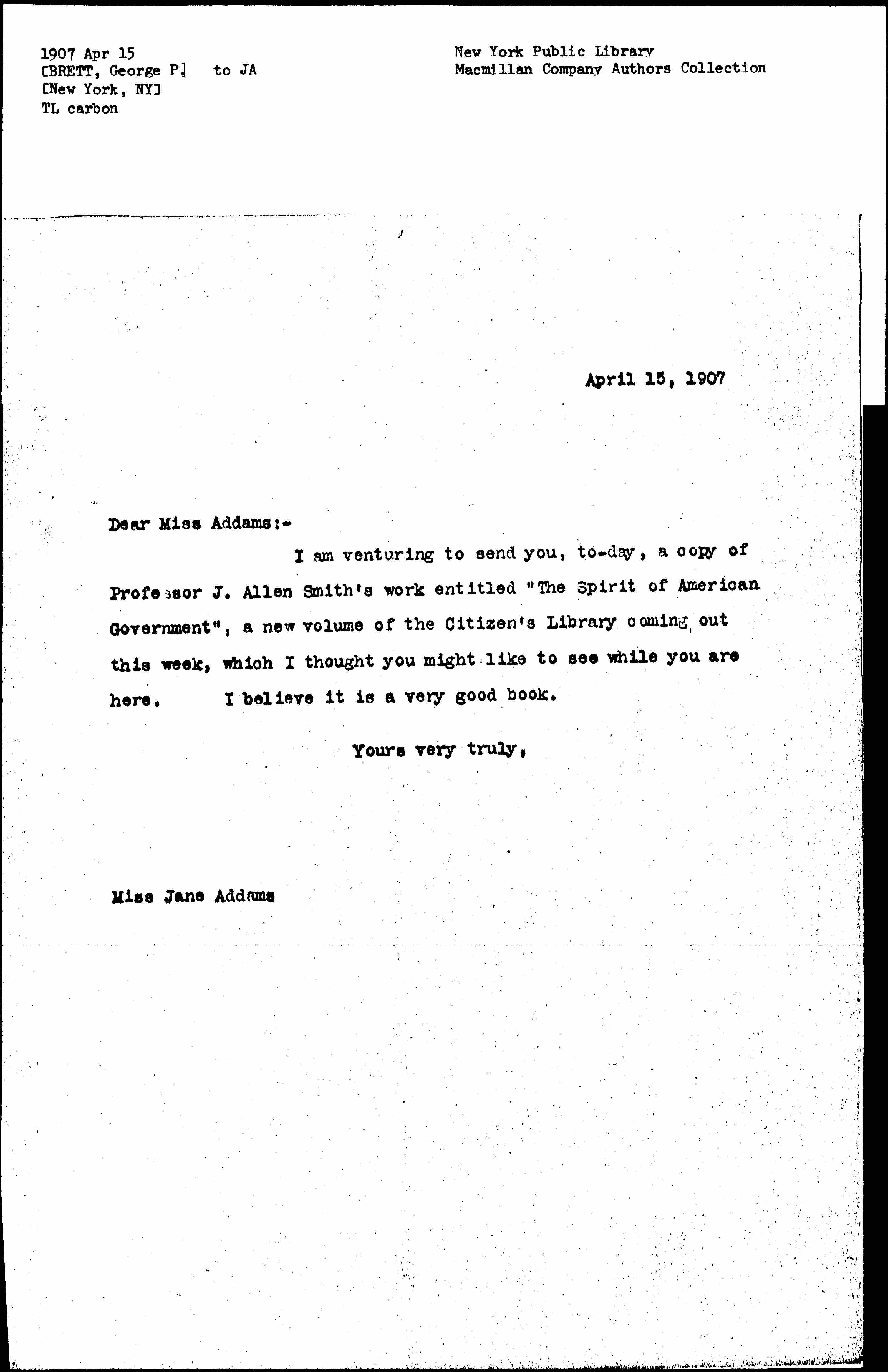 I am venturing to send you, [today], a copy of Professor J. Allen Smith's work entitled "The Spirit of American Government", a new volume of the Citizen's Library coming out this week, which I thought you might like to see while you are here. I believe it is a very good book.