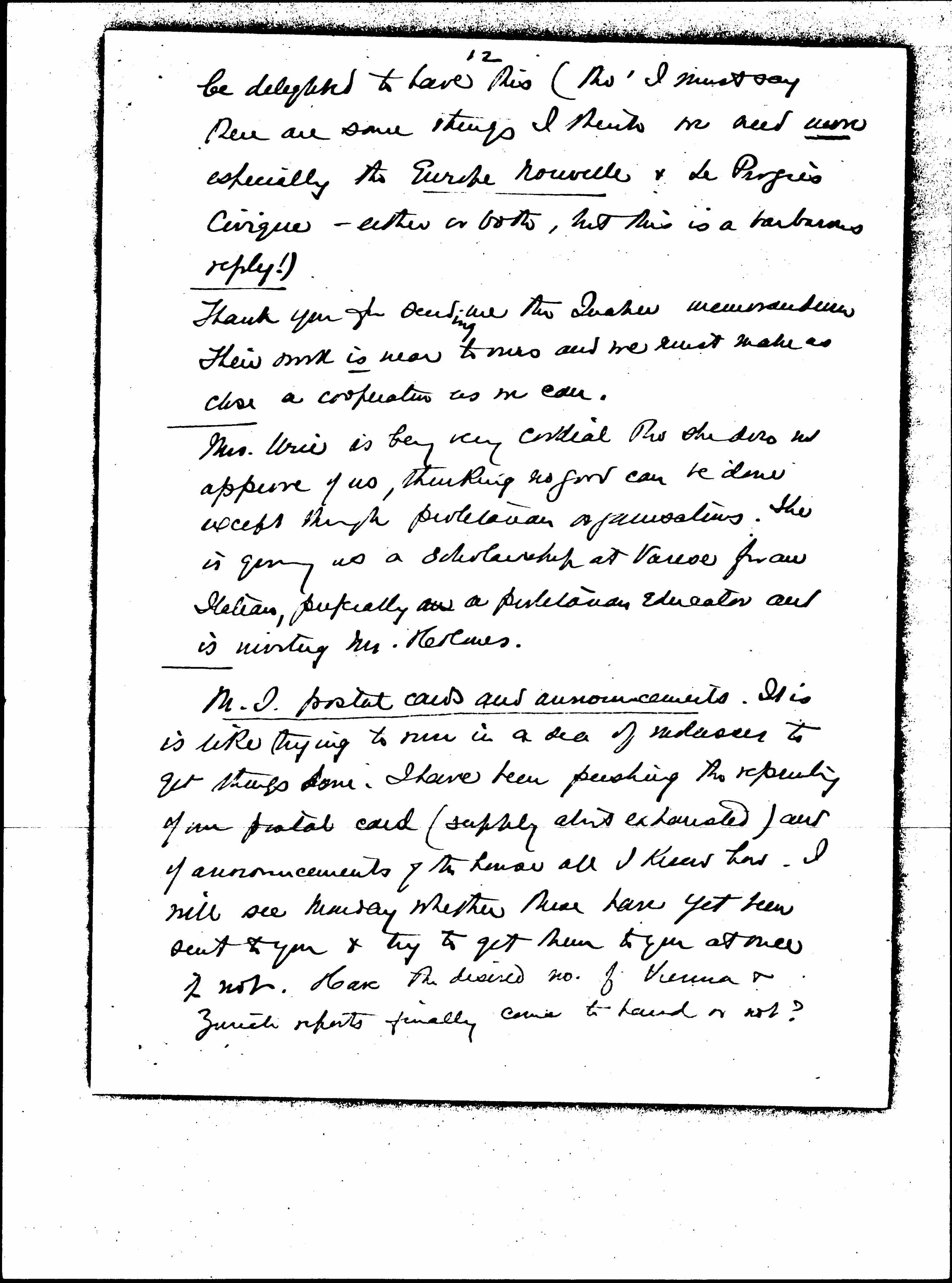 M.I. postal cards and announcements. It is like trying to run in a sea of molasses to get things done. I have been pushing the reprinting of our postal card (supply about exhausted) and of announcements of the house all I know how. I will see Monday whether those have yet been sent to you & try to get them to you at once if not. Have the desired no. of Vienna & Zurich reports finally come to hand or not? [page 13] Have you now received the copies of the Zurich and Vienna reports Miss Wössner sent?