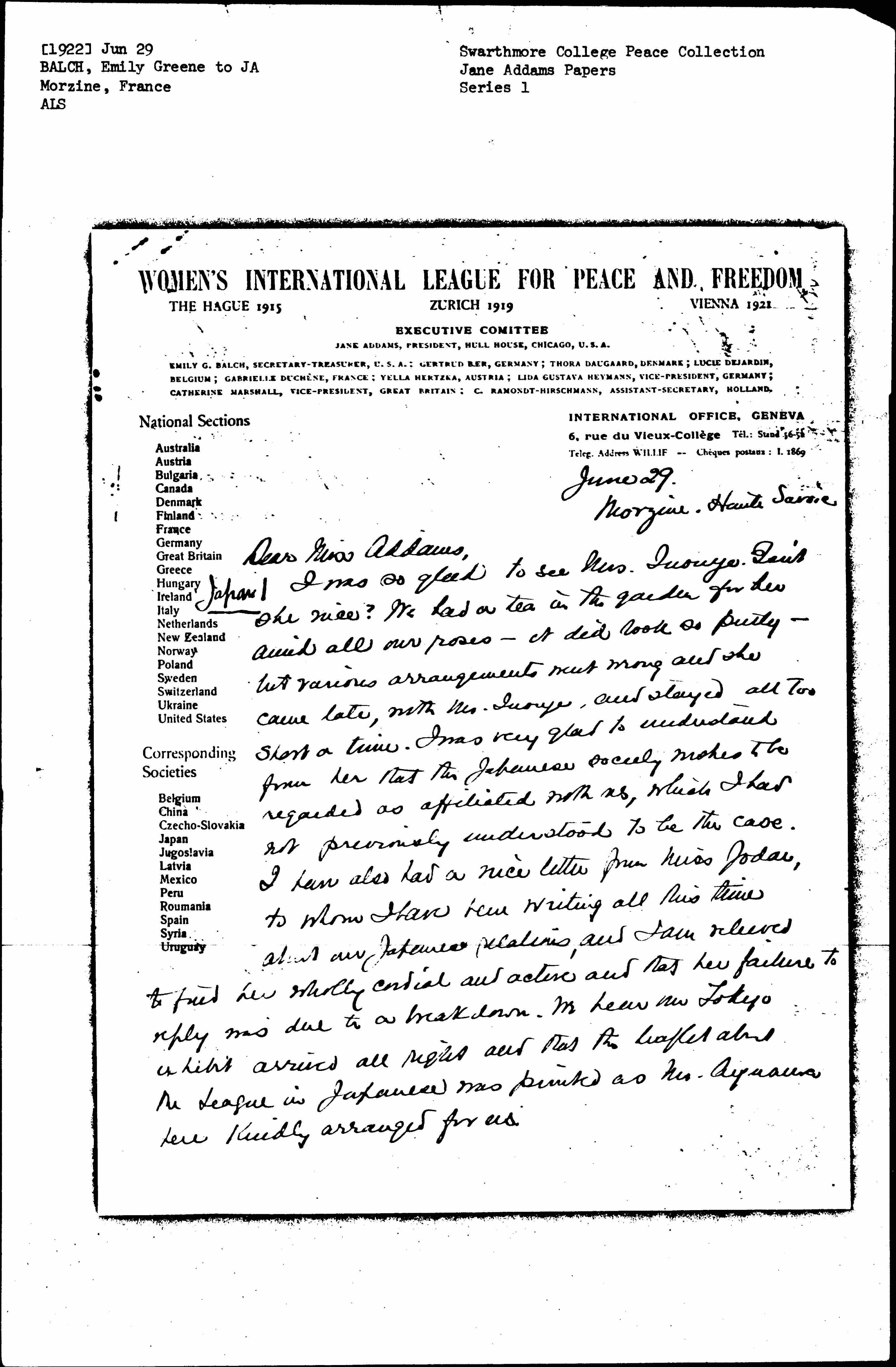 I was so glad to see Mrs. Inouye. Isn't she nice? We had a tea in the garden for her amid all our roses -- it did look so pretty -- but various arrangements went wrong and she came late, with Mr. Inouye, and stayed all too short a time. I was very glad to understand from her that the Japanese society wishes to be regarded as affiliated with us, which I had not previously understood to be the case. I have also had a nice letter from Miss Jōdai, to whom I have been writing all this time about our Japanese relations, and I am relieved to find her wholly cordial and active and that her failure to reply was due to a breakdown. We hear our Tokyo exhibit arrived all right and that the leaflet about the League in Japanese was printed as Mr. Ayusawa here kindly arranged for us. [page 2]