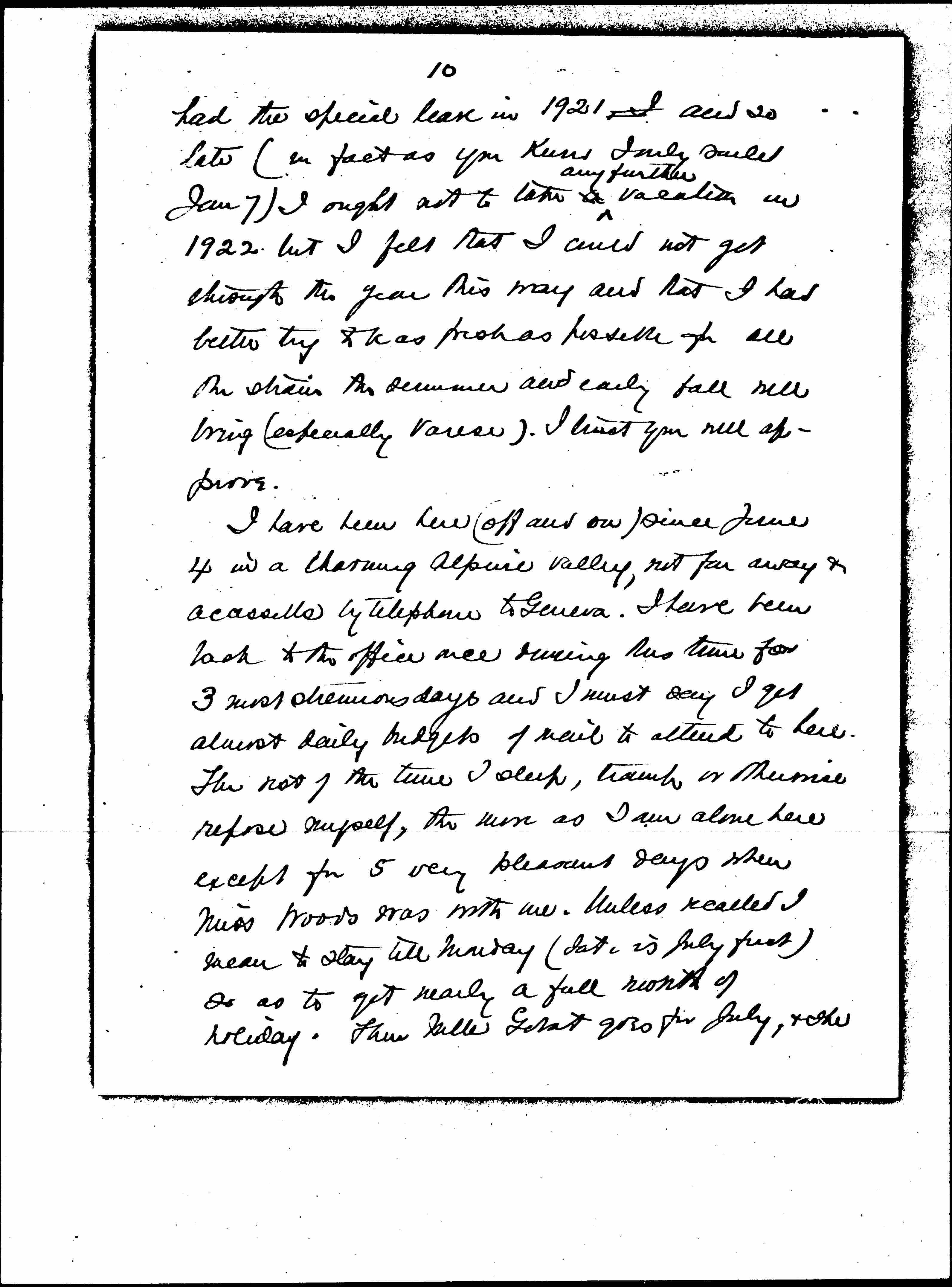 I have been here (off and on) since June 4 in a charming Alpine valley, not far away & [accessible] by telephone to Geneva. I have been back to the office once during this time for 3 most strenuous days and I must say I get almost daily budgets of mail to attend to here. The rest of the time I sleep, tramp or otherwise refresh myself, the more as I am alone here except for 5 very pleasant days when Miss Woods was with me. Unless recalled I mean to stay till Monday (date is July first) so as to get nearly a full month of holiday. Thus Mlle Gobat goes for July, & she [page 11] will carry on in Geneva in August when I shall be in Varese part of the time at least.