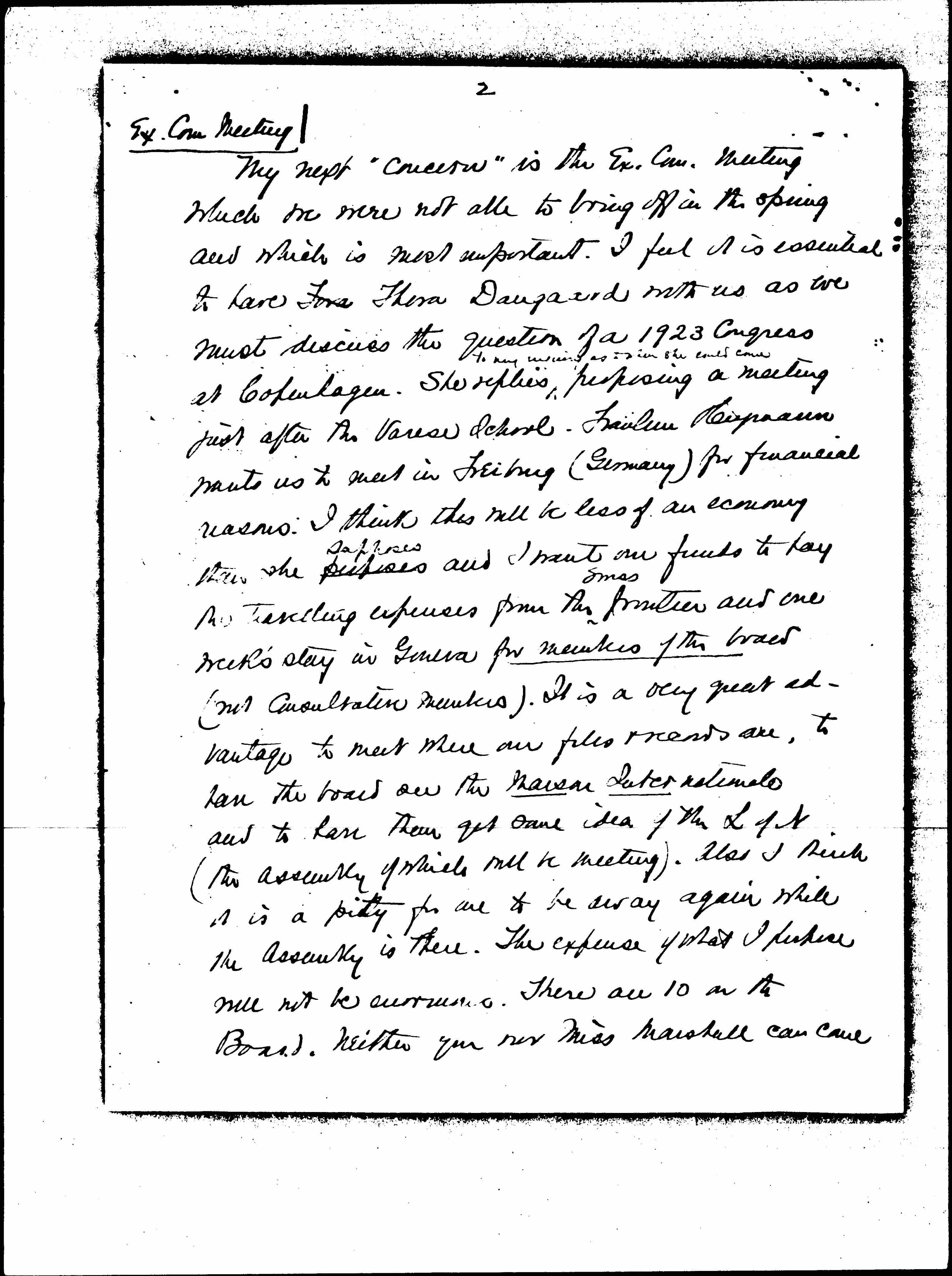 My next "concern" is the Ex. Com. Meeting which we were not able to bring off in the spring and which is most important. I feel it is essential to have Thora Daugaard with us as we must discuss the question of a 1923 Congress at Copenhagen. She replies ↑to [my questions?] as to when she could come↓ proposing a meeting just after the Varese School. Fräulein Heymann wants us to meet in Freiburg (Germany) for financial reasons. I think this will be less of an economy than she proposes ↑supposes↓ and I want our funds to pay the [traveling] expenses from the ↑Swiss↓ frontier and one week's stay in Geneva for members of the board (not consultative members). It is a very great advantage to meet where our files & records are, to have the board see the Maison Internationale and to have them get some idea of the L of N (the assembly of which will be meeting). Also I think it is a pity for one to be away again while the Assembly is there. The expense of what I propose will not be enormous. There are 10 on the Board. Neither you nor Miss Marshall can come [page 3] and I am there anyway. I think Madame Duchêne would not accept and perhaps some others the same so it is a question of ↑at most↓ six people. We can take care of a number in the M.I. (though of course this is also an expense for which the League would pay the M.I. account). I hope you will not disapprove. Fräulein Heymann is absolutely unwilling to have her expenses paid so this in itself may upset this plan. I have written to her about it but have not made the proposal to anyone else yet.