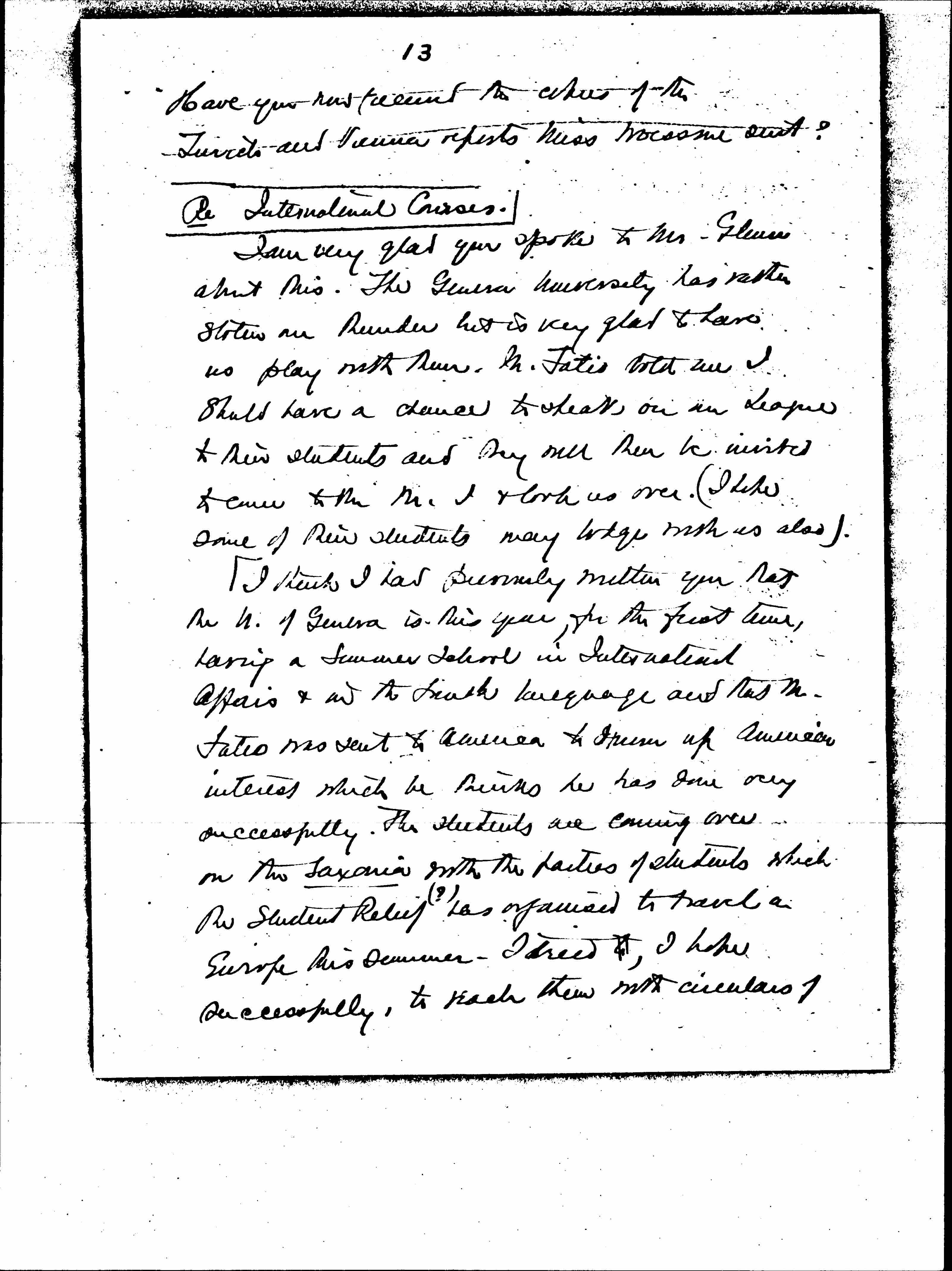 I think I had [personally] written you that the U. of Geneva is this year, for the first time, having a Summer School in International Affairs & in the French language and that M. Fatio was sent to America to [drum?] up American interest which he thinks he has done very successfully. The students are coming over on the Saxonian with the parties of students which the Student Relief ↑(?)↓ has [organized] to travel in Europe this summer. I tried to, I hope successfully, to reach them with circulars of [page 14] our two Summer Schools.