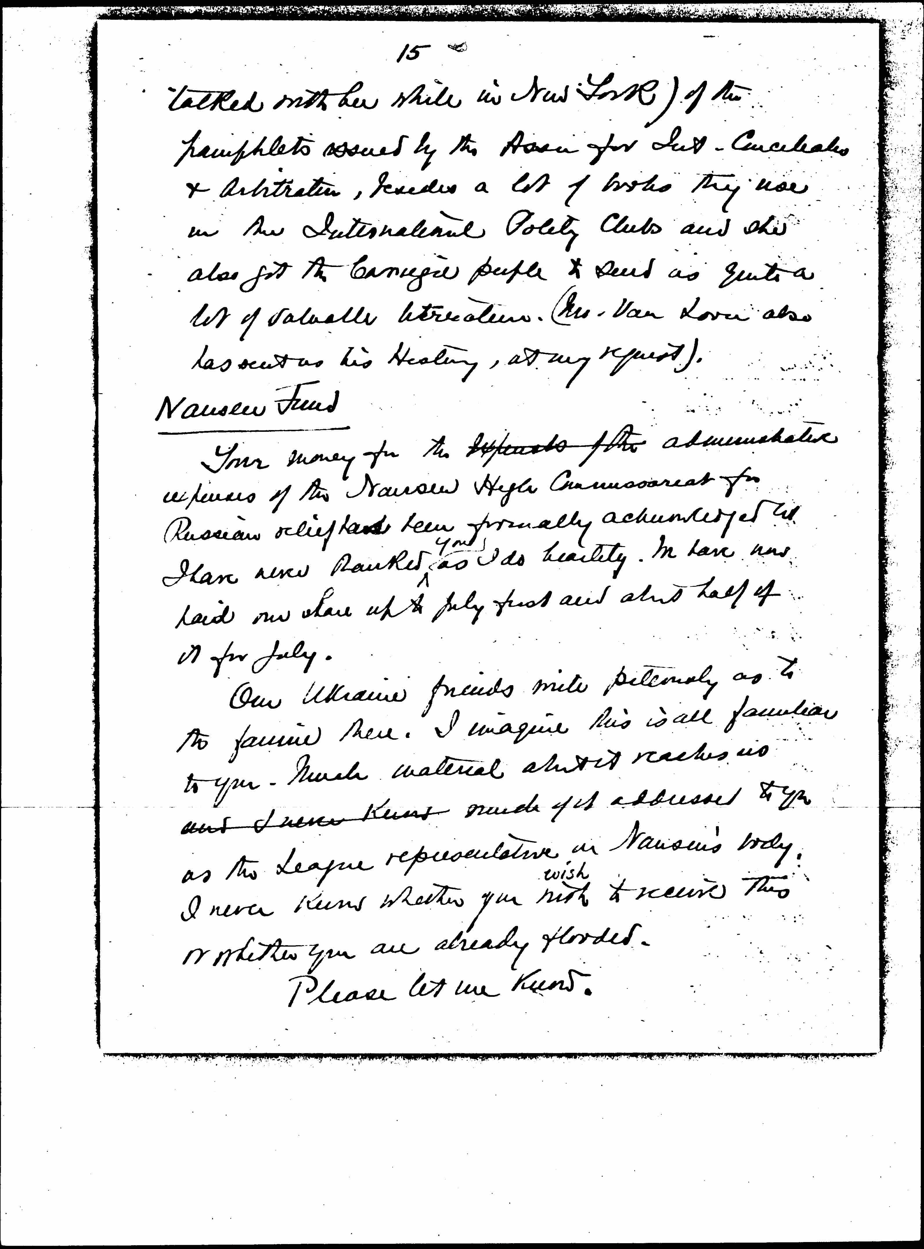 Miss Alexander has been very kind & has sent me 10 [illegible] sets for use here in international classes (about which I [page 15] talked with her while in New York) of the pamphlets issued by the Assn for Int. Conciliation & Arbitration, besides a lot of books they use in the International Polity Club and she also got the Carnegie people to send us quite a lot of valuable literature. (Mr. van Loon also has sent us his History, at my request).