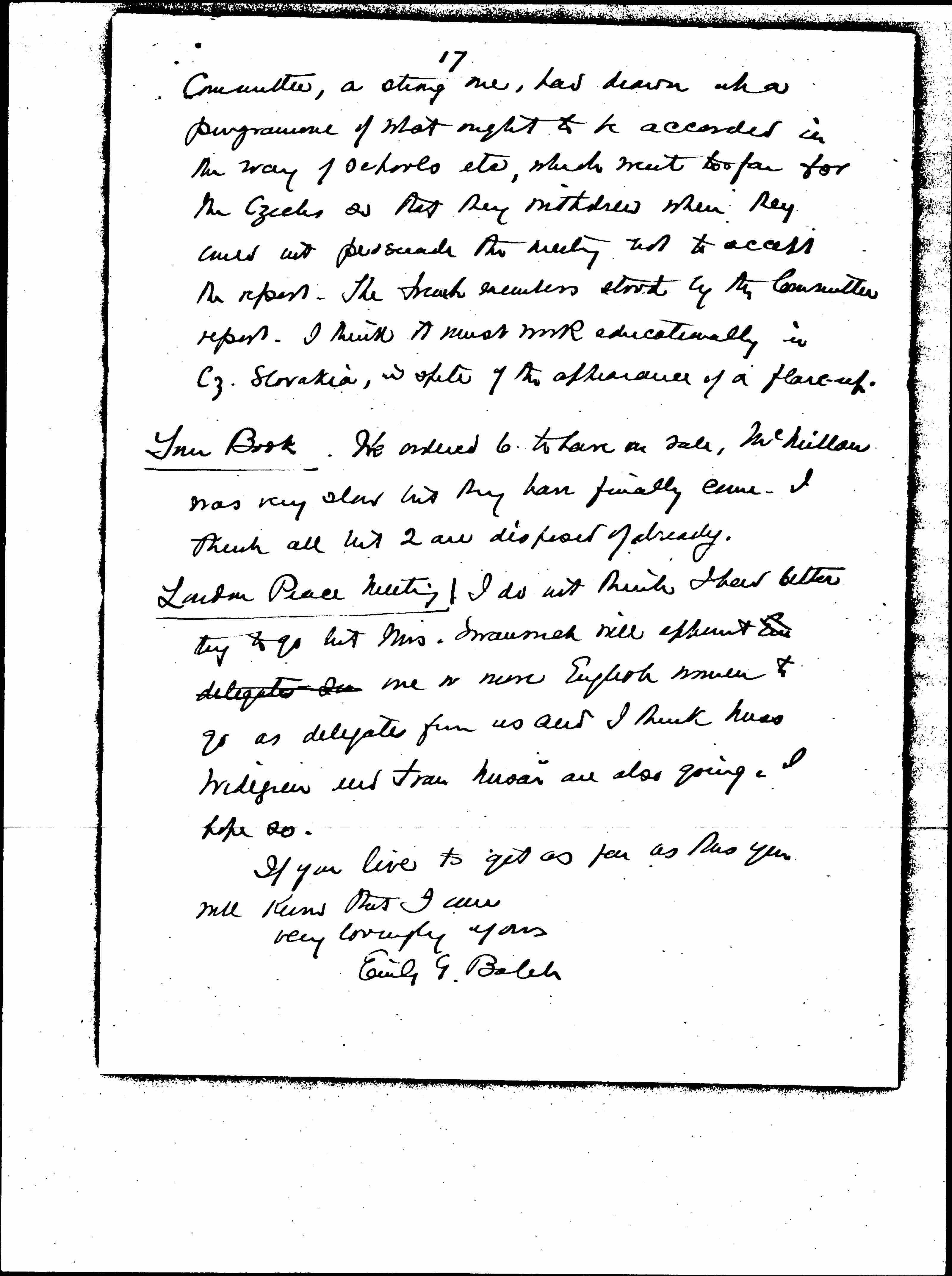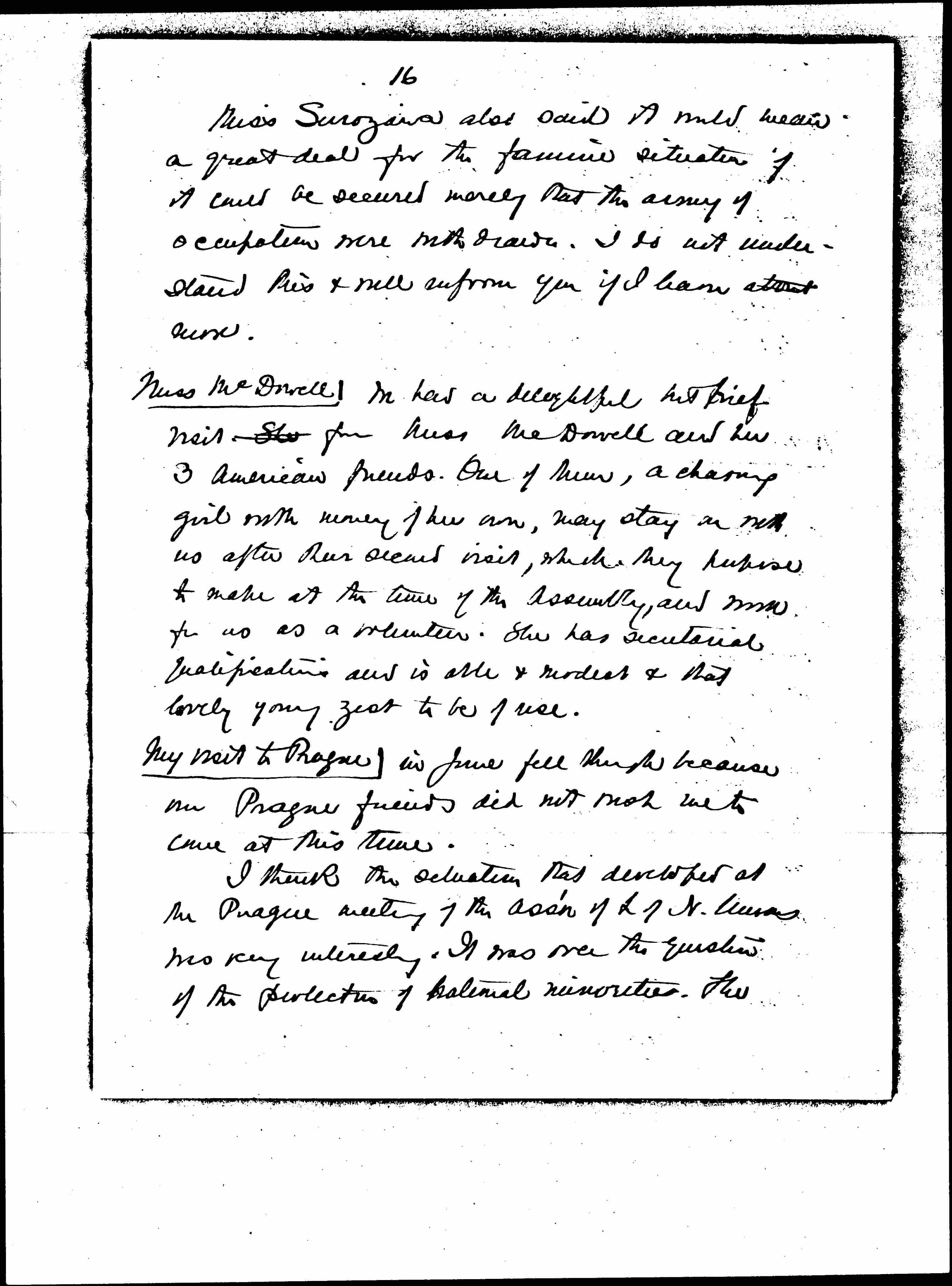I think the situation that developed at the Prague meeting of the ass'n of L of N. Unions was very interesting. It was over the question of the protection of potential minorities. The [page 17] Committee, a strong one, had drawn up a [program] of what ought to be accorded in the way of schools etc, which went too far for the Czechs so that they withdrew when they could not persuade the meeting not to accept the report. The French members stood by the Committee report. I think it must work educationally in [Czechoslovakia], in spite of the appearance of a flare-up.