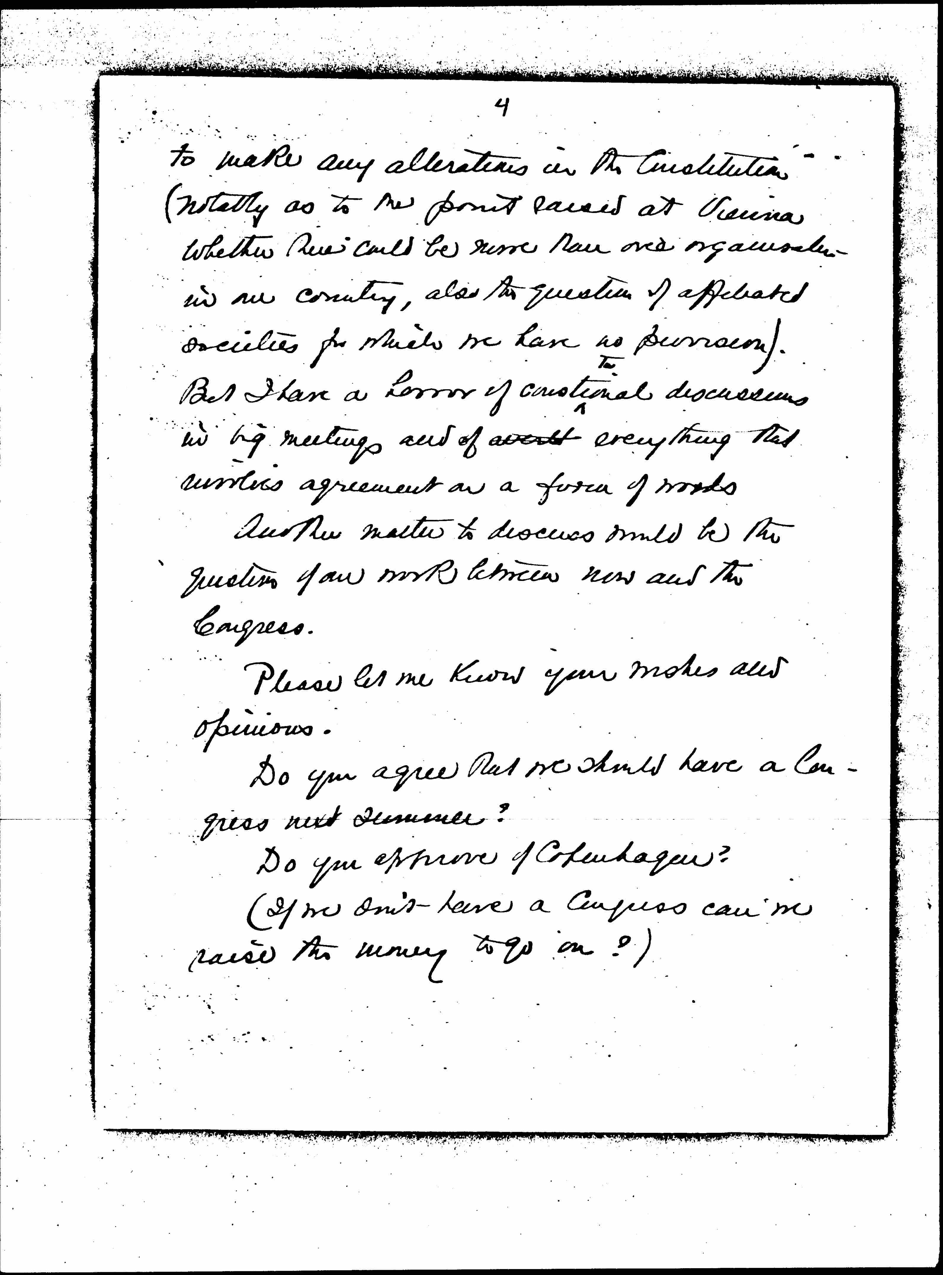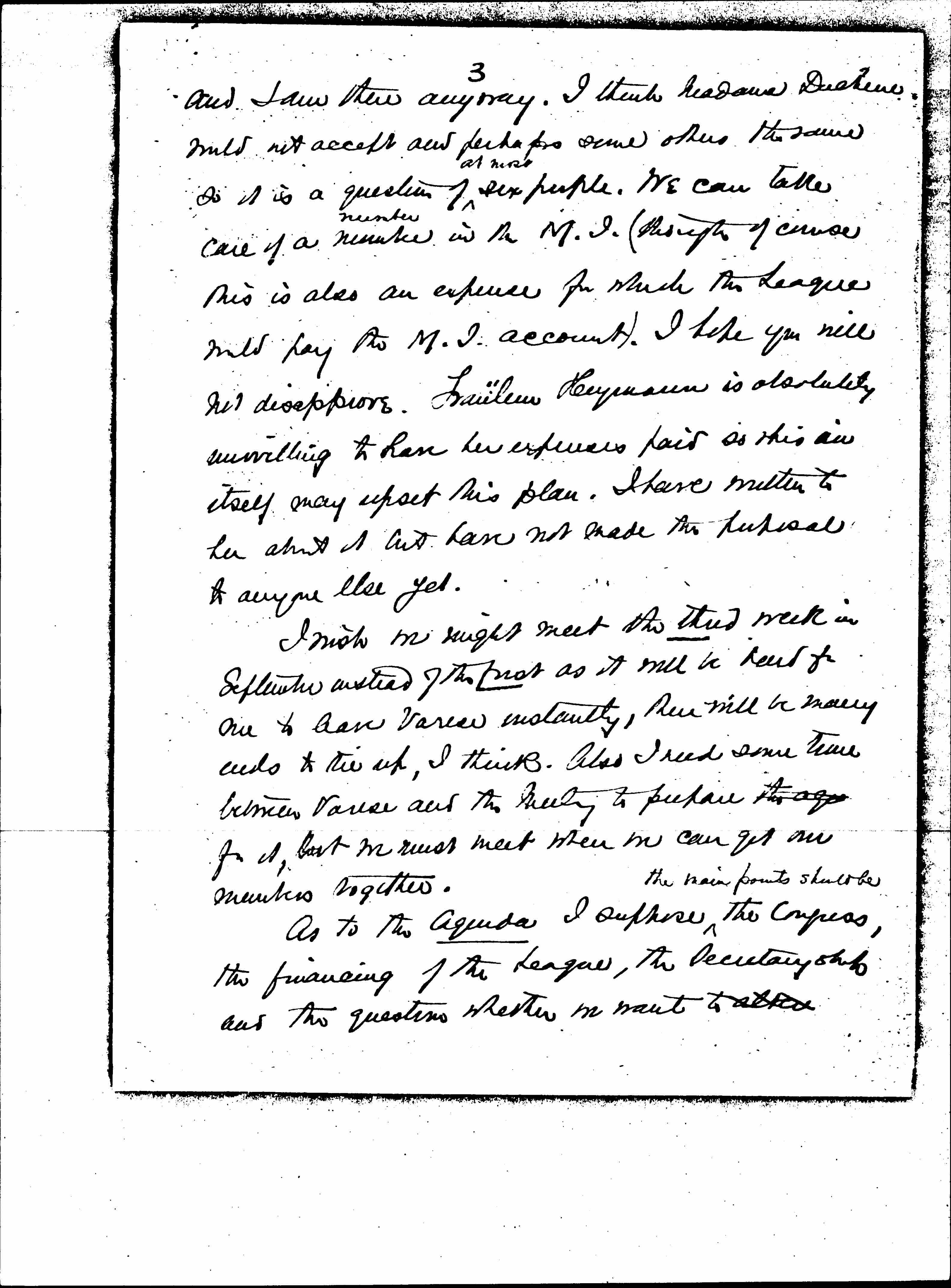 As to the Agenda I suppose ↑the main points should be↓ the Congress, the financing of the League, the secretaryship and the question whether we want to alter [page 4] to make any alterations in the Constitution (notably as to the point raised at Vienna whether there could be more than one [organization] in our country, also the question of affiliated societies for which we have no provision). But I have a horror of constitutional discussions in big meetings and of [illegible] everything that involves agreement or a form of words.