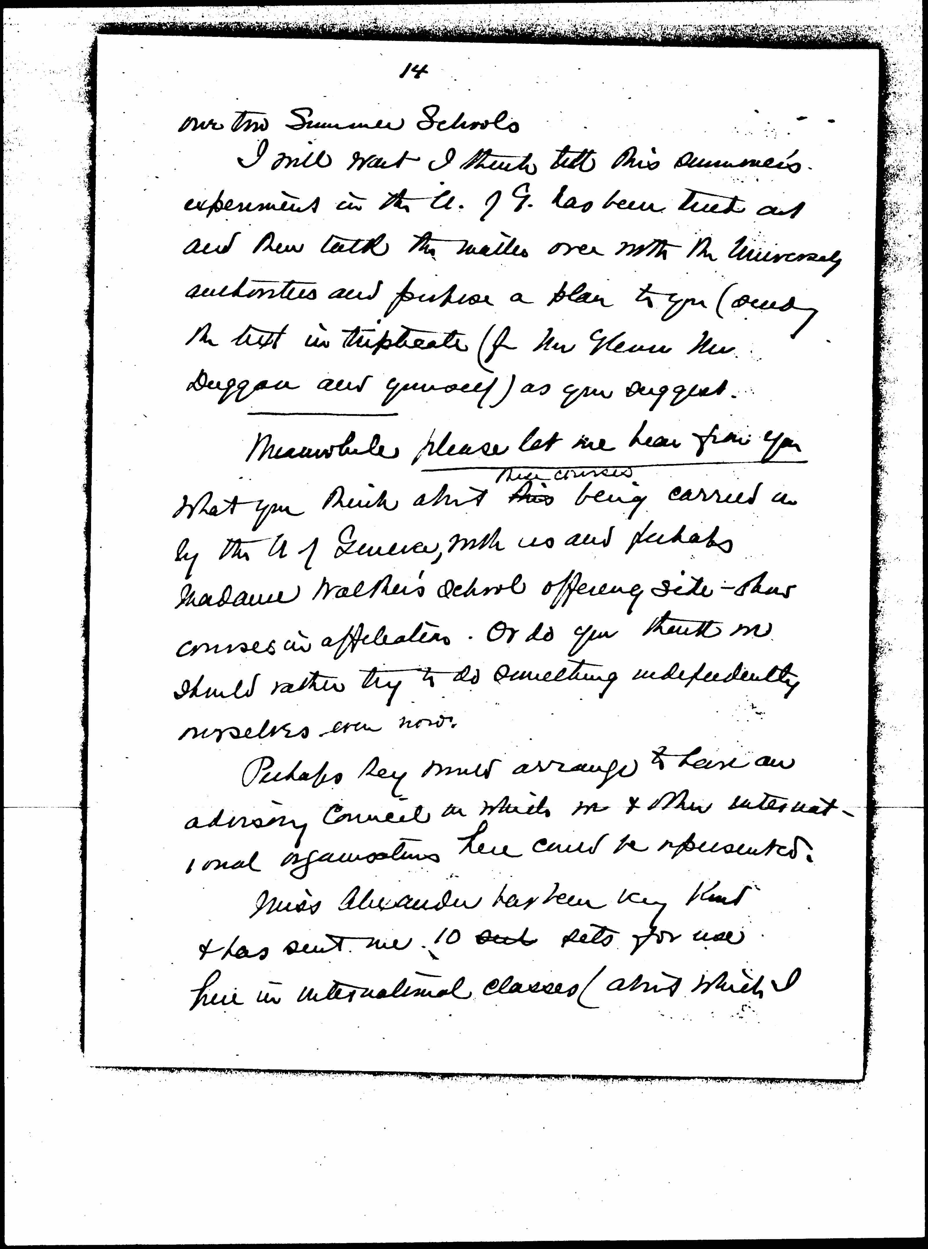 Meanwhile please let me hear from you what you think about this ↑their courses↓ being carried on by the U of Geneva, with us and perhaps Madame Walther's school offering site -- & has courses in affiliation. Or do you think we should rather try to do something independently ourselves even now?