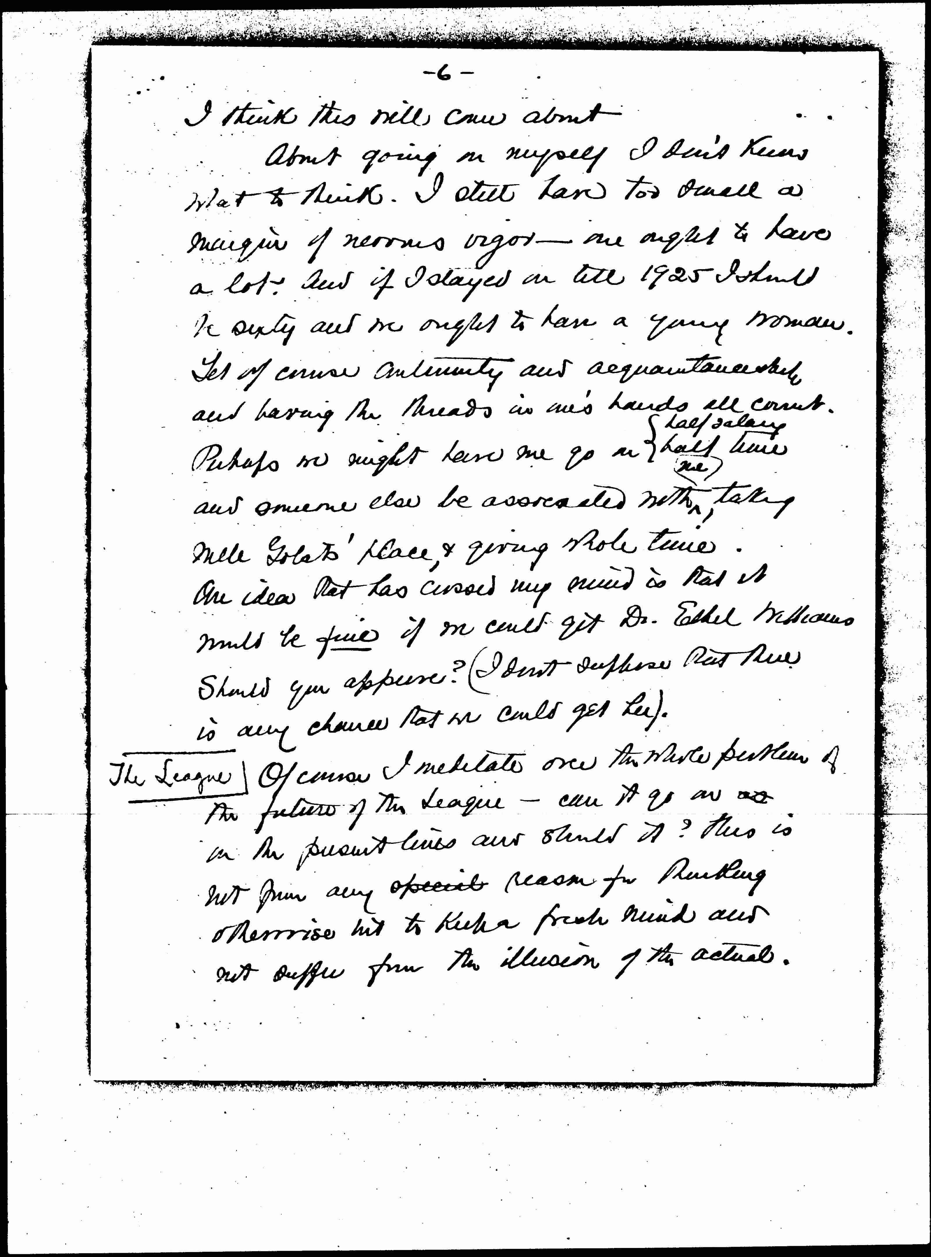 About going on myself I don't know what to think. I still have too small a margin of nervous vigor -- one ought to have a lot. And if I stayed on till 1925 I should be sixty and we ought to have a young woman. Yet of course continuity and acquaintanceship and having the threads in one's hands all count. Perhaps we may have me go on ↑half salary↓ half time and someone else be associated with ↑me↓ taking Mlle Gobat's place, & giving whole time. One idea that has crossed my mind is that it would be fine if we could get Dr. Ethel Williams should you approve? (I don't suppose that there is any chance that we could get her).