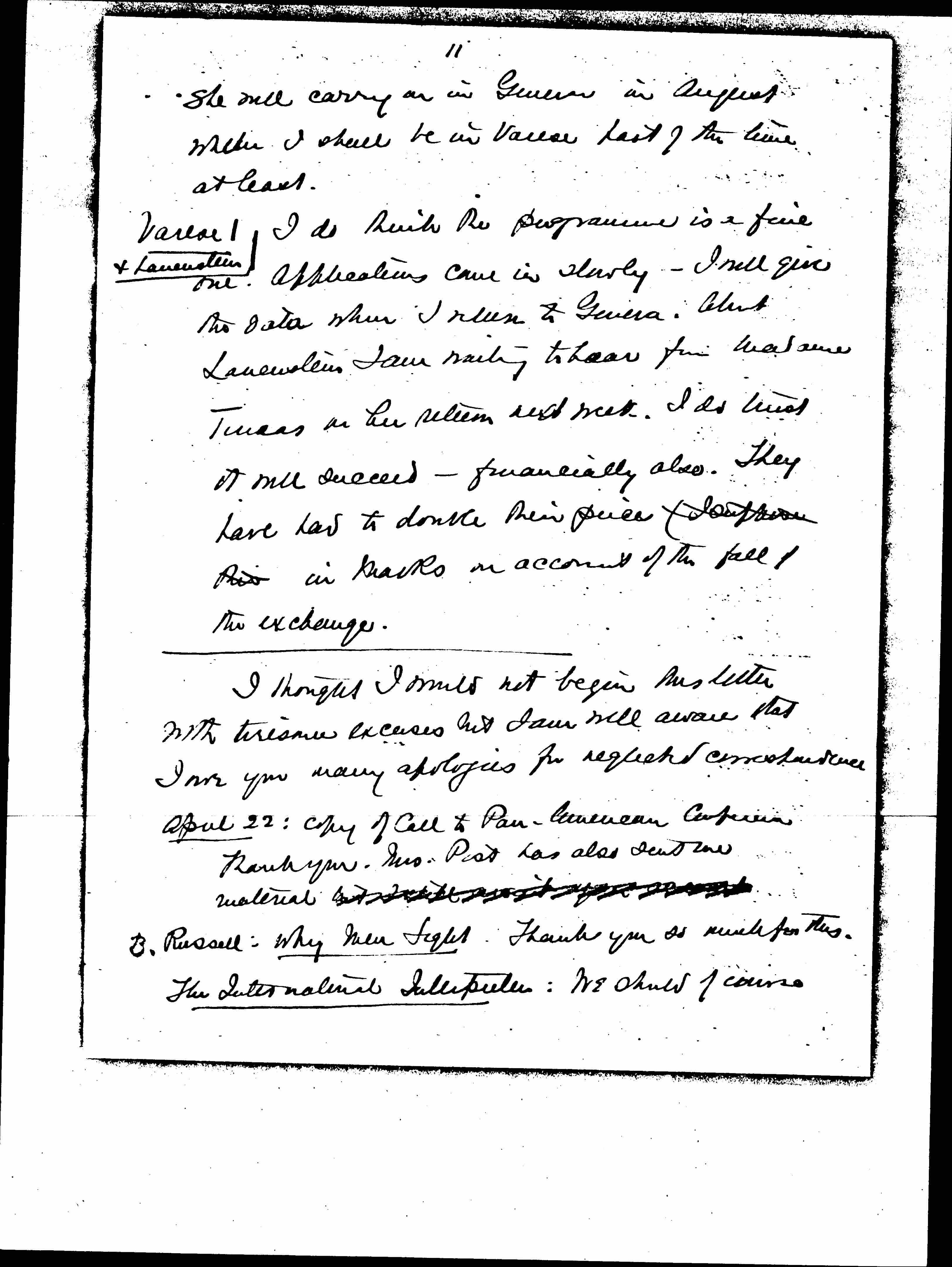 Of course I meditate over the whole problem of the future of the League -- can it go on as in the present lines and should it? This is not from any special reason for thinking otherwise but to keep a fresh mind and not suffer from the illusion of the actual. [page 7] Can we continue to support it? The British W.I.L. is ↑in↓ debt & has the greatest financial difficulties, increased by the fact that it lost money in its Easter School at Keswick by which it hoped to raise [illegible] ↑some↓. The low valuta countries cannot help. The small neutrals can't do much. It pretty much comes back on the U.S.