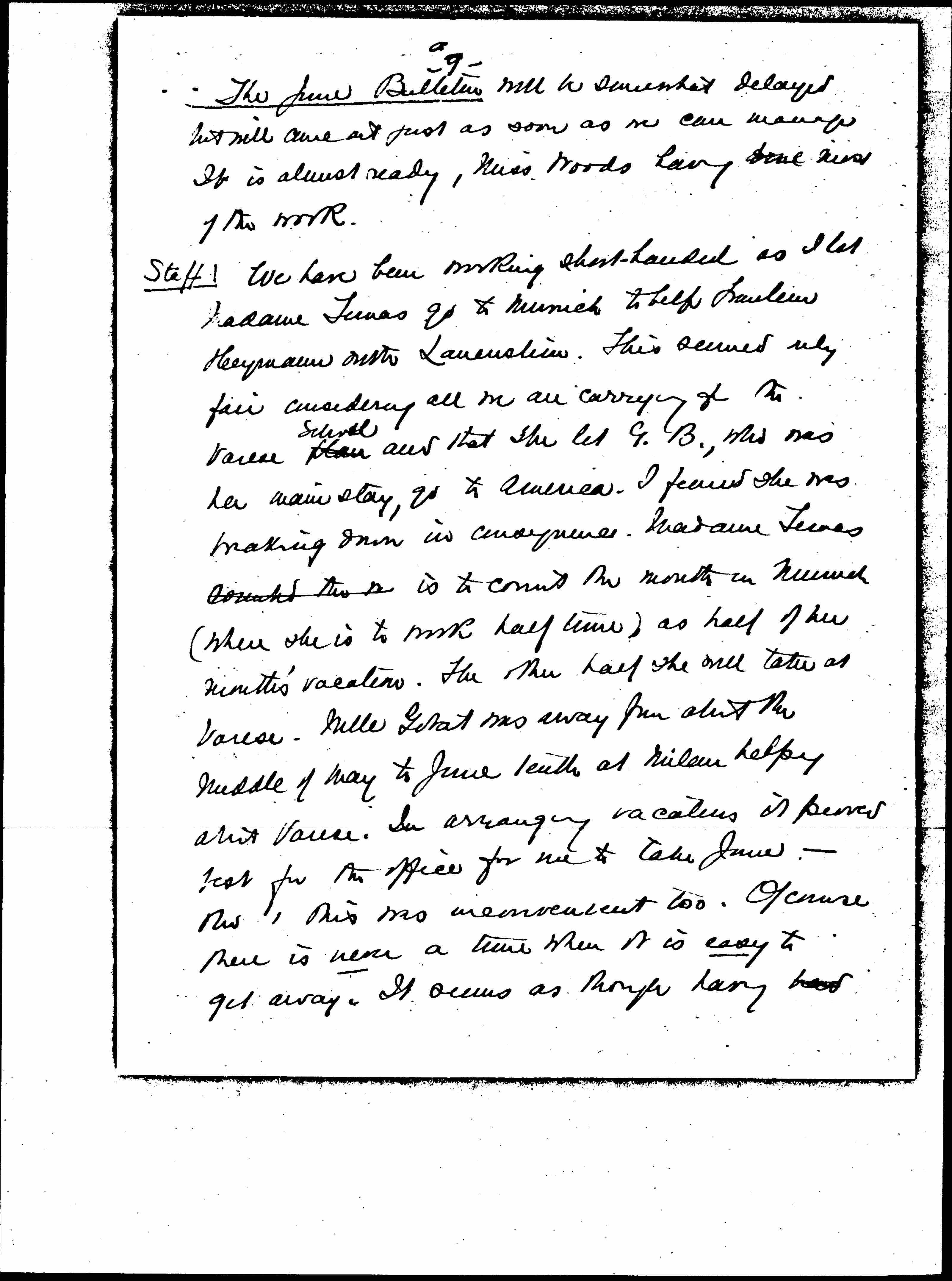 We have been working short-handed as I let Madame Tunas go to Munich to help Fraulein Heymann with Lauenstein. This seemed only fair considering all we are carrying for the Varese plan ↑School↓ and that she let G. B., who was her mainstay, go to America. I feared she was breaking down in consequence. Madame Tunas counted the [illegible] is to count the month in Munich (where she is to work half time) as half of her month's vacation. The other half she will take at Varese. Mlle Gobat was away from about the middle of May to June tenth at Milan [helping?] about Varese. In arranging vacations it proved best for the office for me to take June -- [though], this was inconvenient too. Of course there is never a time when it is easy to get away. It seems as though having had [page 10] had the special leave in 1921 I and so late (in fact as you know I only sailed Jan 7) I ought not to take a ↑any further↓ vacation in 1922 but I felt that I could not get through the year this way and that I had better try to be as fresh as possible for all the strain the summer and early fall will bring (especially Varese). I trust you will approve.