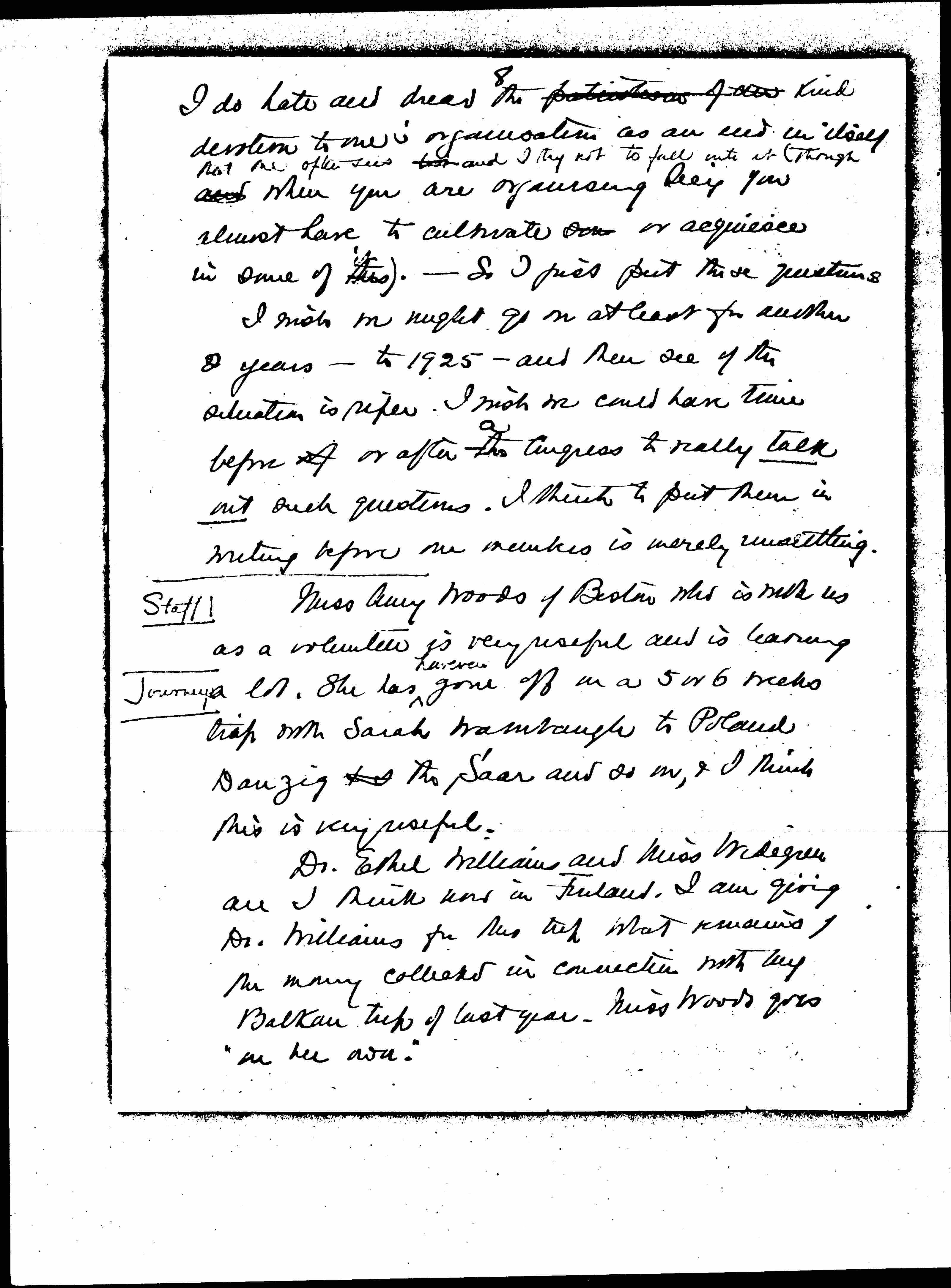 Dr. Ethel Williams and Miss Widegren are I think now in Finland. I am giving Dr. Williams for this trip what remains of the money collected in connection with my Balkan trip of last year -- Miss Woods goes "on her own." [page 9]