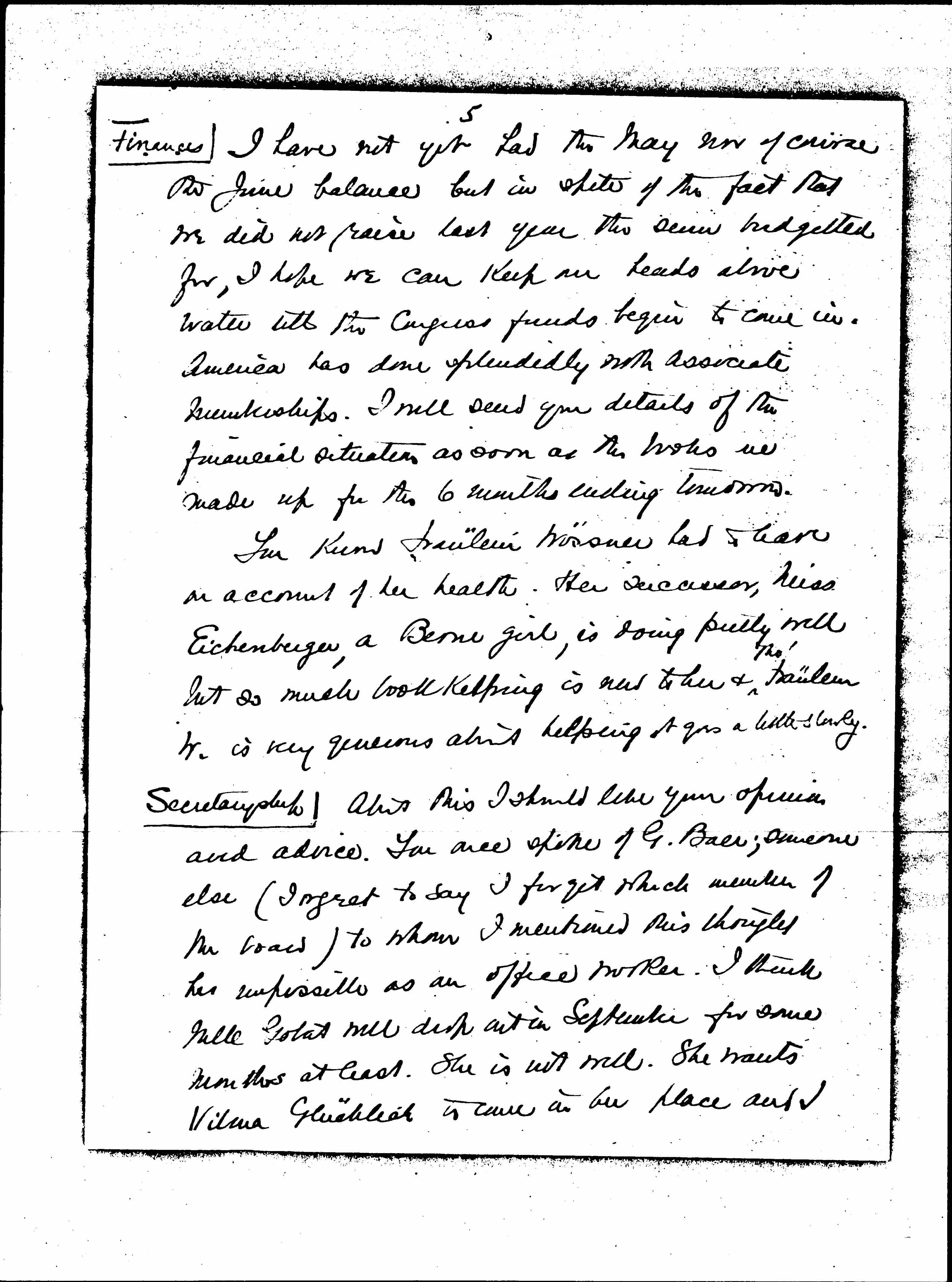 About this I should like your opinion and advice. You once spoke of G. Baer; someone else (I regret to say I forget which member of the board) to whom I mentioned this thought her impossible as an office worker. I think Mlle Gobat will drop out in September for some months at least. She is not well. She wants Vilma Glücklich to come in her place and I [page 6] think this will come about.