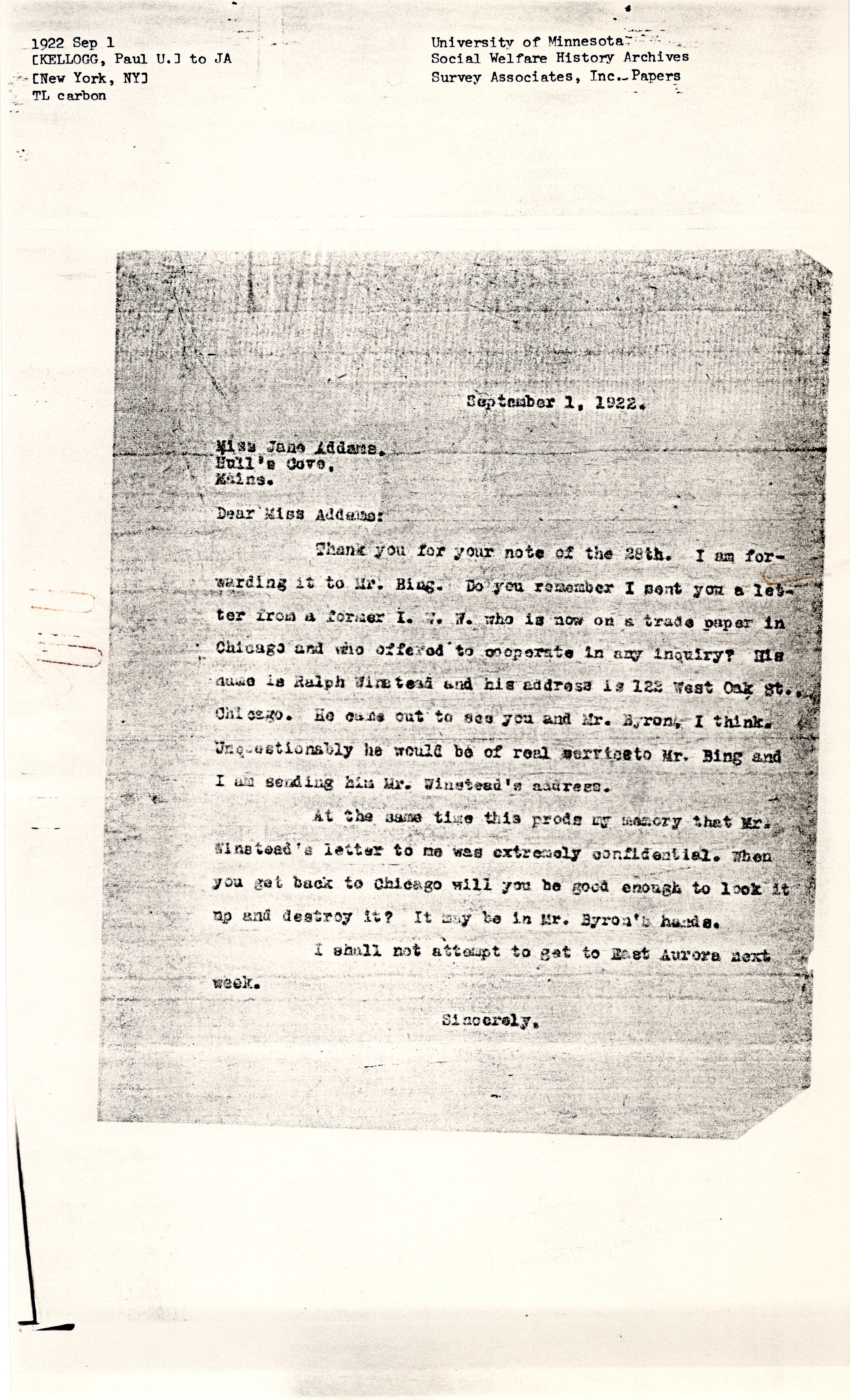 Thank you for your note of the 28th. I am forwarding it to Mr. Bing. Do you remember I sent you a letter from a former I.W.W. who is now on a trade paper in Chicago and who offered to cooperate in any inquiry? His name is Ralph Winstead and his address is 122 West Oak St., Chicago. He came out to see you and Mr. Byron, I think. Unquestionably he would be of real service to Mr. Bing and I am sending him Mr. Winstead's address.