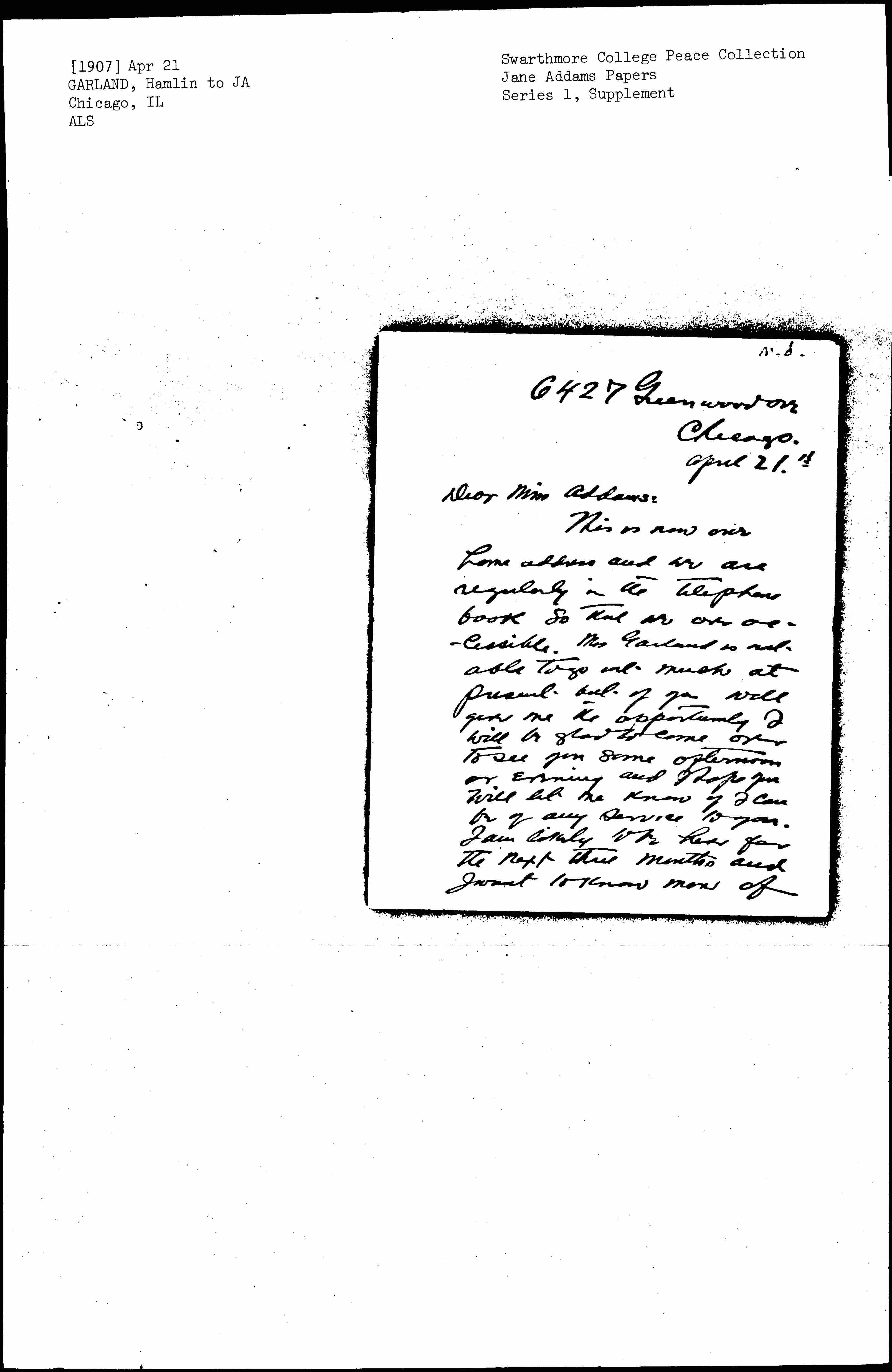 This is now our home address and we are regularly in the telephone book so that we are accessible. Mrs Garland is not able to go out much at present but if you will give me the opportunity I will be glad to come over to see you some afternoon or evening and I hope you will let me know if I can be of any service to you. I am likely to be here for the next three months and I want to know more of [page 2] what you are doing. It has been some years since I visited Hull House. I don't at present understand how this has happened -- except that I have been living either in the East or in West Salem and living with some difficulty. It is from no lack of interest in the work you are doing. I want to know especially about your newer ventures dramatic and other.