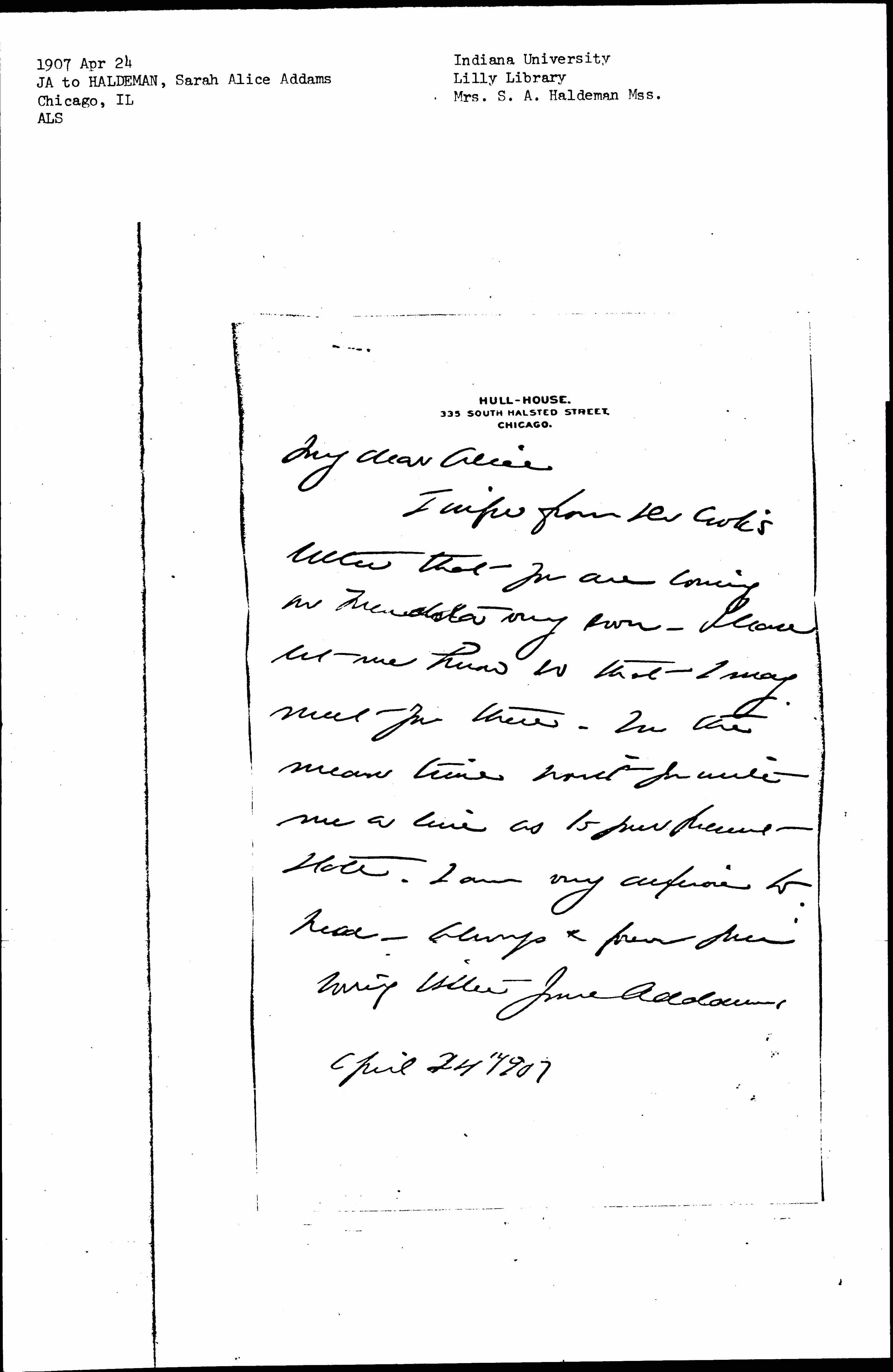 I infer from Dr Cook's letter that you are coming on Mendota very soon. Please let me know so that I may meet you there. In the mean time won't you write me a line as to your present state. I am very anxious to hear-- Always & forever your loving sister Jane Addams.